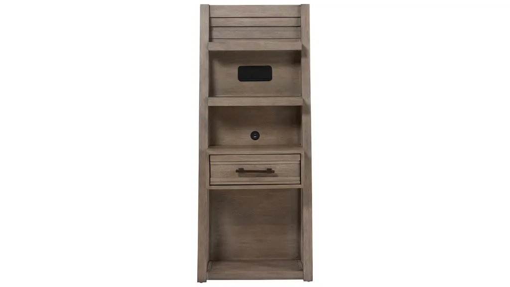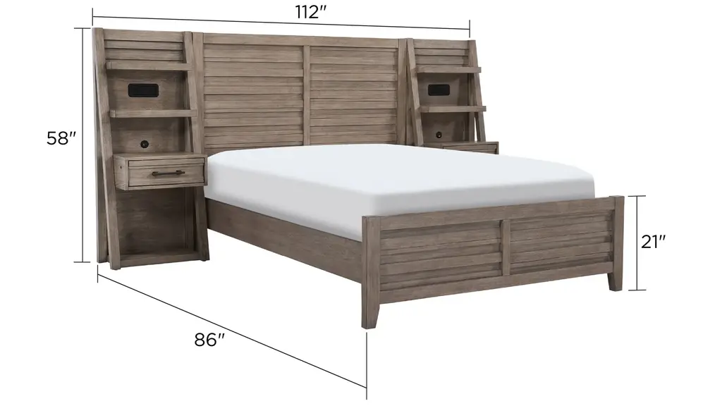 Rustic charm meets modern edge in the Clouston Wall Bed with pier nightstands. Designed with a warm finish, horizontal stacked banding, and antiqued metal drawer pulls, it brings a fresh, laid-back vibe to your home. Two fixed shelves and a drawer in each pier offer essential storage space, while USB/USB-C charging, Bluetooth speaker, and LED base lighting take it up a notch in terms of function.