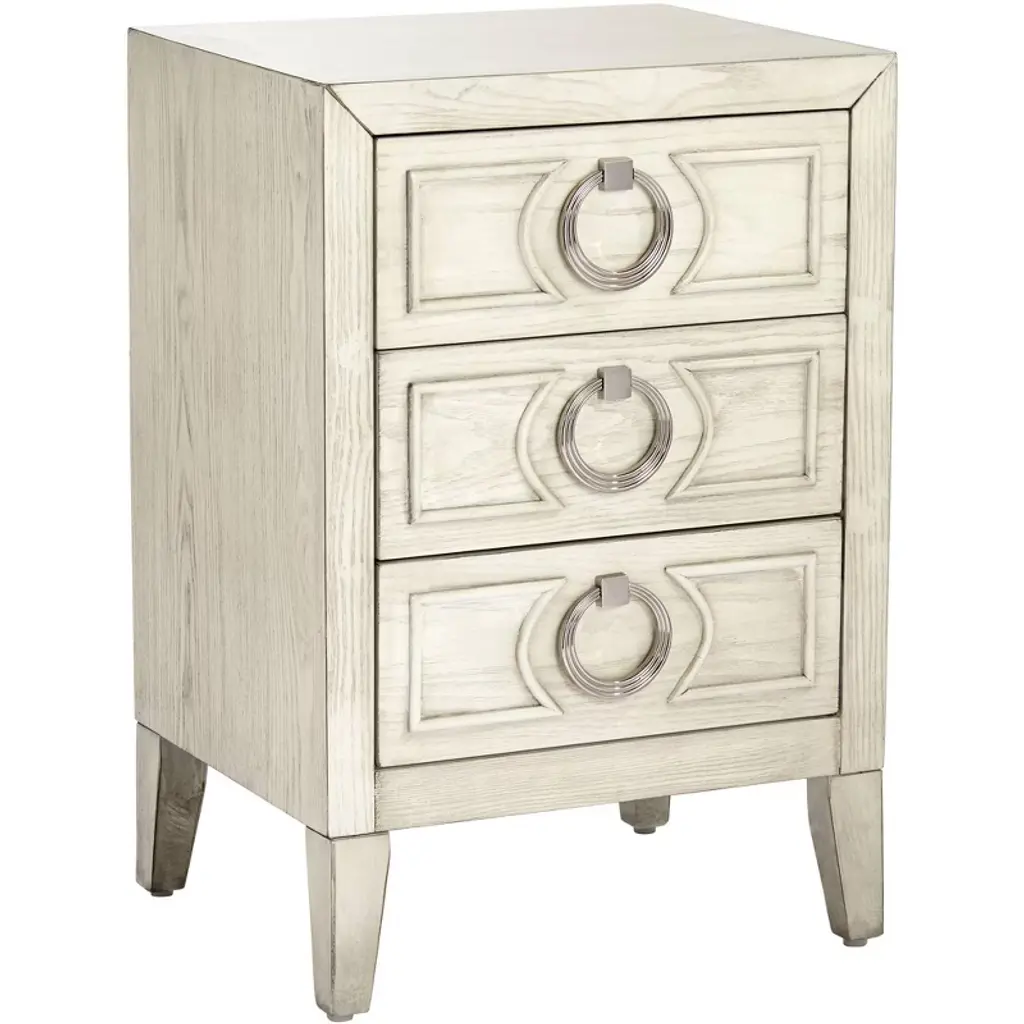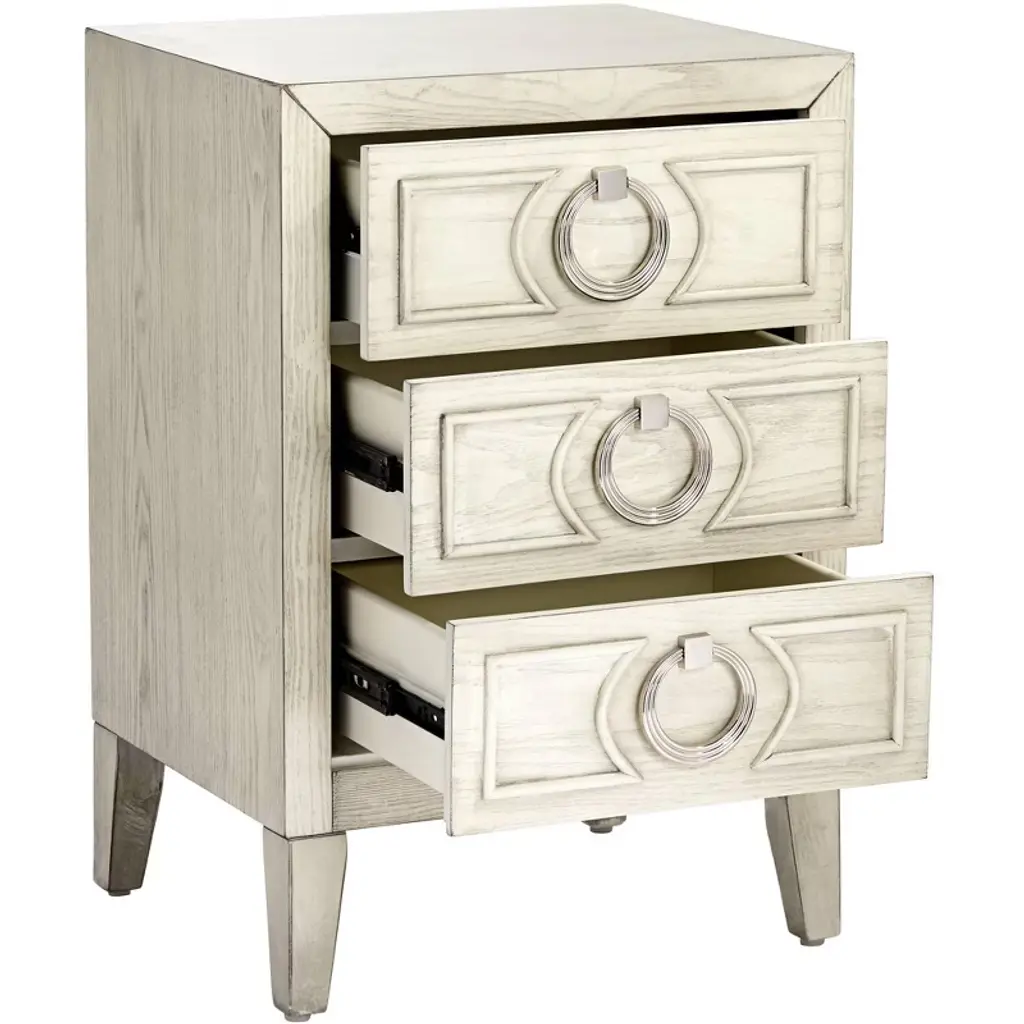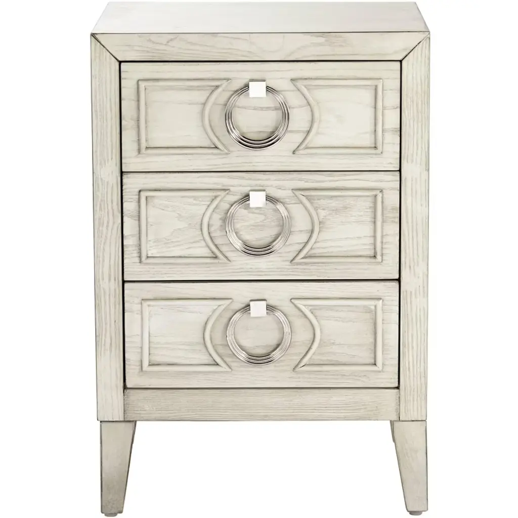 A tribute to retro styling adds character to this three-drawer wood accent table. Repurpose a Mid-Century Modern vibe with updated features, choosing this chest by Coast to Coast Accents. Made from rubber wood and MDF, its white finish highlights chrome finish zing alloy oversized drop rings. Adjustable levers assure even placement.