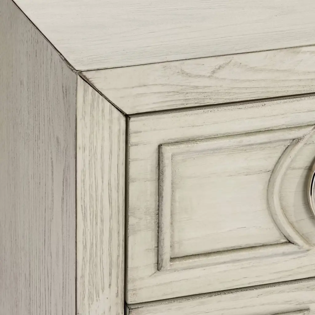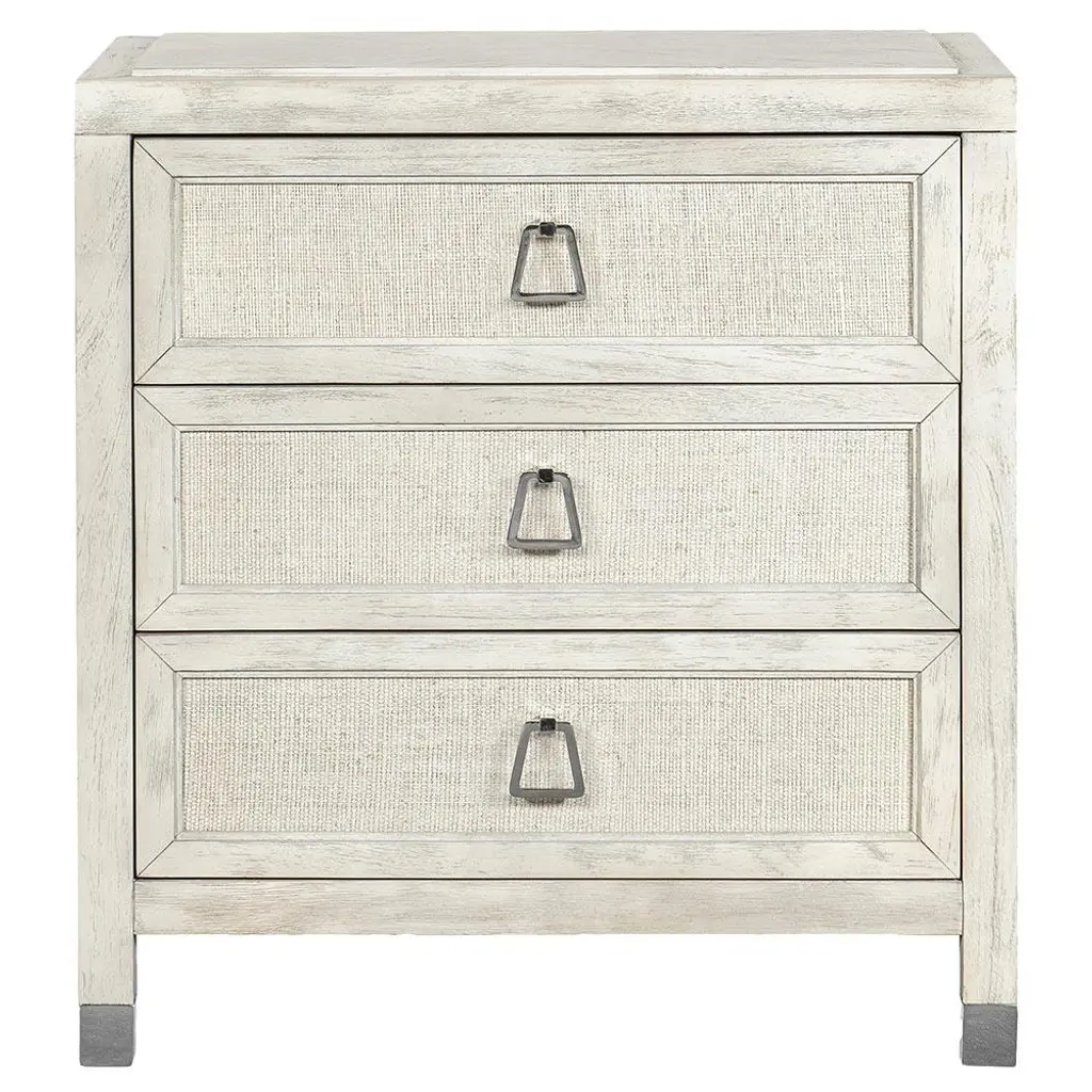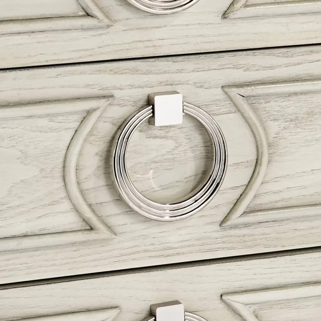 A tribute to retro styling adds character to this three-drawer wood accent table. Repurpose a Mid-Century Modern vibe with updated features, choosing this chest by Coast to Coast Accents. Made from rubber wood and MDF, its white finish highlights chrome finish zing alloy oversized drop rings. Adjustable levers assure even placement.