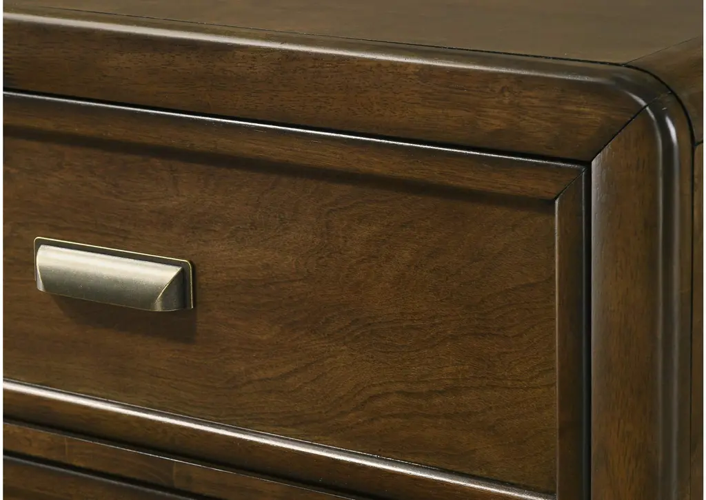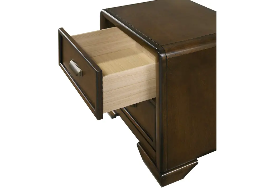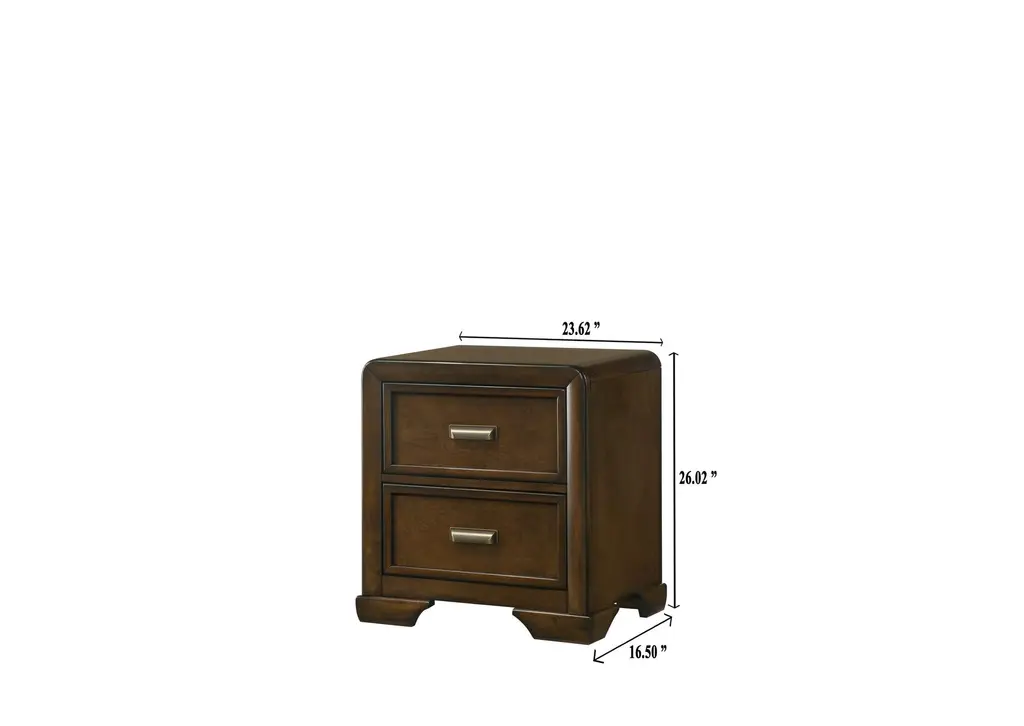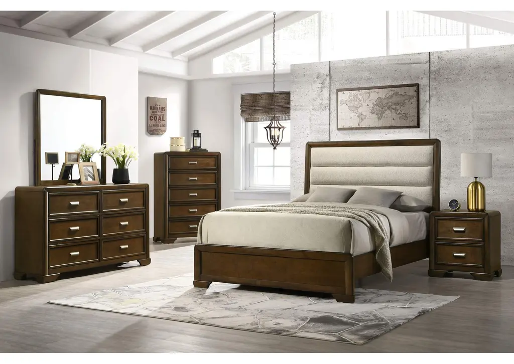 This bedroom collection epitomizes timeless elegance with its classic design and rich, warm wood tones. The set features a plush, upholstered bed frame that provides a comfortable, luxurious focal point. Complementing the bed is a broad dresser, offering ample storage with its deep, smooth-gliding drawers accented by sophisticated hardware. Coordinating nightstands frame the bed, providing convenient bedside storage and display space. Each piece is crafted with meticulous attention to detail and stands on sturdy legs for a distinguished look. Weight 50.600 lbs. (22.77kgs.)