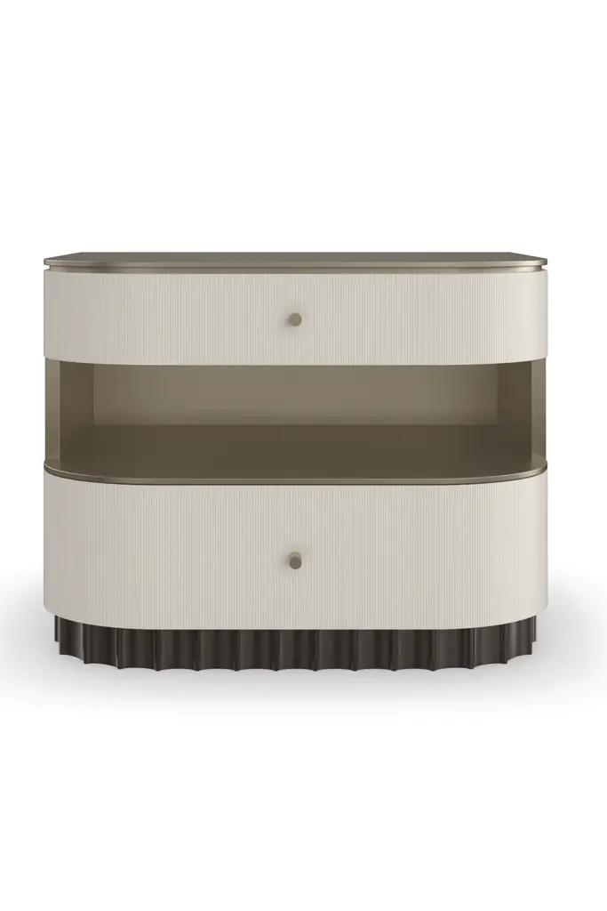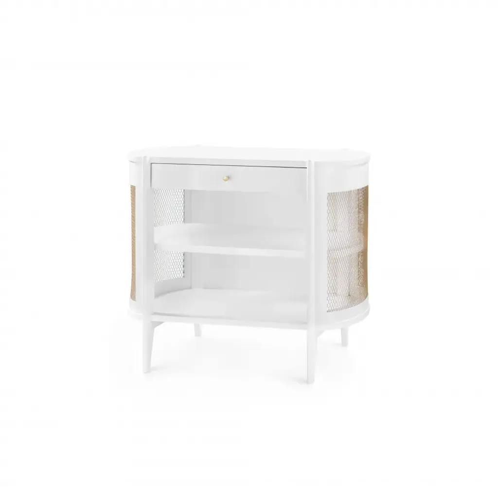 Introducing the Collins Lacquer Nightstand: a stunning Art Deco-inspired piece with a retro pop-of-color blue drawer. Its sexy sloped silhouette exudes high-style, while the vibrant blue drawer adds a punchy touch. Elevate your bedroom with this unique and stylish nightstand that combines timeless design with a playful twist.