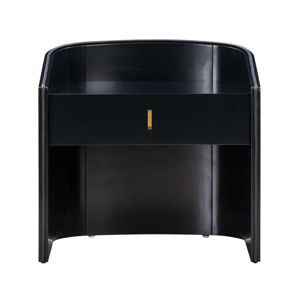Introducing the Collins Lacquer Nightstand: a stunning Art Deco-inspired piece with a retro pop-of-color blue drawer. Its sexy sloped silhouette exudes high-style, while the vibrant blue drawer adds a punchy touch. Elevate your bedroom with this unique and stylish nightstand that combines timeless design with a playful twist.