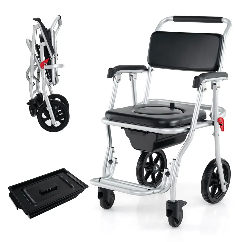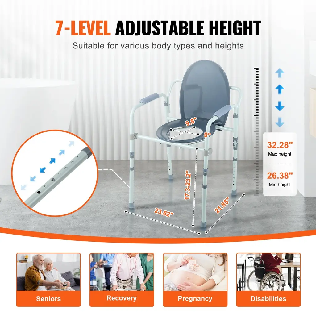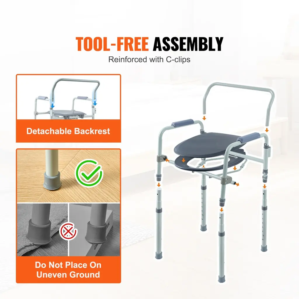 350/1000 LBS Rust-Proof Aluminum Frame: Our raised toilet seat is constructed from 1.2mm thick aluminum, which is lightweight yet sturdy. The tool-free assembly is enhanced with simple twist knob screws, ensuring tightened stability that resists deformation and bending over time. 7-Level Adjustable Height: Featuring 7 height settings between 20.3 and 25.4 inch/17.3 and 23.2 inch/19.3 and 25.2 inch/19.7 and 24.4 inch, this raised toilet seat accommodates various needs without the need for tools. It's ideal for the elderly, pregnant women, individuals with disabilities, and those recovering from surgery, ensuring a comfortable and accessible bathroom experience. Non-slip Armrests & Footpads: Equipped with non-slip rubber foot pads for superior stability and additional replaceable pads, this raised toilet seat maintains a secure grip on bathroom tiles and bedroom floors, reducing the risk of slips. Comfortable Padded Seat: The raised toilet seat is composed of wood, sponge, and leather. The soft cushion is up to 1.6 inches thick, and the surface leather is waterproof, breathable, and easy to clean, minimizing discomfort and pain during prolonged use. This bedside commode features a thick, ergonomic seat with a detachable backrest that supports your waist and spine, ensuring comfort and expandable space when removed. Odorproof & Spillproof: Featuring a 3-in-1 bucket with 5.8 L capacity, this multi-functional raised toilet seat includes a lid for effective odor control and hygiene, ideal for bedroom use. Besides, it can also be used as a shower chair. The bucket is made from easy-to-clean PE material, with a splash-guard design for added convenience. And you can lift the bucket out easily. Package Content 1 x Commode Chair 1 x Manual