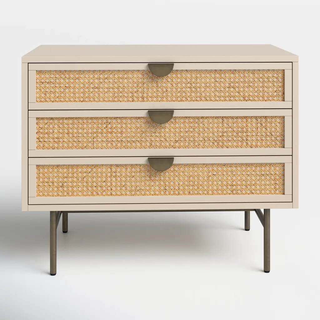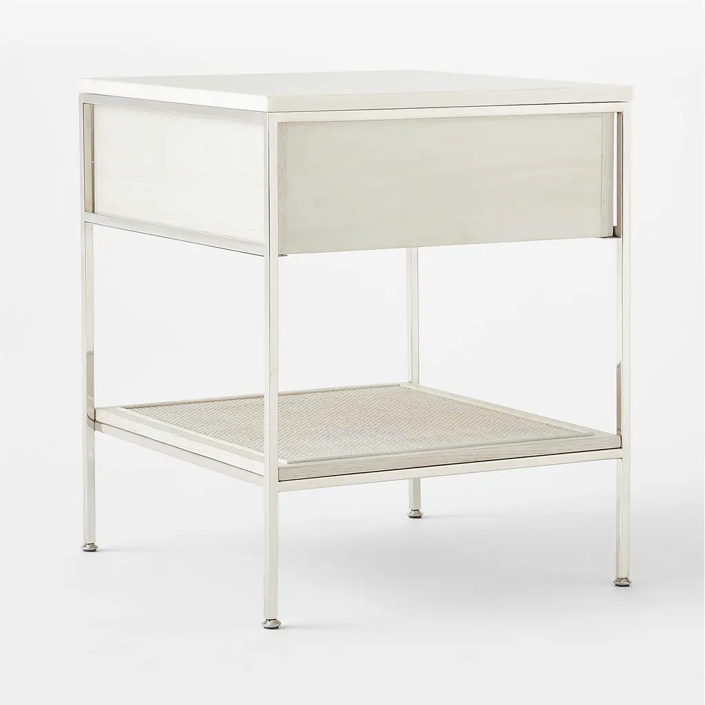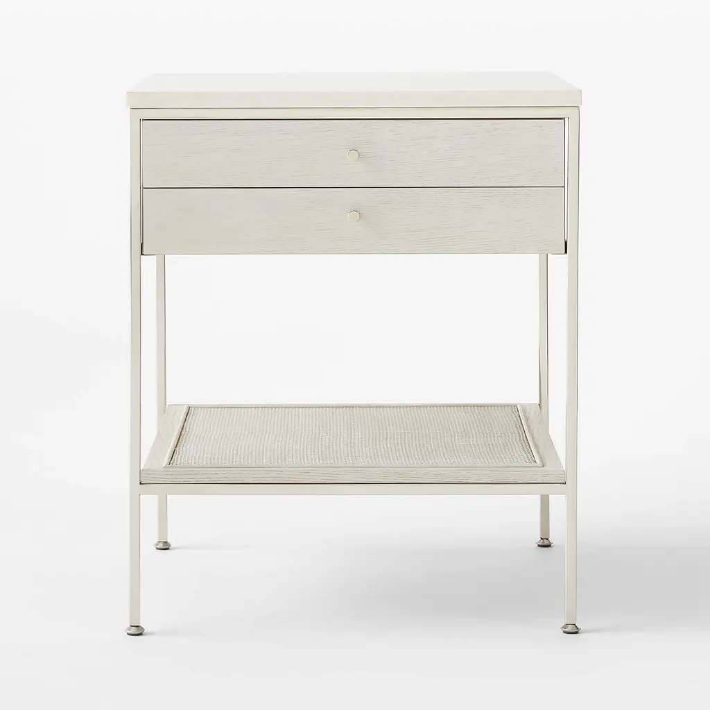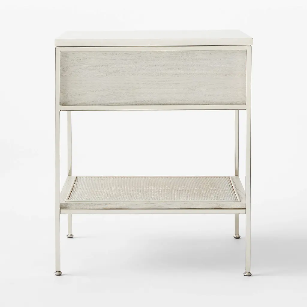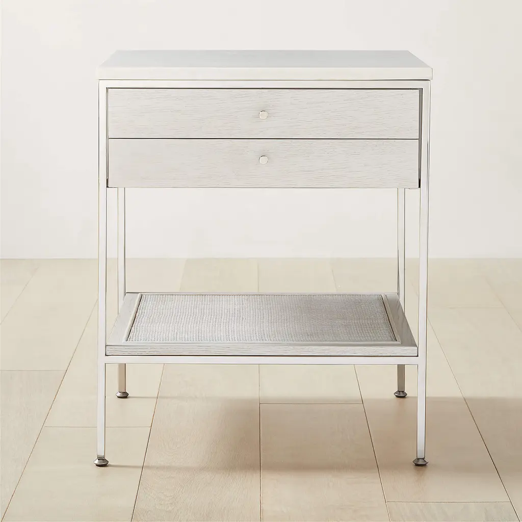 The slender lines, fine veneers and architectural detailing of Paul McCobb's Connoisseur Group are just as elegant today as they were when first introduced in 1954. Beautifully crafted wood nightstand features white washed oak certified sustainable by the Forest Stewardship Council ®, honed Volakas marble top, natural cane shelf and polished nickel knob—thoughtful details and sculptural influences that are stunning in their simplicity. CB2 exclusive.