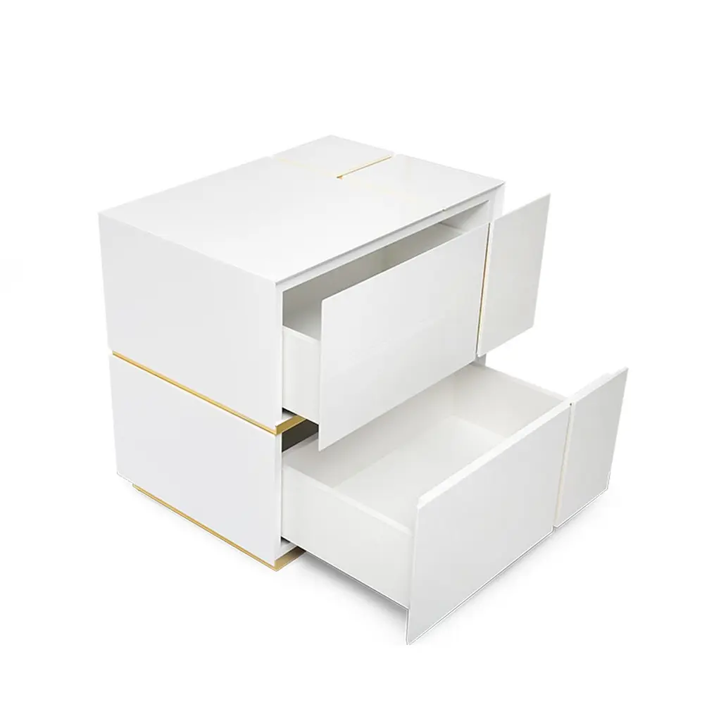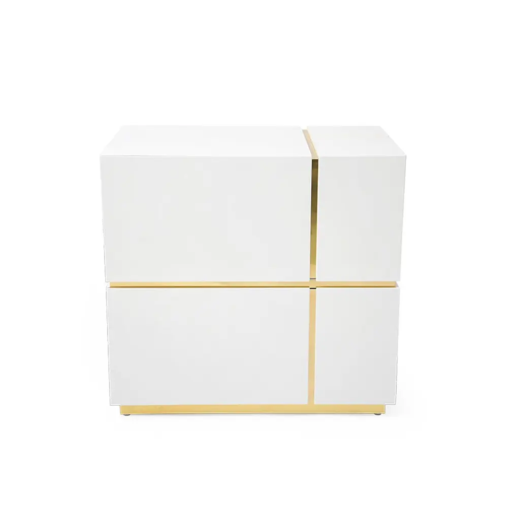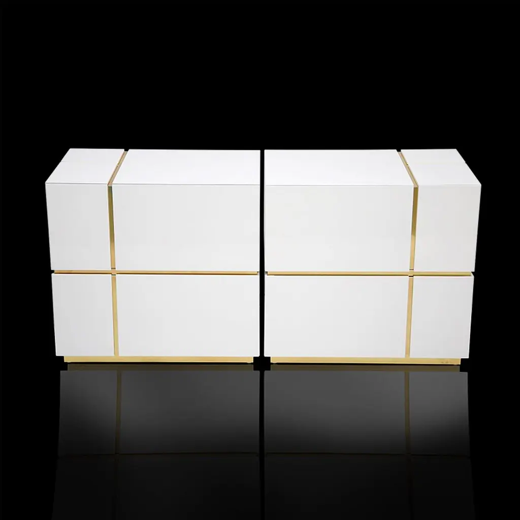 This modern set of 2 bedside tables diamond gently fit the bedroom atmosphere by contrasting white and brass. The handcrafted construction has a high gloss white finish and brass details. Made of wood, plywood and brass, bedside tables Diamond feature two large drawers with soft closing mechanism each to enhance the fabulous minimal look and feel. Perfect as bedside table or elegant accent piece in other room or a boutique. Nightstand diamond is made utterly by hand and doesn't require assembly.CUSTOMIZATION AVAILABLE - Different colors, materials, finishes and customized sizes available upon request. If you’re interested in a customization that is not currently listed, please contact Kanttari.BESPOKE – We do create individual and fully customized designs. Please contact Kanttari to discuss your specifications.MANUFACTURING – we fully hand-craft each piece in our workshop by our best craftsmen. Production lead time may take up to 9 - 12 weeks, bespoke items may be longer – depending on the exact specification and availability of materials chosen. For more information please contact Kanttari.SHIPPINGCarefully packaged in wooden crate.Fully insured.Request a customized shipping quote.