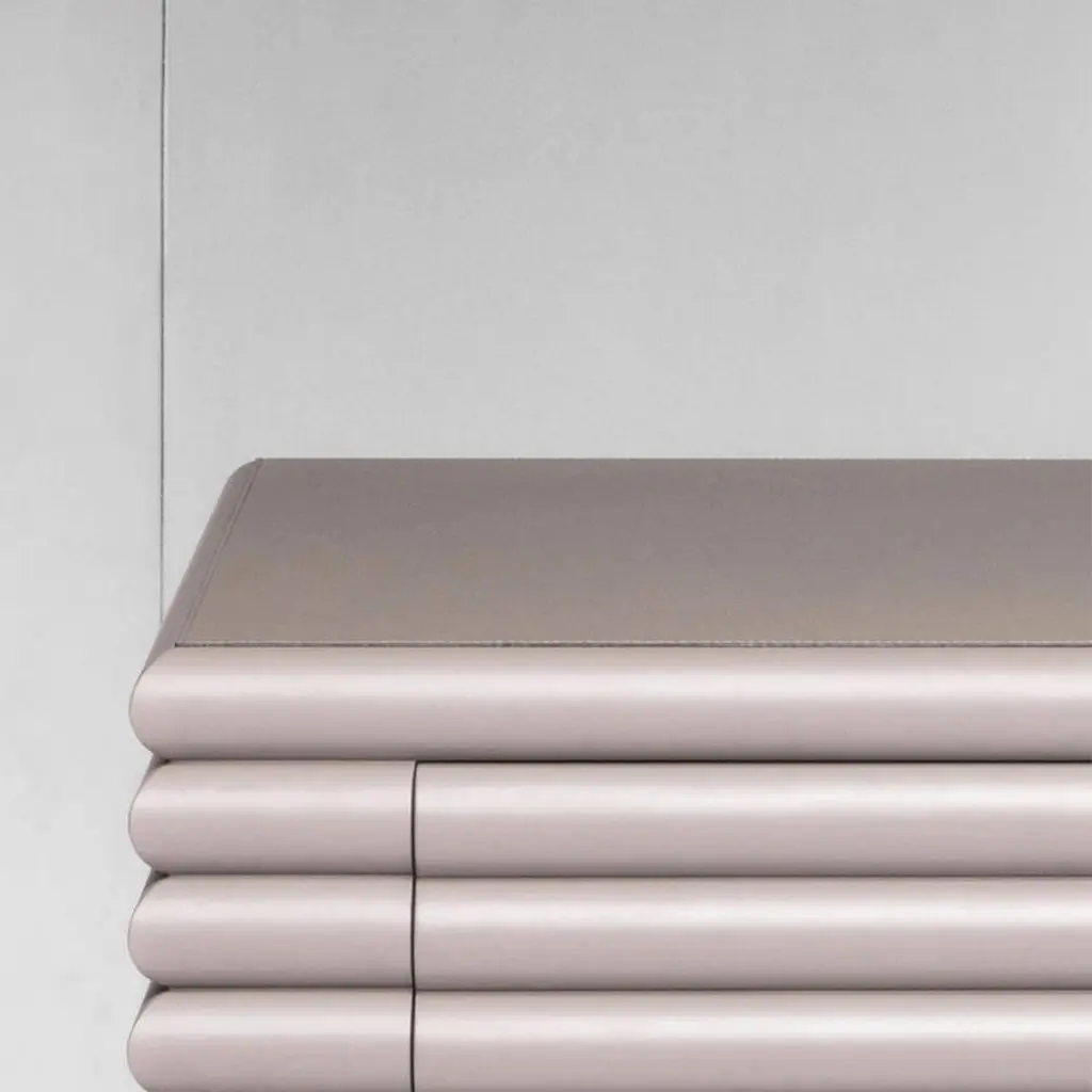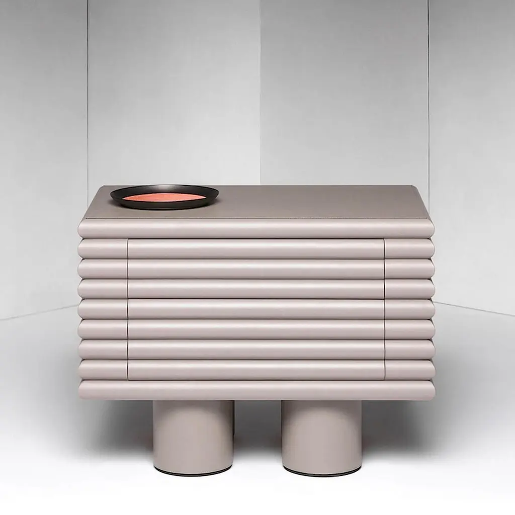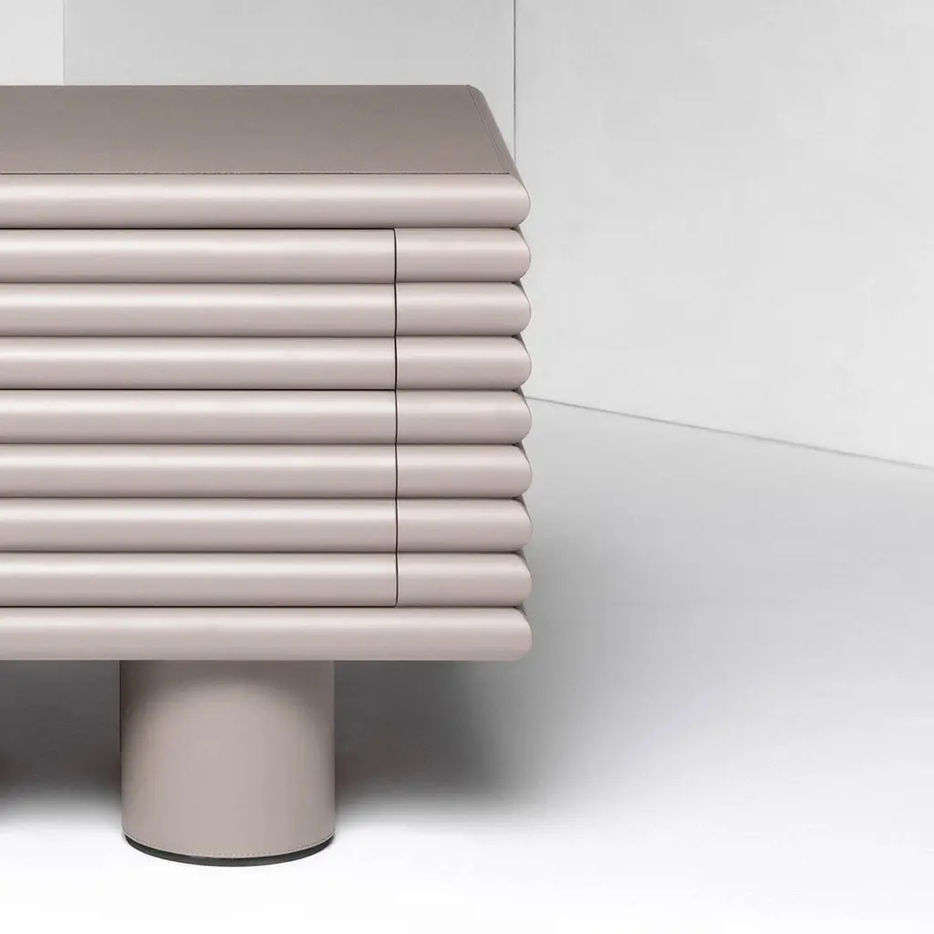 Two drawers chest of drawers / nightstand by Stephane Parmentier for Giobagnara. The object presented in the image has following finish: F06 Ivory Nappa LeatherA superb piece of functional decor showcasing a captivating design aesthetic, this chest of drawers is enriched by the opulence of soft beige leather covering it. Designed by Stéphane Parmentier, this piece of the Scala Collection is inspired by Italian shoe designer Salvatore Ferragamo's iconic stacked heels which translates into a series of horizontal tubular layers marking the silhouette which rests on four bold cylindrical legs and boasts a lacquered top.Design: Stéphane ParmentierMaterial: leather-covered top / feet, lacquered wood structureDimensions (in): W 24.61 x D 15.94 x H 17.91Dimensions (cm): W 62.5 x D 40.5 x H 45.5Made by hand, in Italy.This item is made to order. Please choose the finish that you want for your piece.