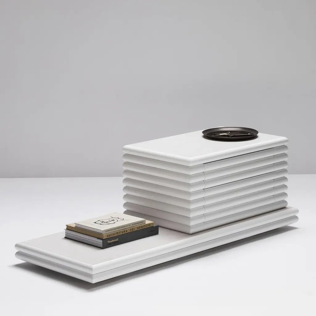 Contemporary leather nightstand scala by Stephane Parmentier for Giobagnara.Two drawers.The object presented in the image has following finish: F05 White Nappa LeatherAn original silhouette with a dynamic, contemporary design defines this captivating nightstand designed by Stéphane Parmentier for Giobagnara. Wrapped in soft, white leather, the Scala Collection's recurring motif of uniform tubular layers is displayed on both the 2-drawer unit and the extended rectangular platform where its rests.Design: Stéphane ParmentierMaterial: leather-covered top / foot, lacquered wood structureDimensions (in): W 48.23 x D 15.94 x H 16.34Dimensions (cm): W 122.5 x D 40.5 x H 41.5Made by hand, in Italy.This item is made to order. Please choose the finish that you want for your piece.