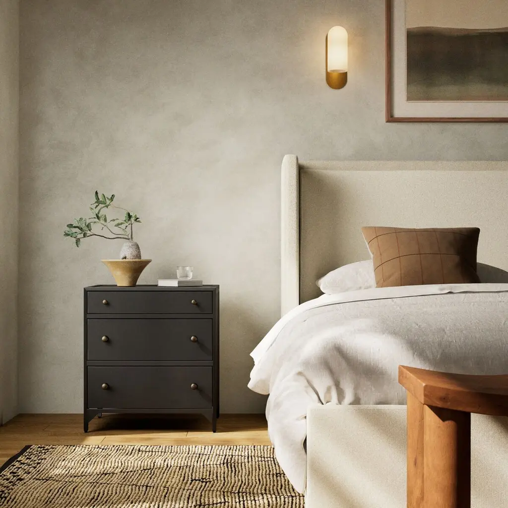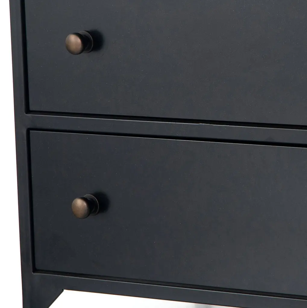 Made of iron and steel, this nightstand will be in your family for generations to come. Fortunately its simple, versatile good looks will never fall out of style. The brass drawer knobs provide a cool contrast to the dresser's black finish.