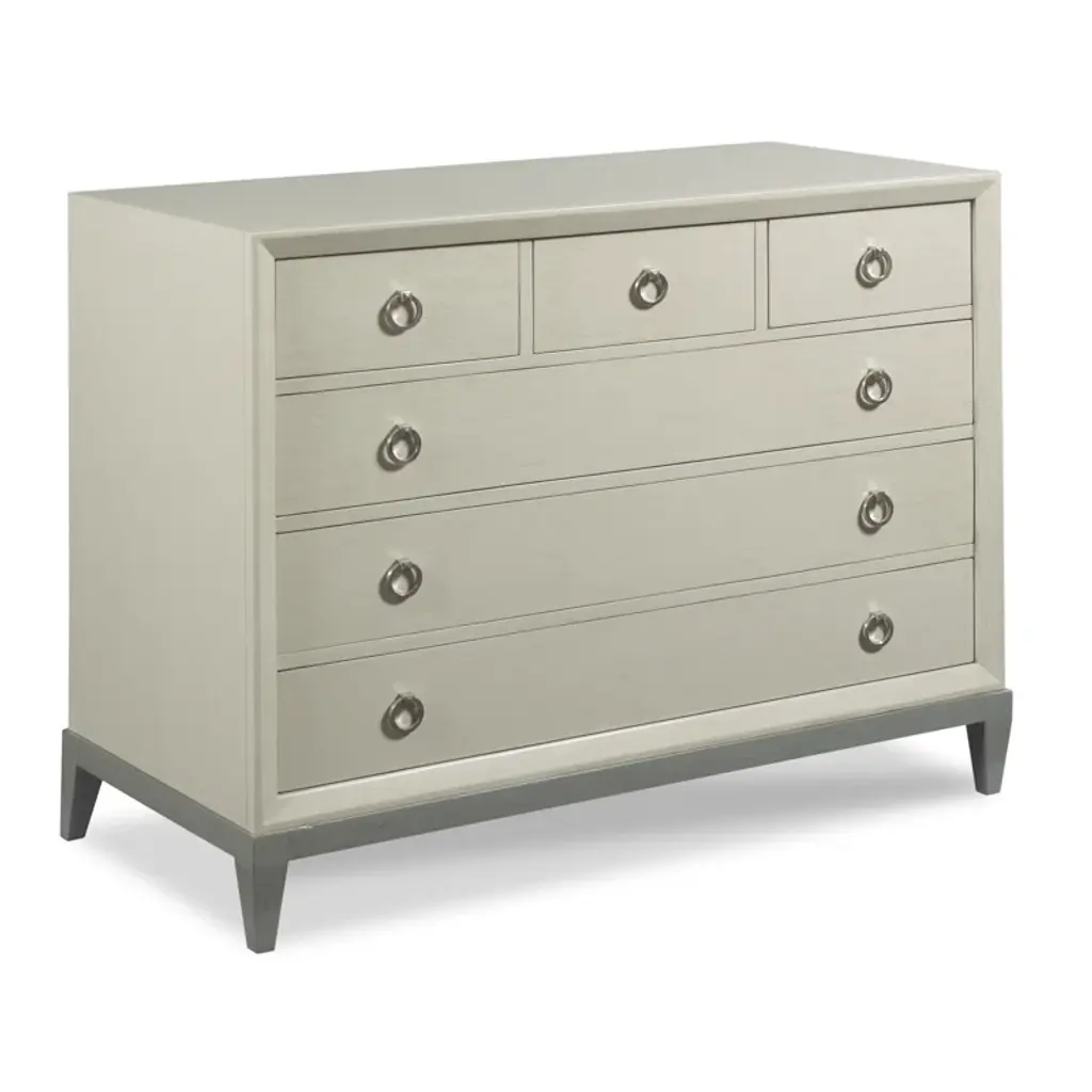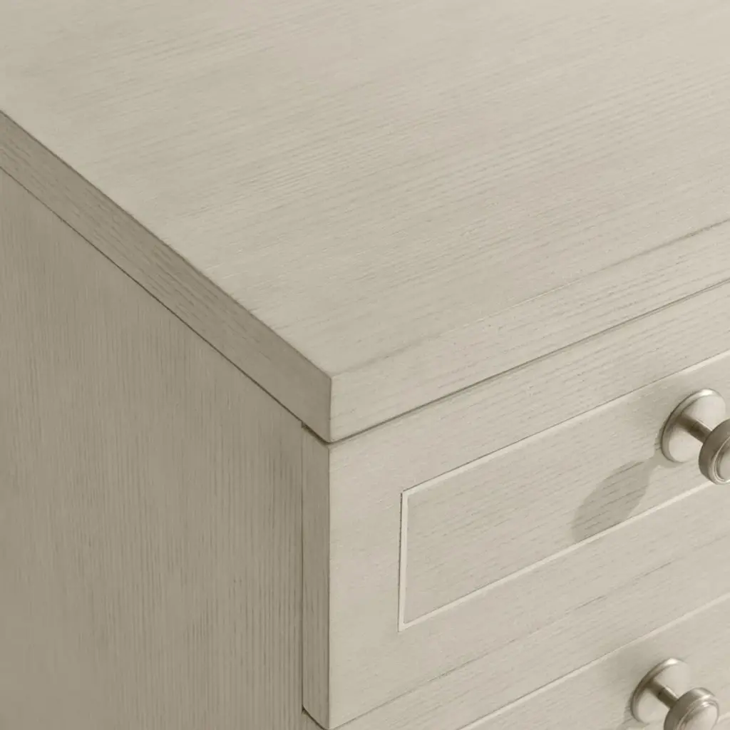 The Cornelia nightstand has a traditional design that is updated for modern living with brushed stainless steel metal inlays around its three drawers. The lines are sleek and refined, while the nebbia finish gives the piece a more casual style. The design also includes a two-port USB charging unit.