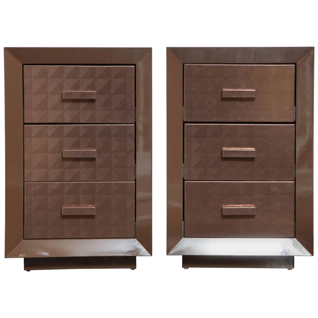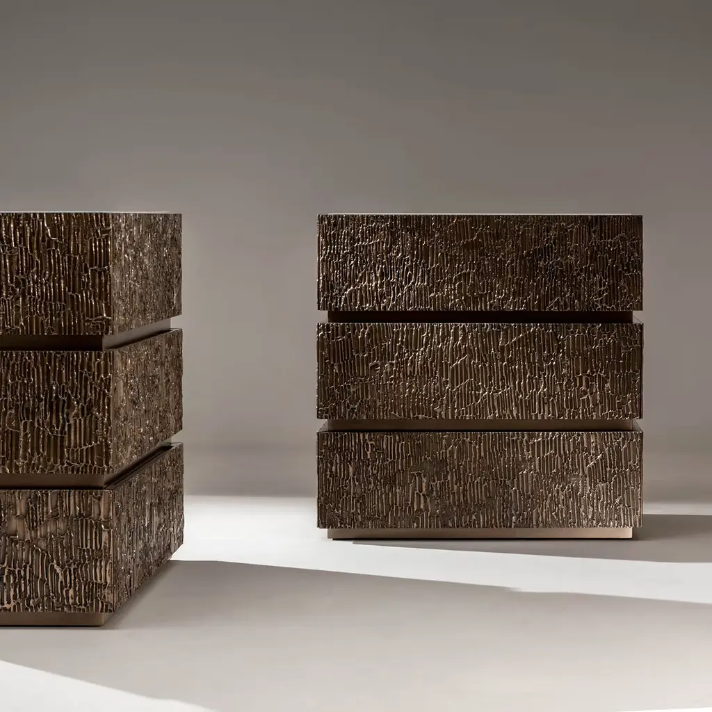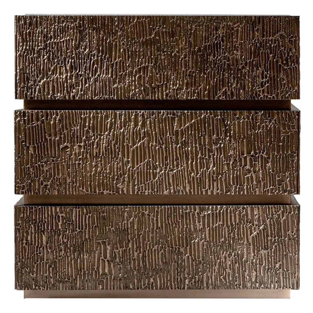 Chest of drawers with Corteccia pattern in Liquid metal bronze on front and sides, top in white Carrara marble. Equipped with 3 drawers.