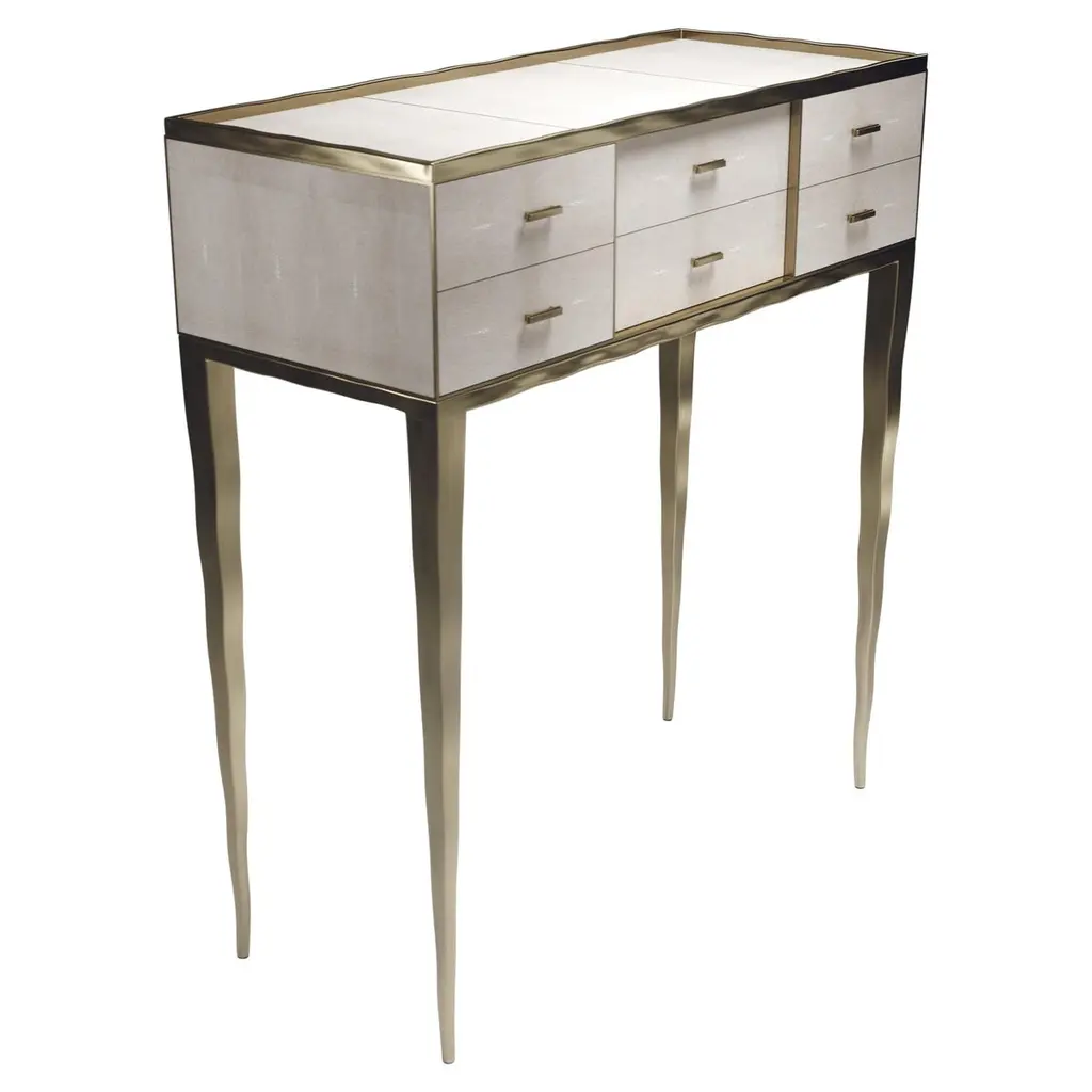 The Paris based label has distinguished themselves since their launch, with their iconic use of shagreen mixed with brass and other exotic materials. All furniture is handcrafted by skilled artisans, ultimately making each piece unique, designed in Paris and produced in the Philippines.The Cosima bedside table, is both practical and stunning in design. This bedside table is the perfect accent piece for any intimate space. This table has one large drawer, and the top piece in cream shagreen can be removed from the bronze-patina brass stand.The finish of the shagreen is authentic as it is hand-dyed and the designer calls the finish look: "antique natural shagreen."The dimensions of this piece are 86.5 x 37 x 92 cm / 23.75" x 15.75" x 23.75"All R&Y Augousti pieces are handmade by artisans, ultimately making each piece unique. 1 piece currently available for immediate shipment, multiples available on order with a 5-6 week leadtime, custom color/sizing available on request. Wipe clean with soft dry cloth.Acclaimed design duo Ria & Yiouri Augousti have established themselves since the 1990s as pioneers of modern-vintage style through their luxurious Art Deco inspired collections.The Paris based label has distinguished themselves since their launch, with their iconic use of shagreen mixed with brass and other exotic materials. All furniture is handcrafted by skilled artisans, ultimately making each piece unique. All shagreen-covered items should be kept out of direct sunlight, color variants may occur on the stingray and other exotic finishes, but this showcases the Parisian label's commitment to creating authentic luxurious products using natural components.