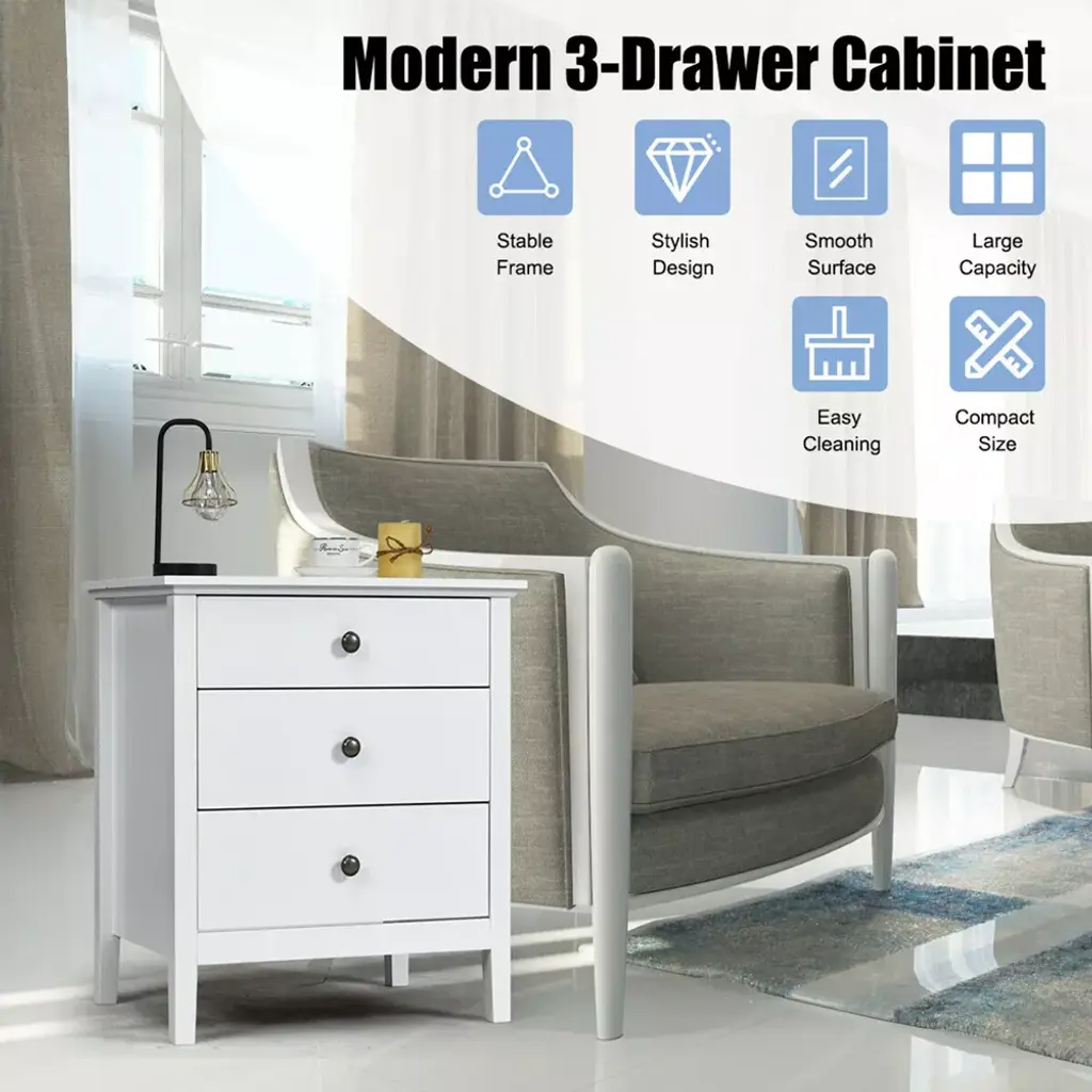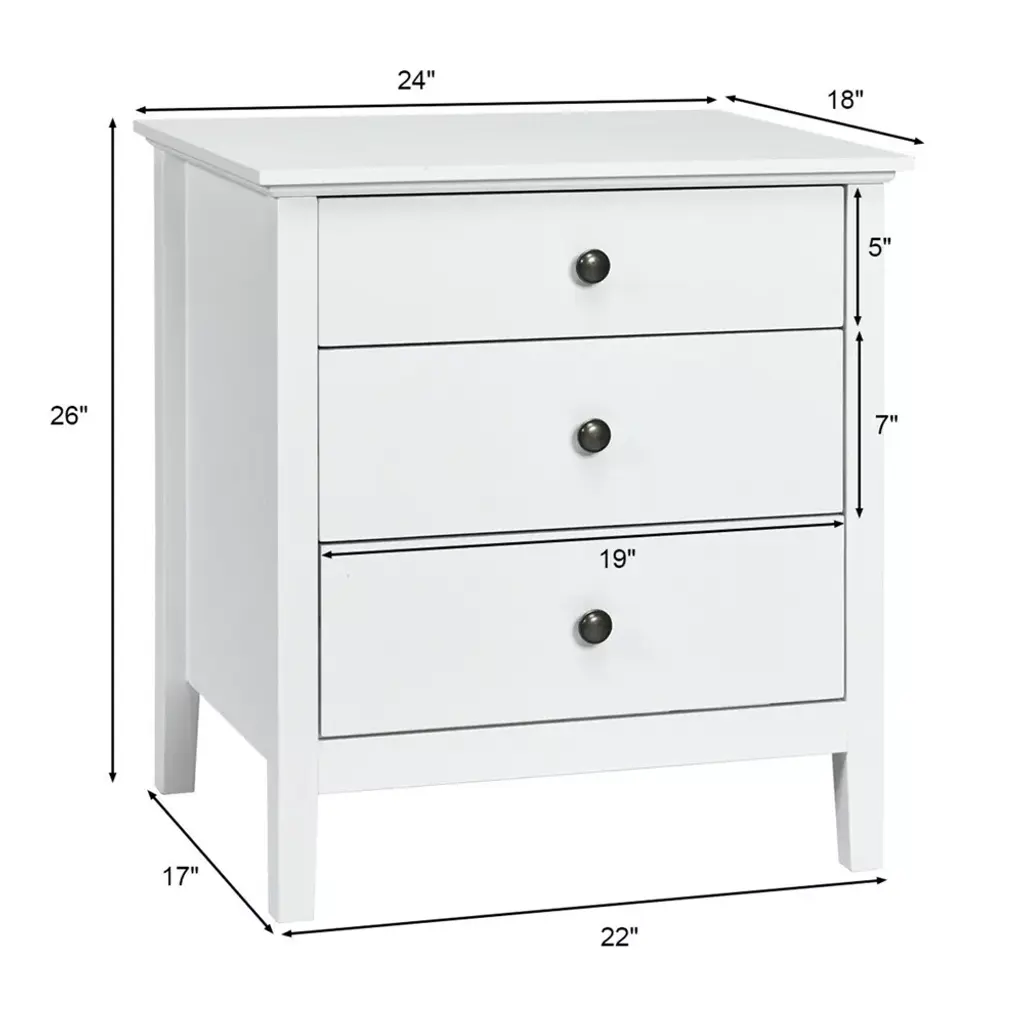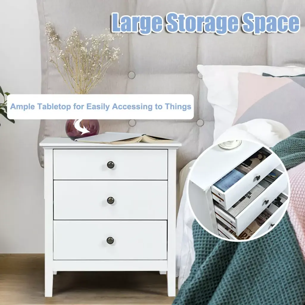 With a wide tabletop and 3 deep drawers, the nightstand neatly organizes your smart phone, alarm clock, glasses, notebooks, jewelry, and skincare products. The effective storage solution has a sturdy wood structure that supports up to 270 lbs. Versatile enough to work as a sofa side table or telephone table, its elegant design fits seamlessly into any room. The drawers boast smooth metal slides and stylish knobs for easy use, while anti-slip foot pads protect floors. Easy to maintain with a sleek finish, cleaning is a breeze with just a damp cloth.FeaturesWide tabletop provides versatile open space 3 pull-out drawers keep everything organized Smooth metal slides are low-noise and effortless With easy-to-grip knobs, making opening easier Protective foot pads are friendly to the floor Wide use for your bedroom, living room, or study Serves as a nightstand, a side table, or a telephone tableColor: White Material: MDF, Engineered Wood Overall Dimensions: 22" x 18" x 26" (L x W x H) Bottom Clearance: 4" Inner Size of Big Drawer: 16.5" x 13.5" x 4.5" (L x W x H) Inner Size of Small Drawer: 16.5" x 13.5" x 3.5" (L x W x H) Load Capacity of Tabletop: 135 lbs Load Capacity of Each Drawer: 45 lbs Net Weight of Each Nightstand: 41.5 lbs Package Includes: 1 x Nightstand 1 x User Guide