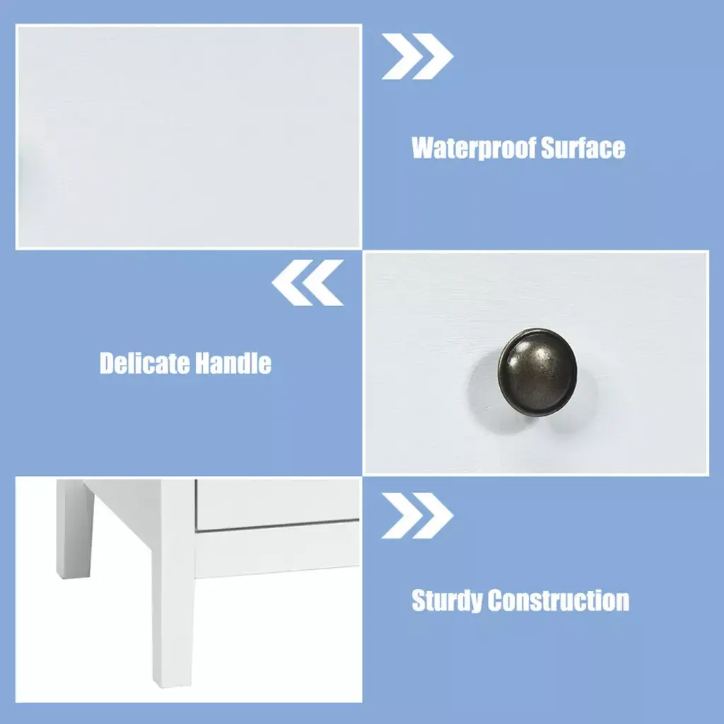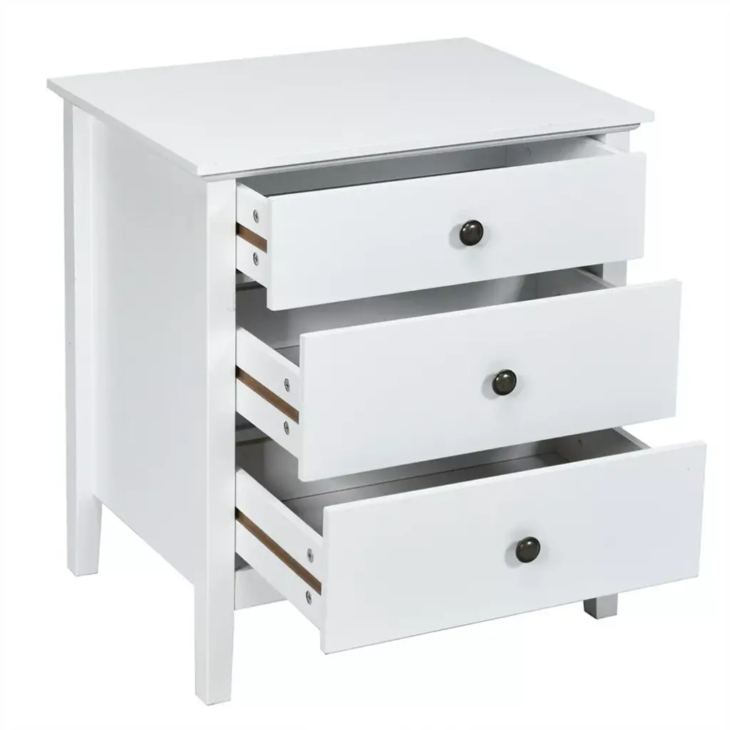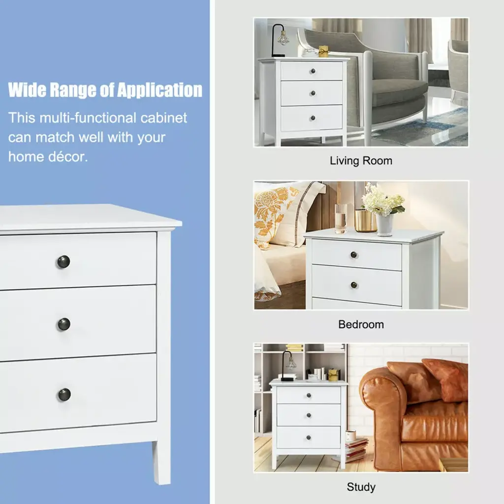 With a wide tabletop and 3 deep drawers, the nightstand neatly organizes your smart phone, alarm clock, glasses, notebooks, jewelry, and skincare products. The effective storage solution has a sturdy wood structure that supports up to 270 lbs. Versatile enough to work as a sofa side table or telephone table, its elegant design fits seamlessly into any room. The drawers boast smooth metal slides and stylish knobs for easy use, while anti-slip foot pads protect floors. Easy to maintain with a sleek finish, cleaning is a breeze with just a damp cloth.FeaturesWide tabletop provides versatile open space 3 pull-out drawers keep everything organized Smooth metal slides are low-noise and effortless With easy-to-grip knobs, making opening easier Protective foot pads are friendly to the floor Wide use for your bedroom, living room, or study Serves as a nightstand, a side table, or a telephone tableColor: White Material: MDF, Engineered Wood Overall Dimensions: 22" x 18" x 26" (L x W x H) Bottom Clearance: 4" Inner Size of Big Drawer: 16.5" x 13.5" x 4.5" (L x W x H) Inner Size of Small Drawer: 16.5" x 13.5" x 3.5" (L x W x H) Load Capacity of Tabletop: 135 lbs Load Capacity of Each Drawer: 45 lbs Net Weight of Each Nightstand: 41.5 lbs Package Includes: 1 x Nightstand 1 x User Guide