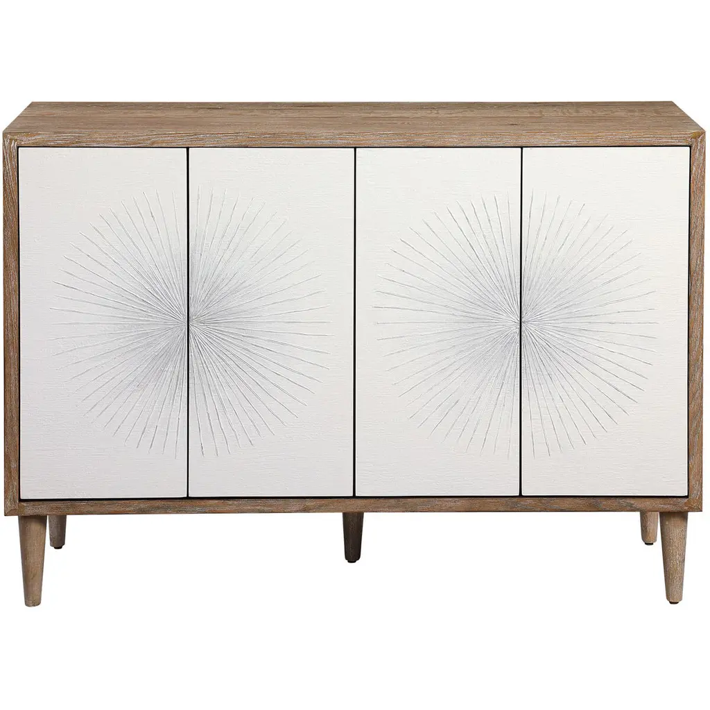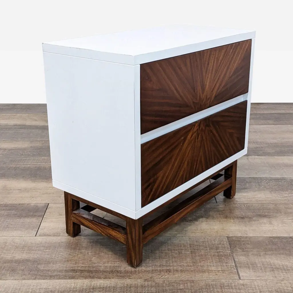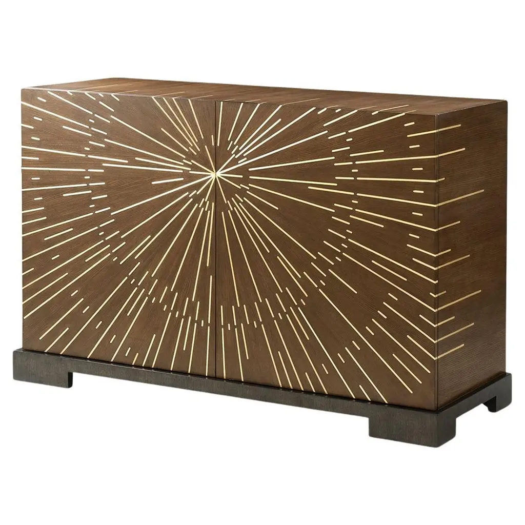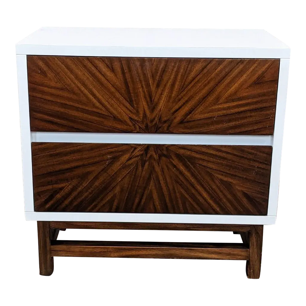 Veneered drawer fronts in starburst pattern, wood base. Brand: CB2 For Crate & Barrel. Dimensions (in): 26W x 14D x 26H.