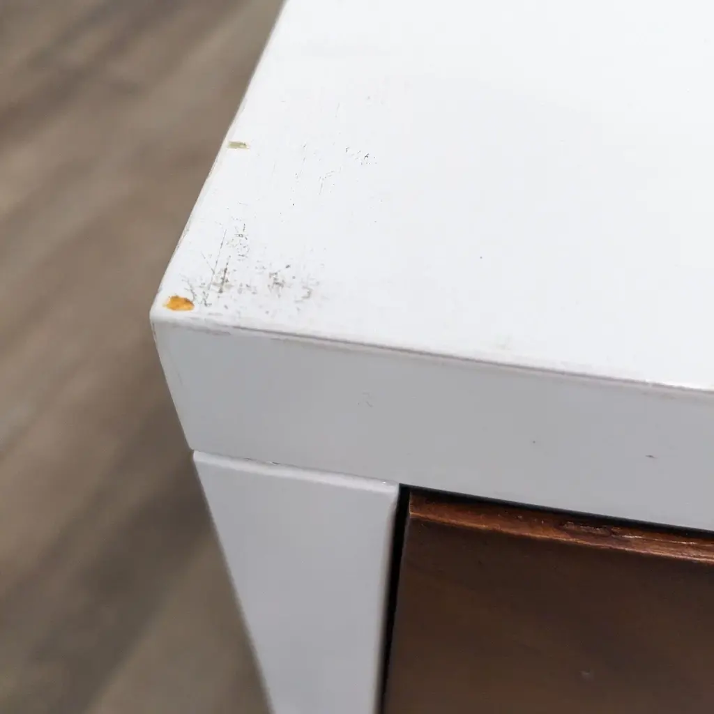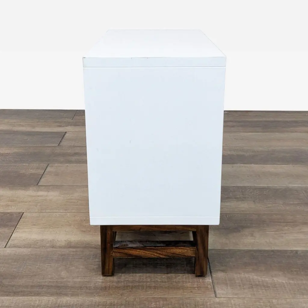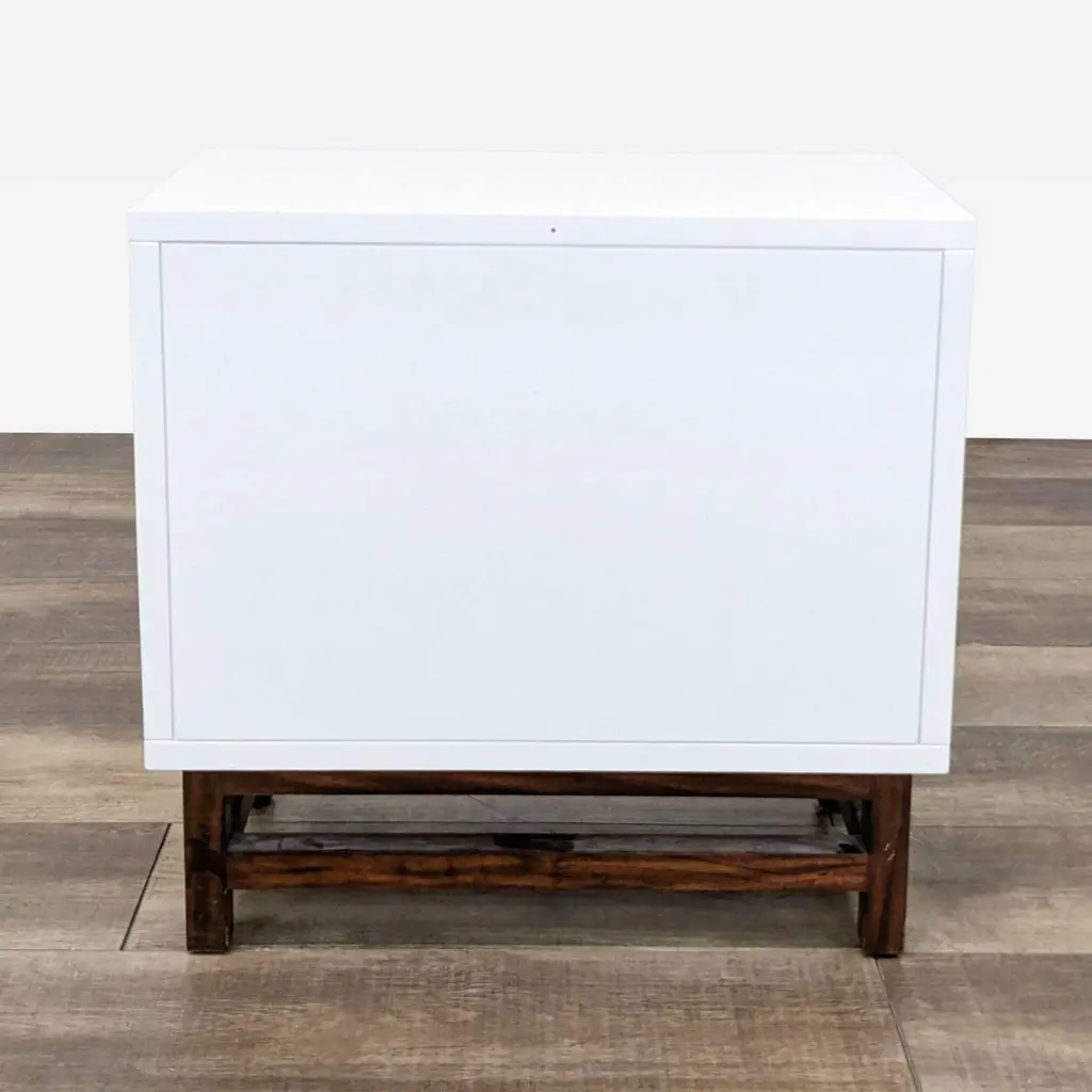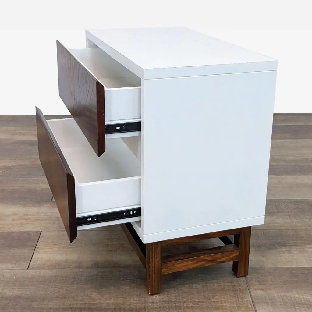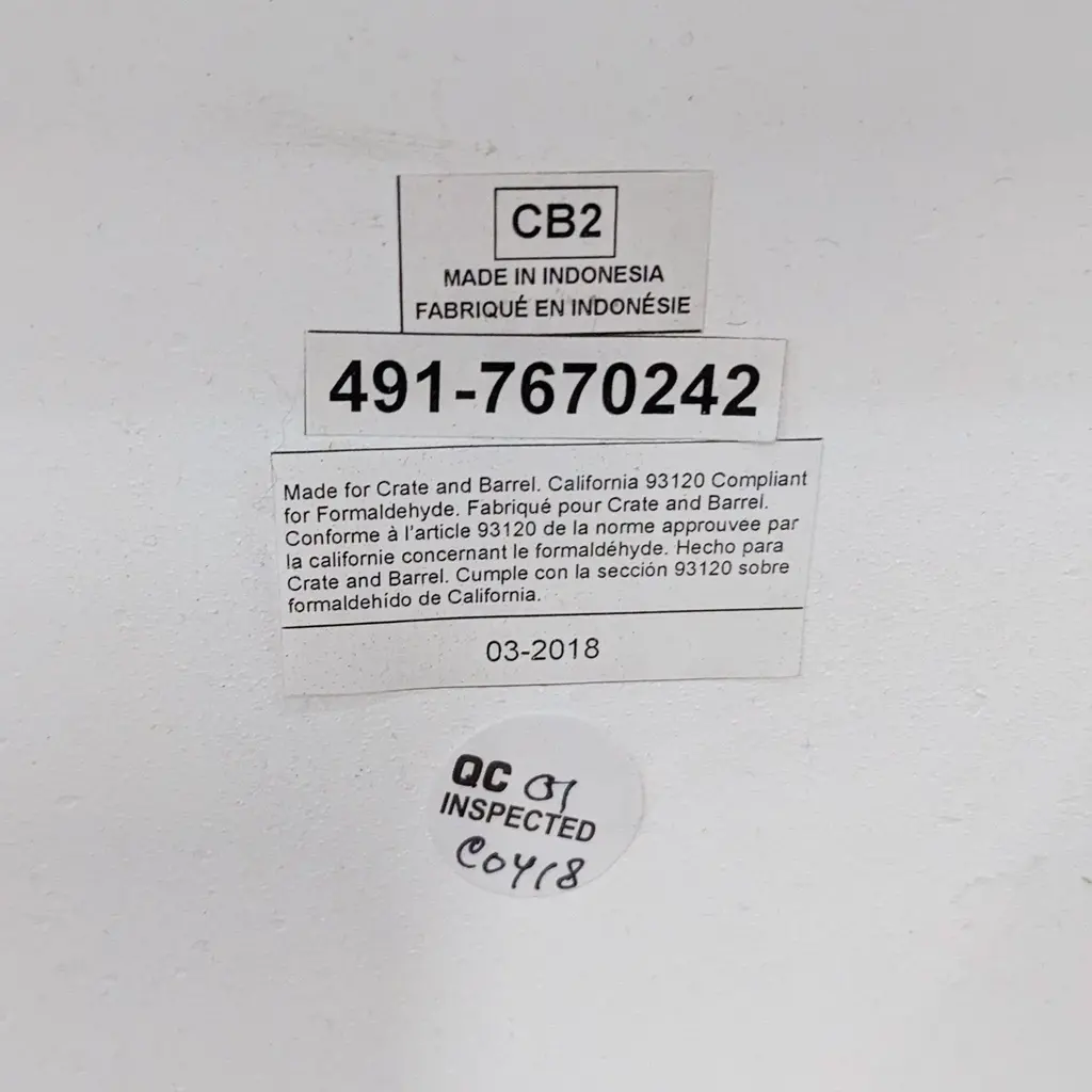 Veneered drawer fronts in starburst pattern, wood base. Brand: CB2 For Crate & Barrel. Dimensions (in): 26W x 14D x 26H.