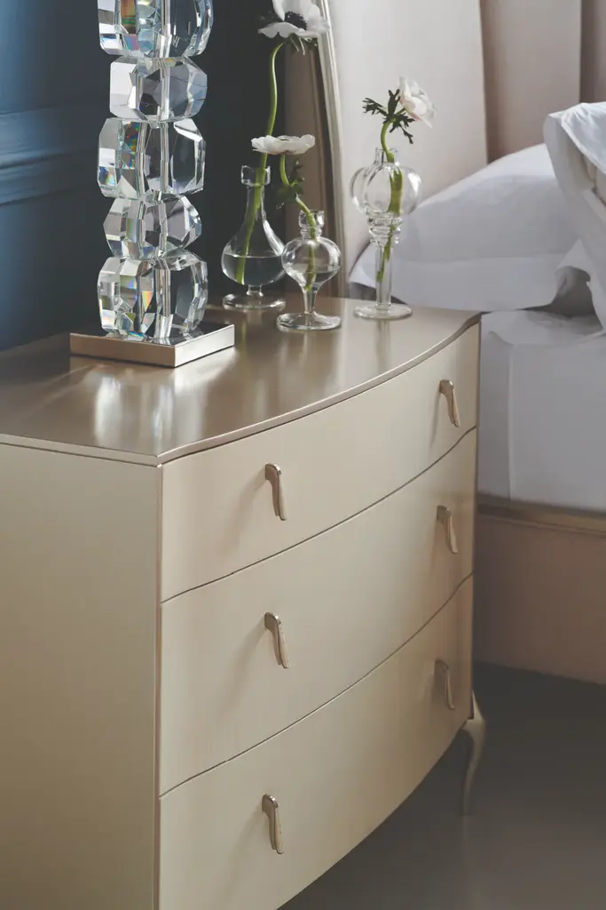 Flowing lines and soft, silvery paint make an elegant first impression with this three-drawer nightstand. Introducing a fresh perspective on light wood finishes, drawer fronts in Vanilla Cream bring to light the decorative character of figured sycamore. Elongated drawer pulls, inspired by an Art Deco jewelry pendant with a faux stone center, add a touch of grace. Ornate metal legs balance the subtly curved top and case, creating a cool shimmer in Soft Silver Paint. Download Assembly Sheet