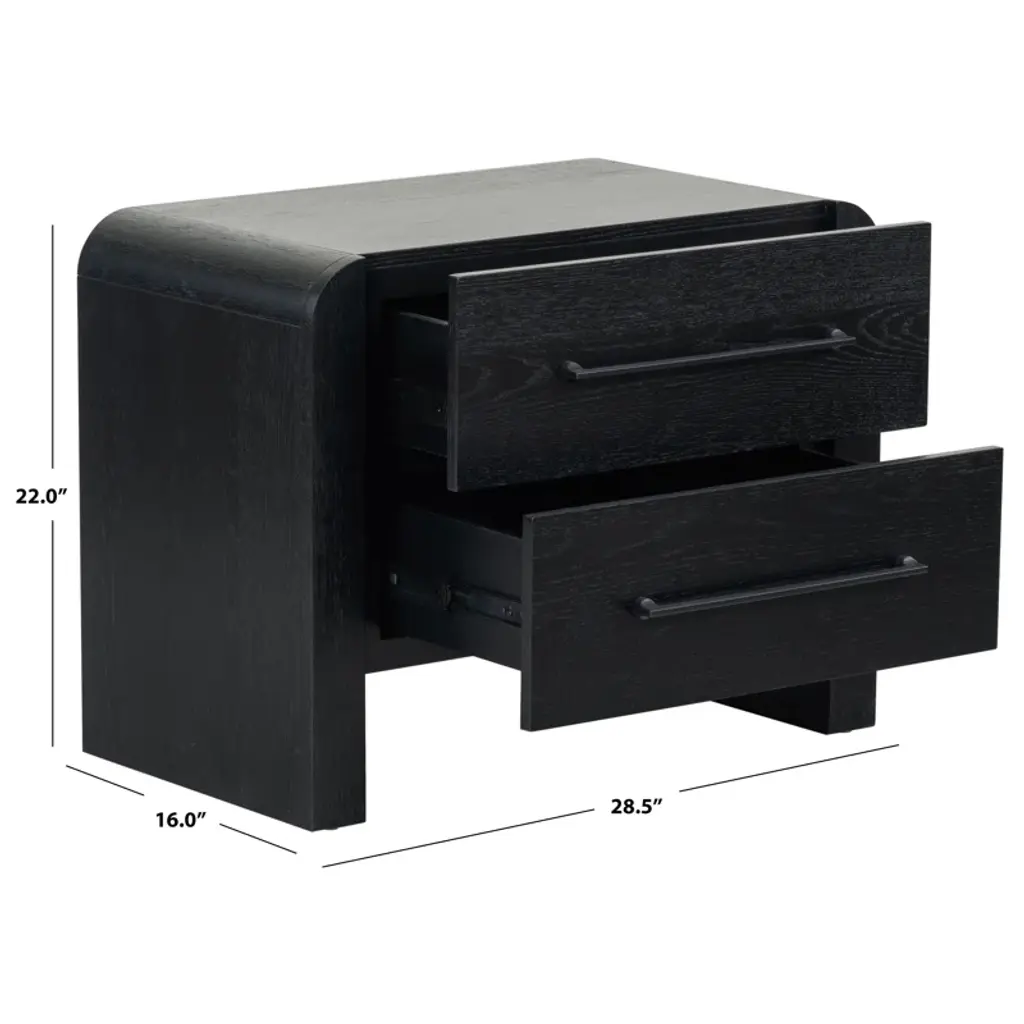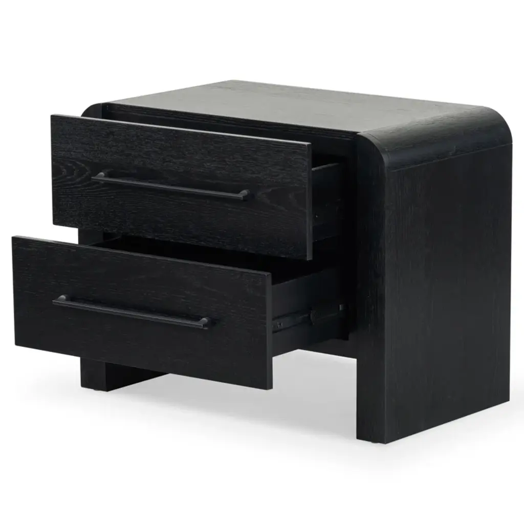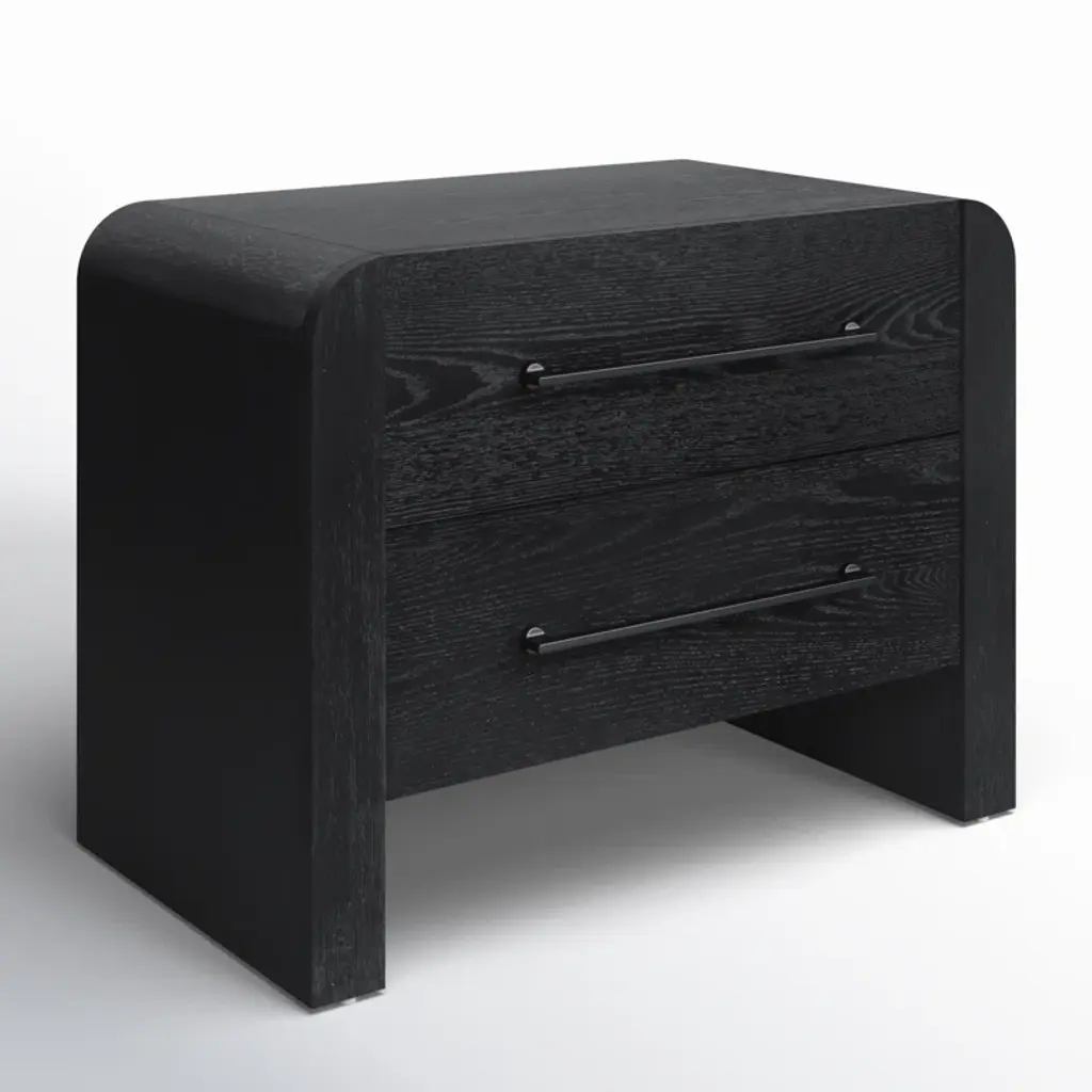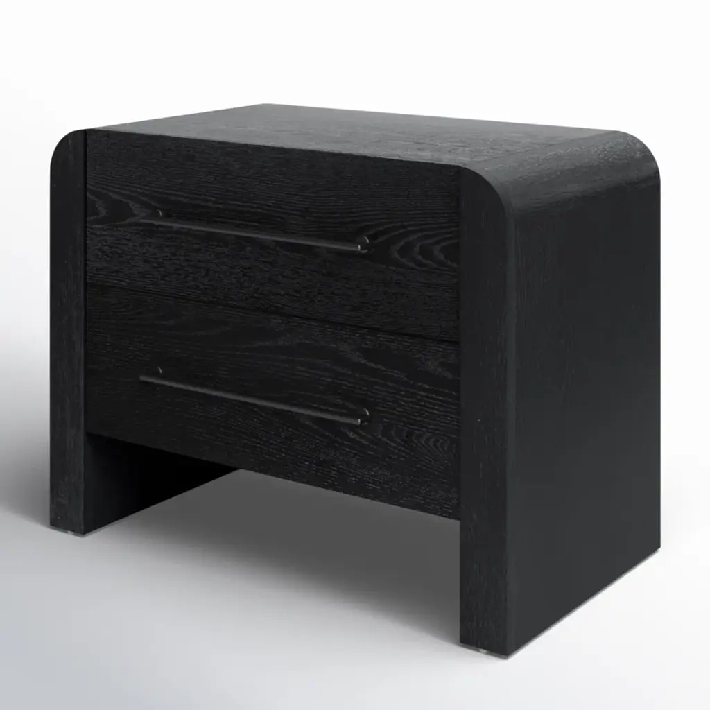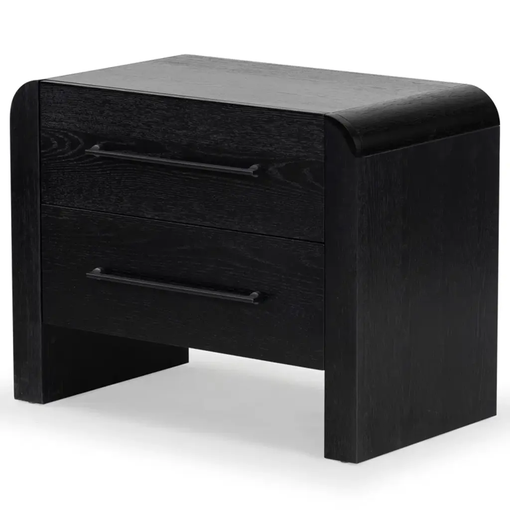 Introducing the striking Katrina Wood 2-Drawer Nightstand, meticulously crafted to add an elegant touch to your bedroom decor. This masterpiece is artfully designed in a sophisticate classic black hue, promising to stand out in any room setting, while still offering a serene ambiance. Posing an impressive built using solid rubber wood, the nightstand promises unparalleled resilience without compromising on aesthetics. The notable detail of Oak veneer provides an added depth and dimension that is sure to captivate onlookers. Opening up to two spacious drawers, this piece offers ample storage for all your bedside essentials while keeping clutter at bay. The nightstand also boasts zinc metal elements that add subtle glitz and further enrich its overall design. Grace your living space with the Katrina Wood 2-Drawer Nightstand - a fusion of style, function, and durability, which pays homage to contemporary design while still keeping an aura of timelessness. Get ready to redefine your living space with a piece that isn't just a showstopper, but a true game-changer!