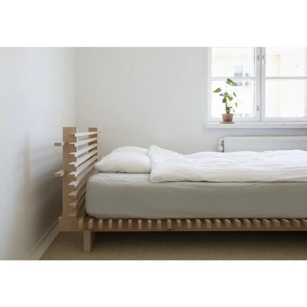 The Cubile 160 headboard is a part of the Cubile bed system by Collaboratorio. Cubile is named after the beds of Ancient Rome: in addition to an actual bed, the word "cubile" denotes more generally a place of rest. The beautifully natural untreated beech highlights Cubile’s simple form and brings a sense of calmness to the bedroom. The Cubile 160 bed is sold separately, and, in addition to the 23.23 in (59 cm) high headboard, the bed system can be supplemented with the Cubile 160 nightstand. No screws or tools are needed for assembly. The Cubile bed system is made ecologically in Finland, with the cabinetmakers using as much of the wood as possible to prevent materials from going to waste.