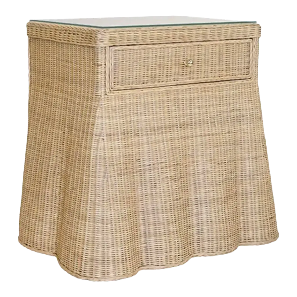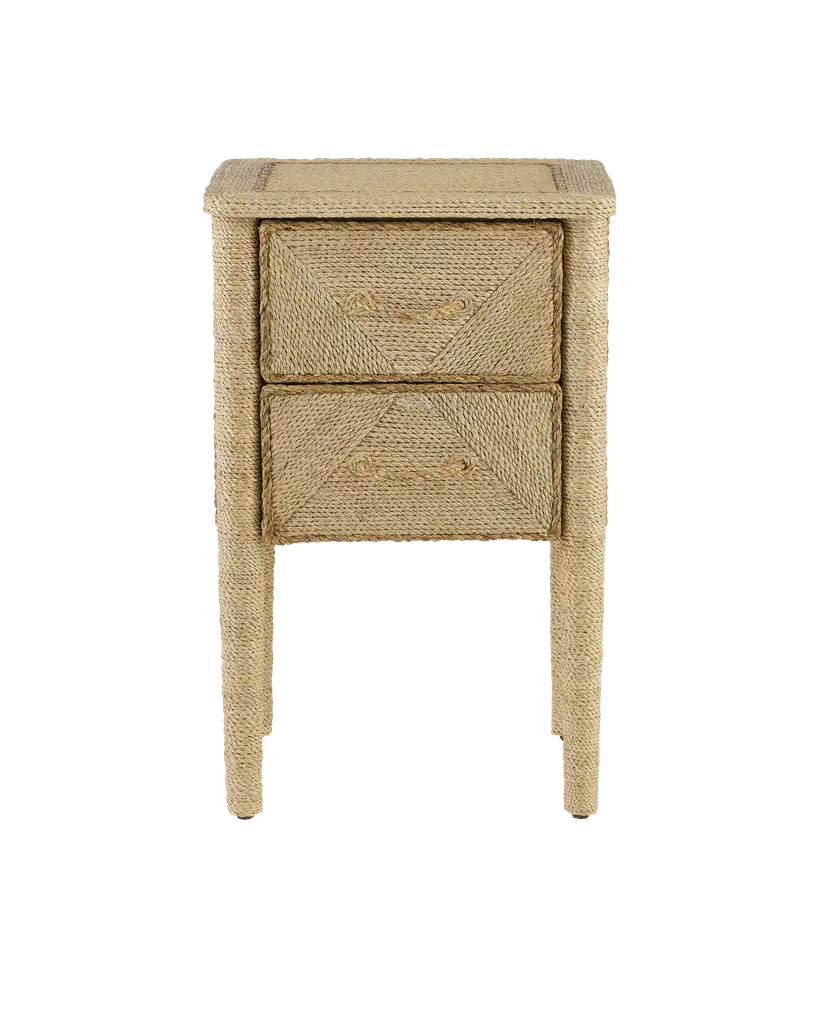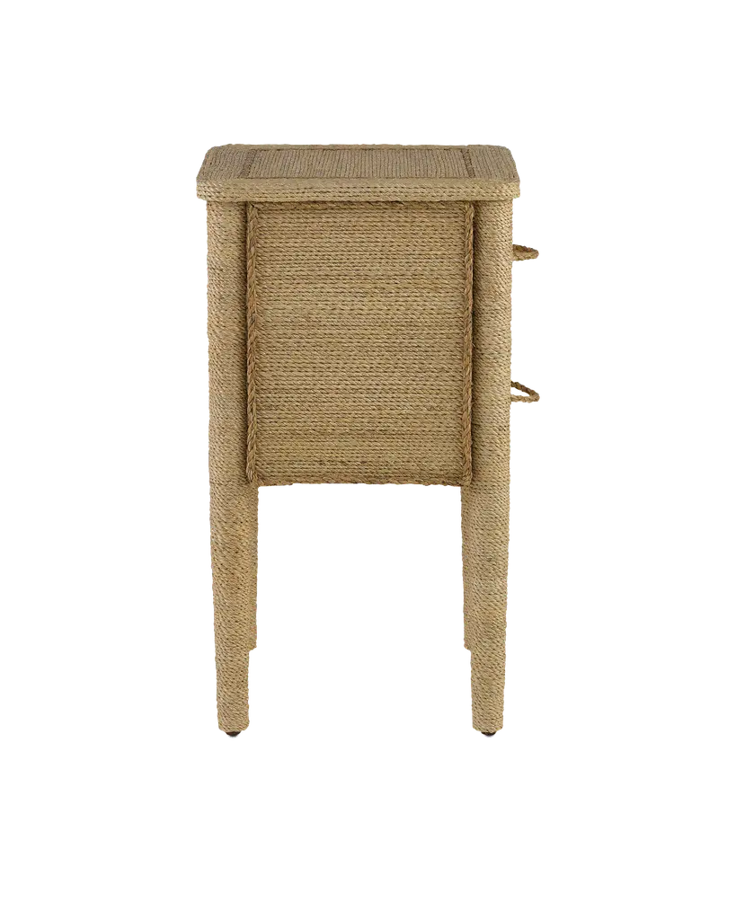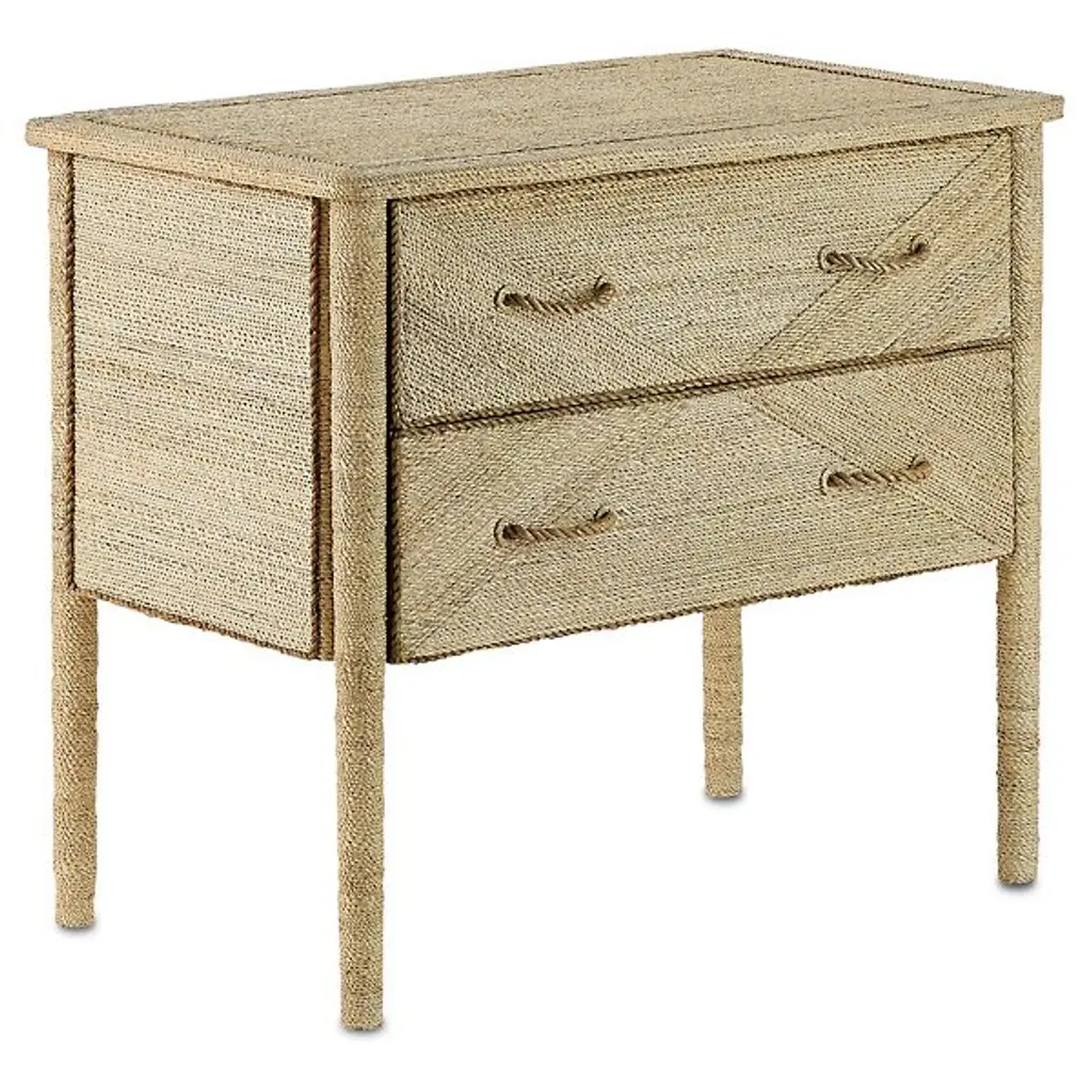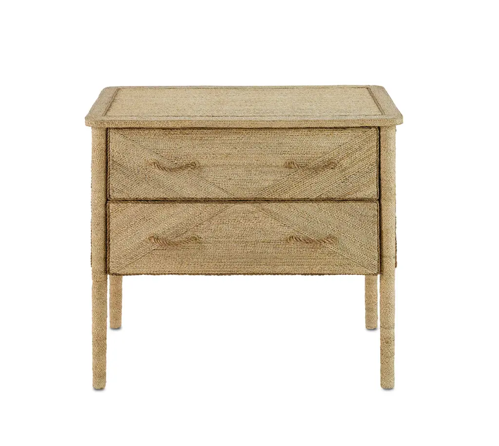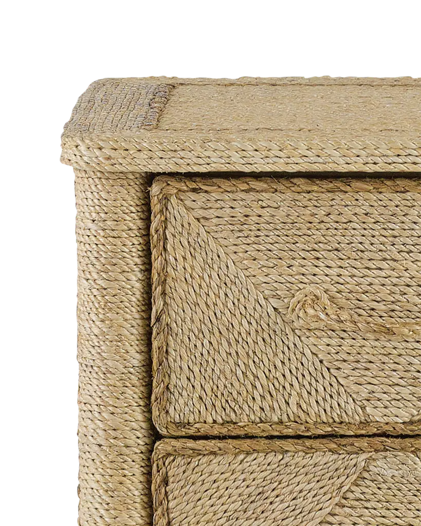 The Kaipo Rope Nightstand is wrapped artistry with its exterior and drawer-fronts covered painstakingly in Abaca rope. The heftier rope drawer-pulls give this piece a nautical feel. The rope nightstand is one of our artisanal pieces that requires great skill to create, as the sisal is painstakingly hand-applied to each piece. Wipe clean with a soft, dry cloth or static duster. Always avoid the use of harsh chemicals or abrasive cleaners as they may cause damage to the item's finish. Due to the use of natural materials, handmade craftsmanship, or hand finishing, expect some color variances. Hand crafted pieces may have slight size differences.