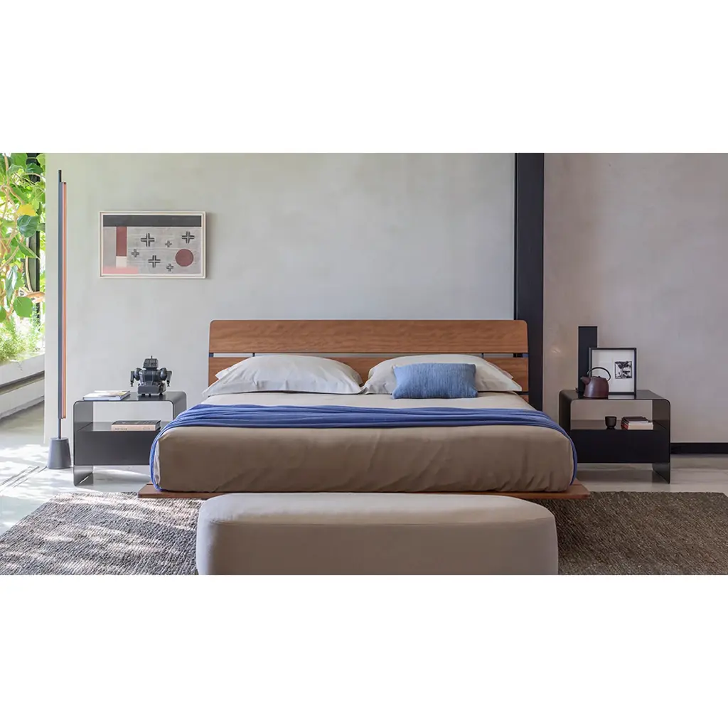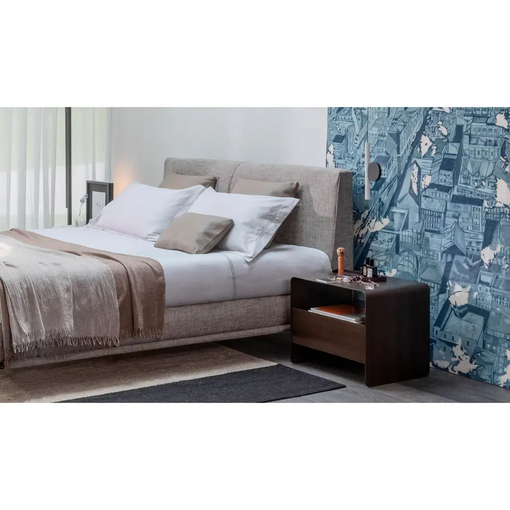 Foglio is a nightstand in metal, with light and essential lines. It has been created from a simple sheet of harmoniously curved metal, in the finishes anodic bronze, burnished, white, greige, black, oxide, silver oxide or desert rock inside of which there is an almost suspended storage compartment with a drawer and a shelf. The frontal panel of the drawer is available in the same finish as the structure or mirror in the smoked or bronze finish.