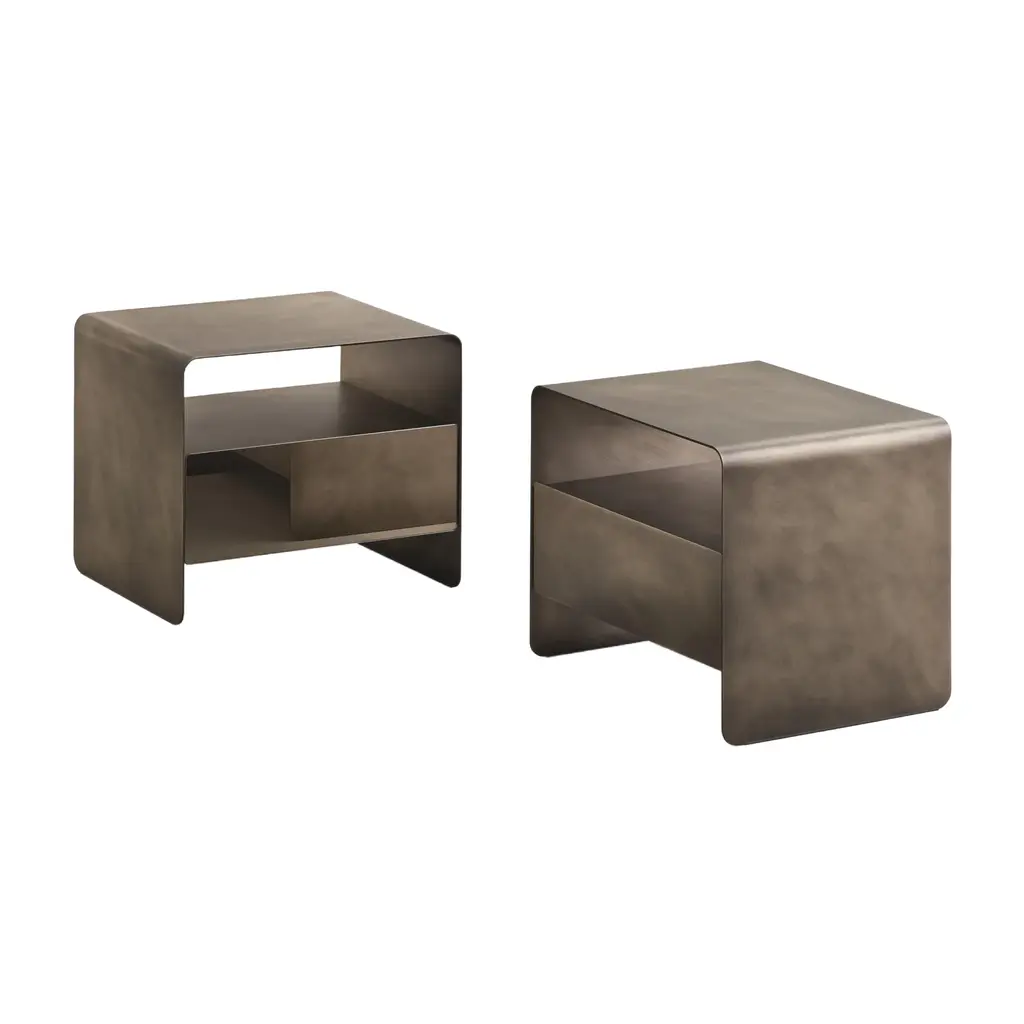 Foglio is a nightstand in metal, with light and essential lines. It has been created from a simple sheet of harmoniously curved metal, in the finishes anodic bronze, burnished, white, greige, black, oxide, silver oxide or desert rock inside of which there is an almost suspended storage compartment with a drawer and a shelf. The frontal panel of the drawer is available in the same finish as the structure or mirror in the smoked or bronze finish.