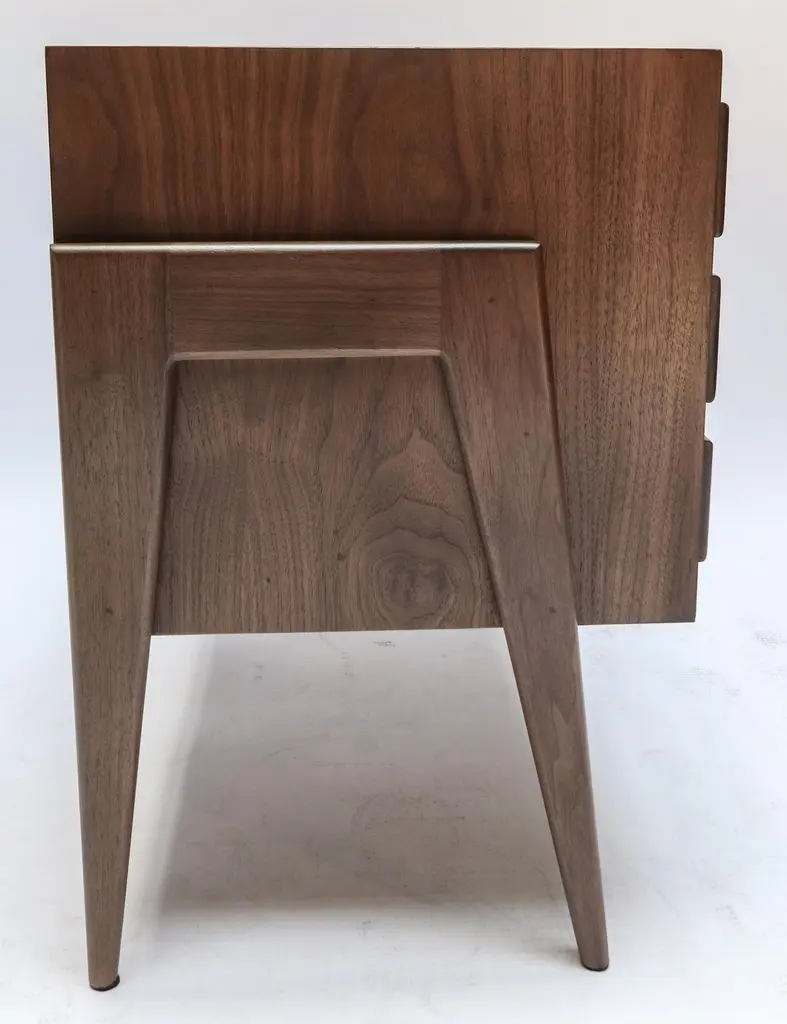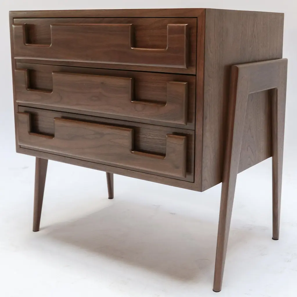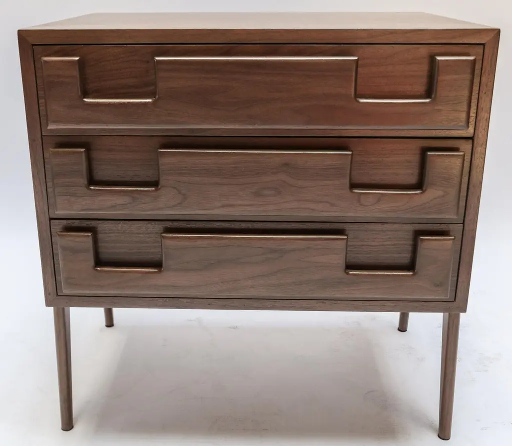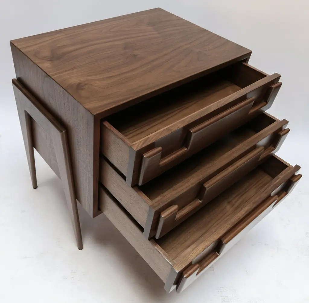 Custom midcentury style nightstands made in American walnut with three drawers. Made in Los Angeles by Adesso Imports. Can be done in different sizes and wood.