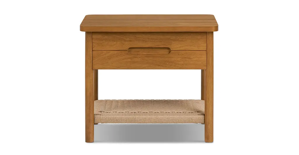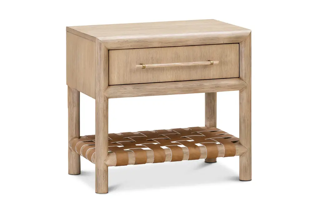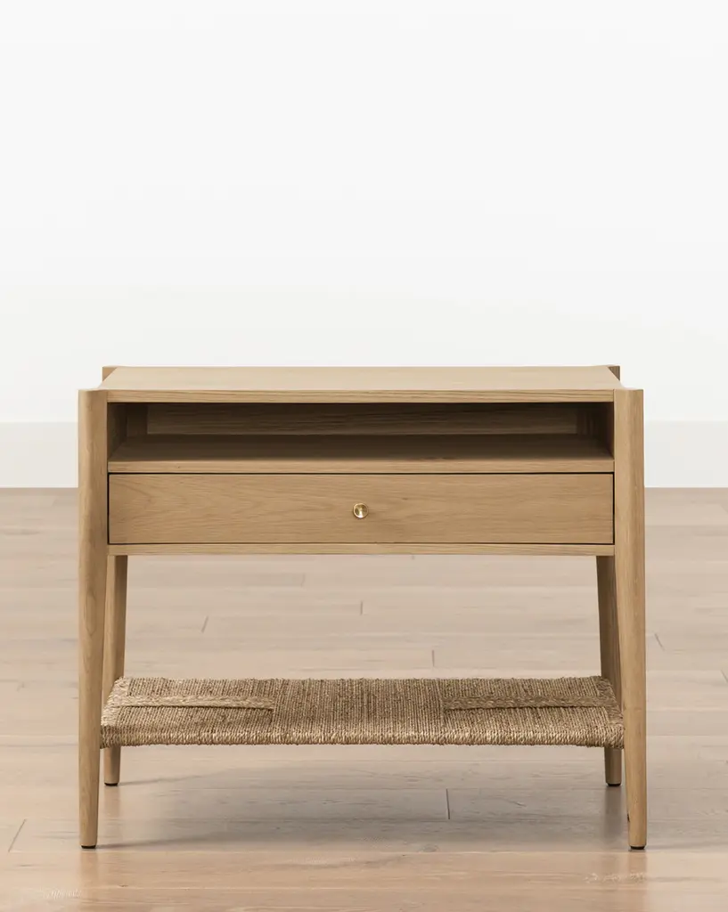 From its open shelving to its soft close drawer, the Dana White Oak Nightstand is all about the details. Crafted from white oak, this elevated but casual nightstand is finished with brass hardware and an endearing woven seagrass shelf.