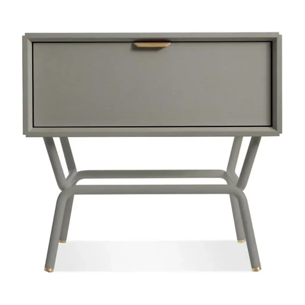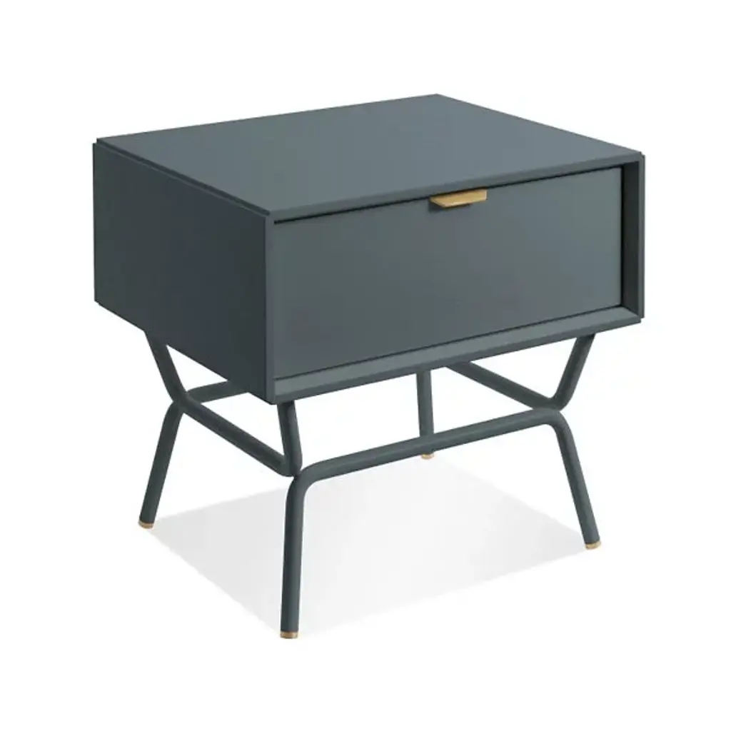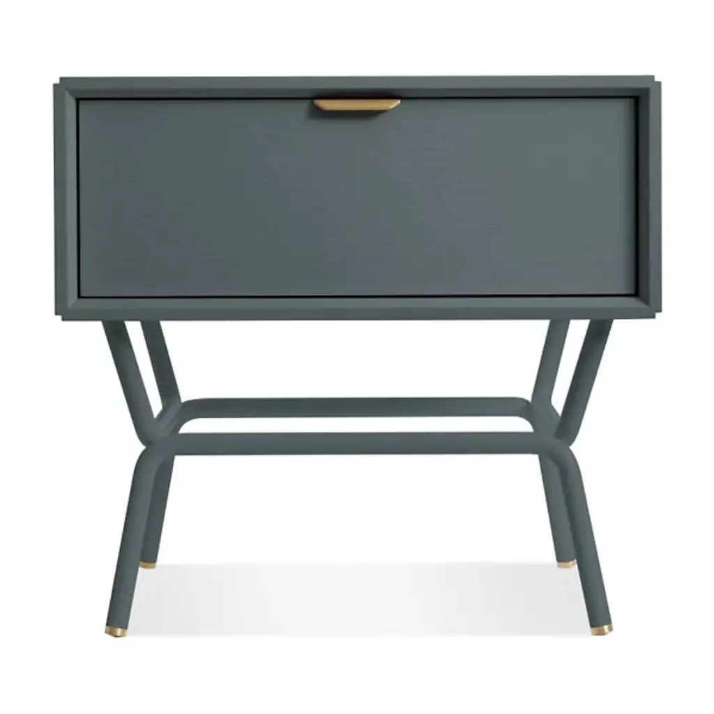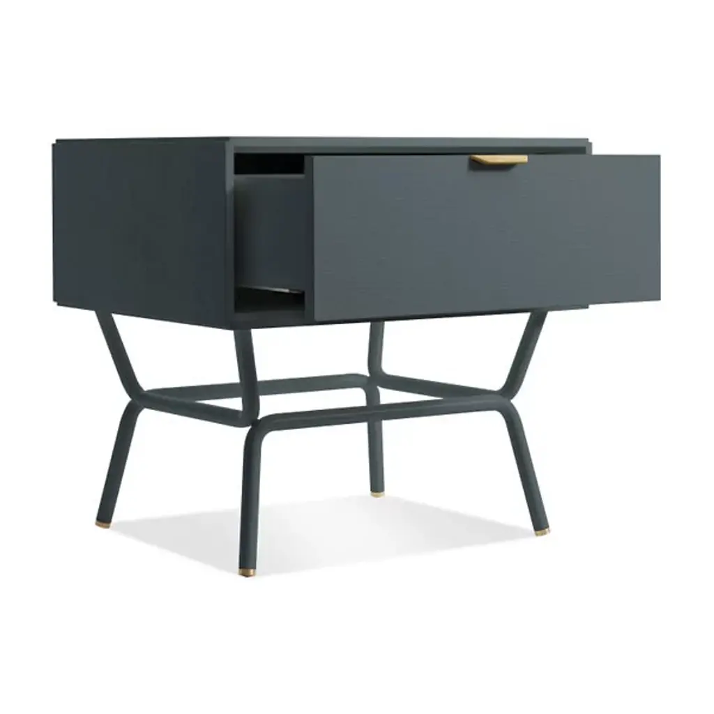 Accented with retro-inspired charm and Precision-crafted for the refined setting. One can’t help but repeat the name of the Dang 1 Drawer Nightstand from Blu Dot once nestled elegantly to the edge of one’s bedframe. The piece gets one to crack a smile as a style-minded modern design. It stands with an attractive figure of tapered steel contours. These airy contours give the boxed structure above a dramatic presentation. The wood veneer structure offers a wide table surface fit for a lamp and reading material. Its drawer opens quietly with an antique brass handle. The drawer offers enough space for a bevy of nighttime essentials.