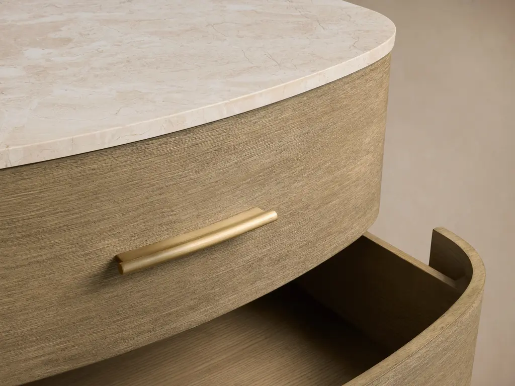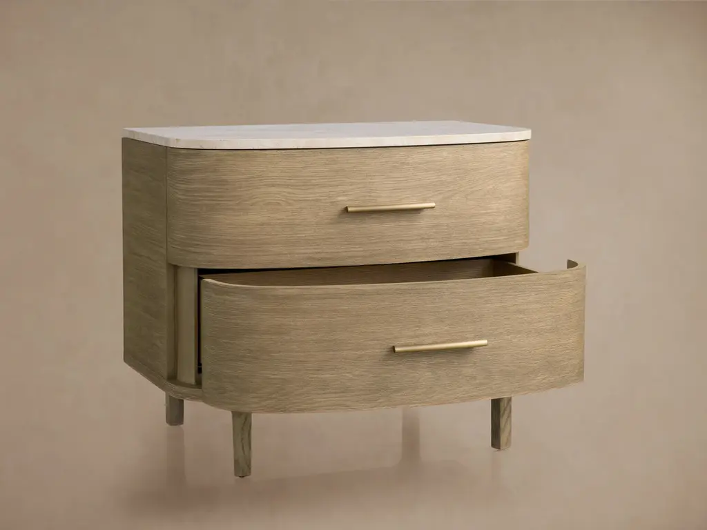 Elevate your bedroom oasis with our Danny Bedroom Collection. Crafted from oak wood with beautiful hand-applied finishes, Danny’s gently curved silhouettes elevate your space with wood or marble tops and contrasting brass pulls.