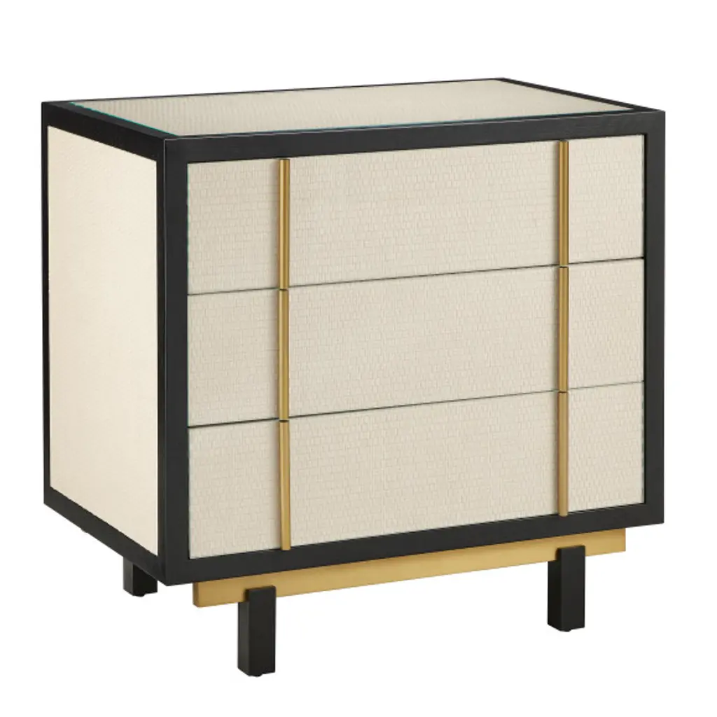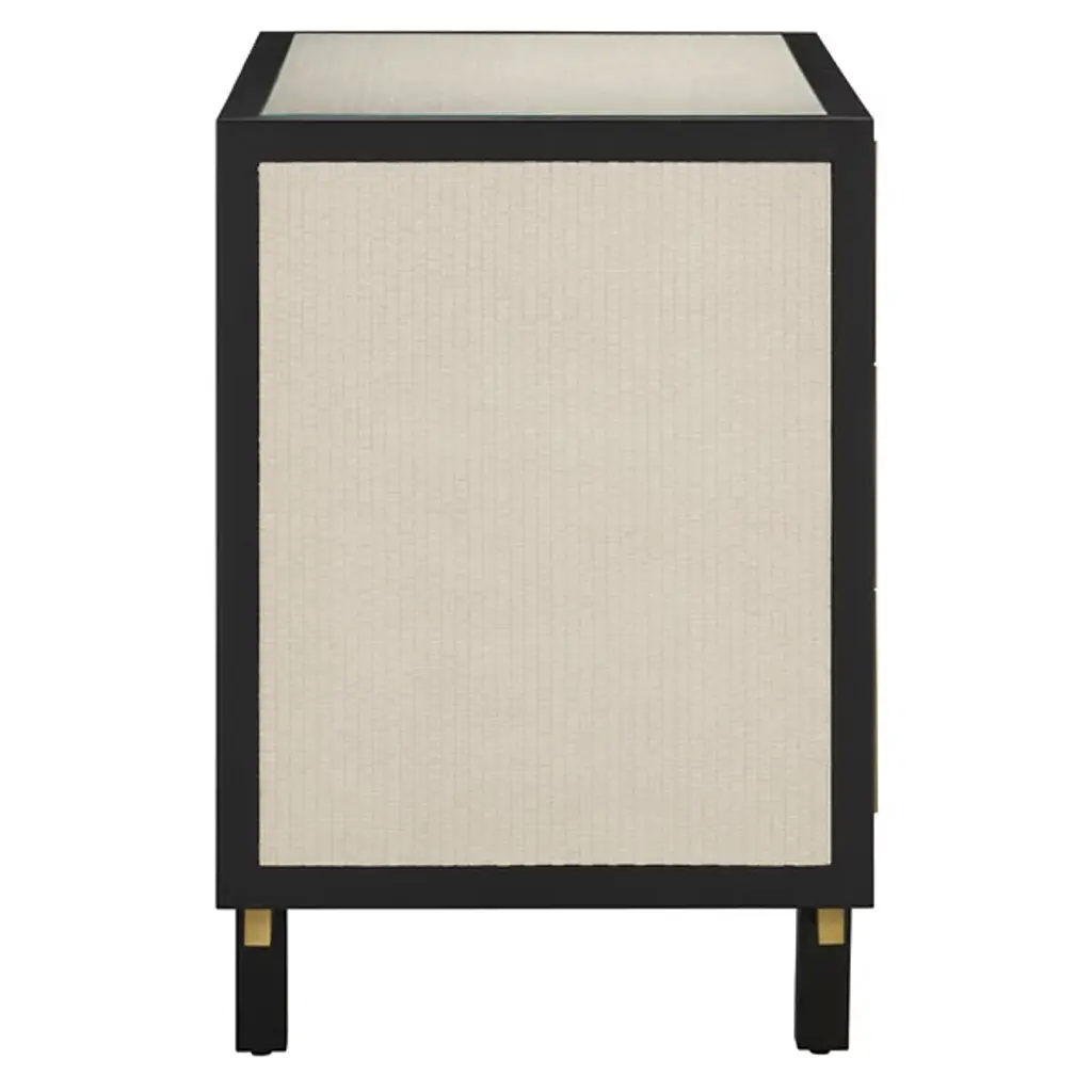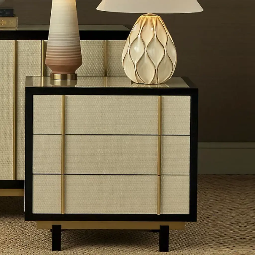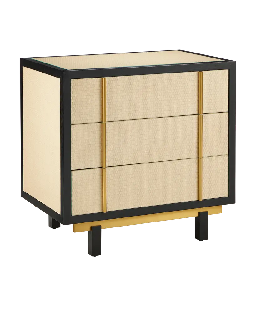 The Deanna Raffia Nightstand from Currey & Company elevates bedside storage to an art form. Intricately woven raffia adorns the drawer fronts, sides, and top, creating a rich tapestry of texture framed by understated wood trim. Brushed brass drawer pulls add a hint of sophistication, while the plinth base gives the nightstand a floating appearance. A protective glass top preserves the raffia's delicate beauty without compromising its visual impact.
