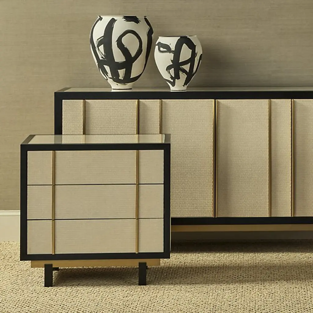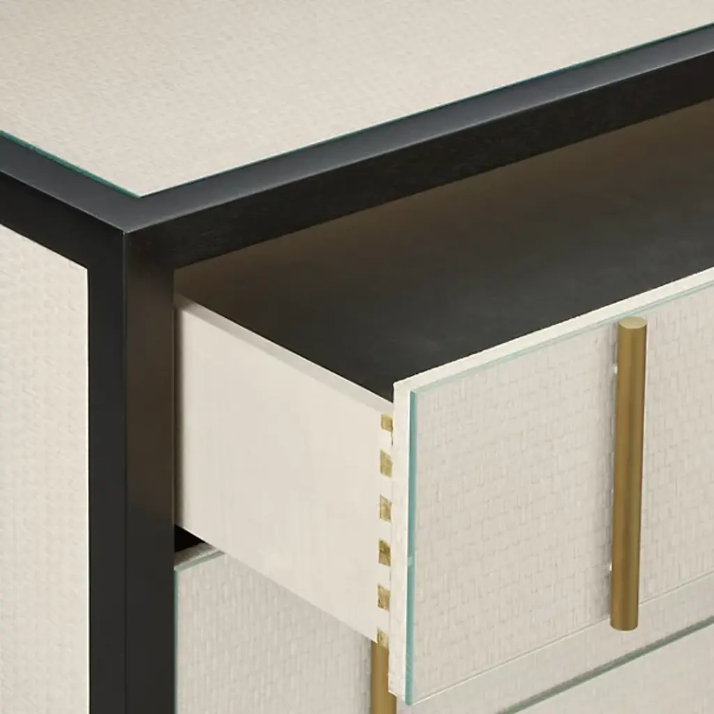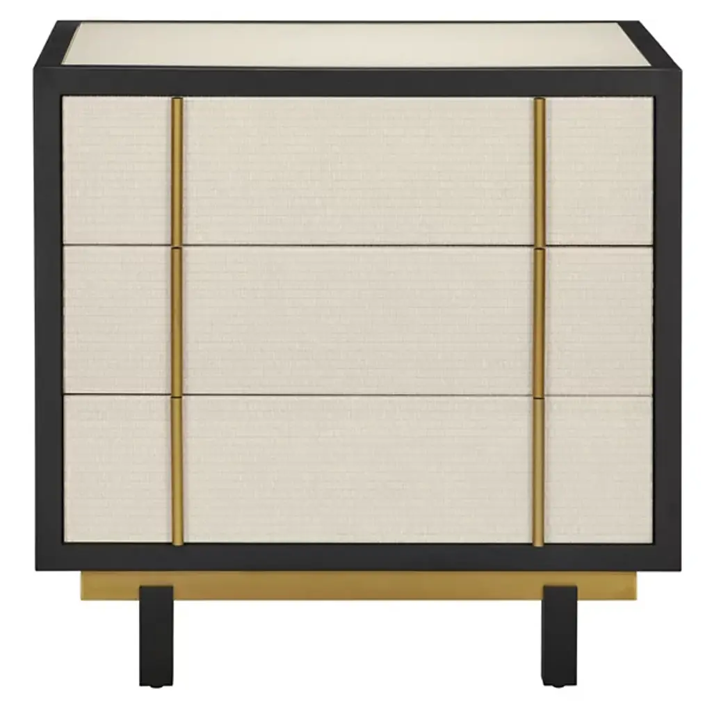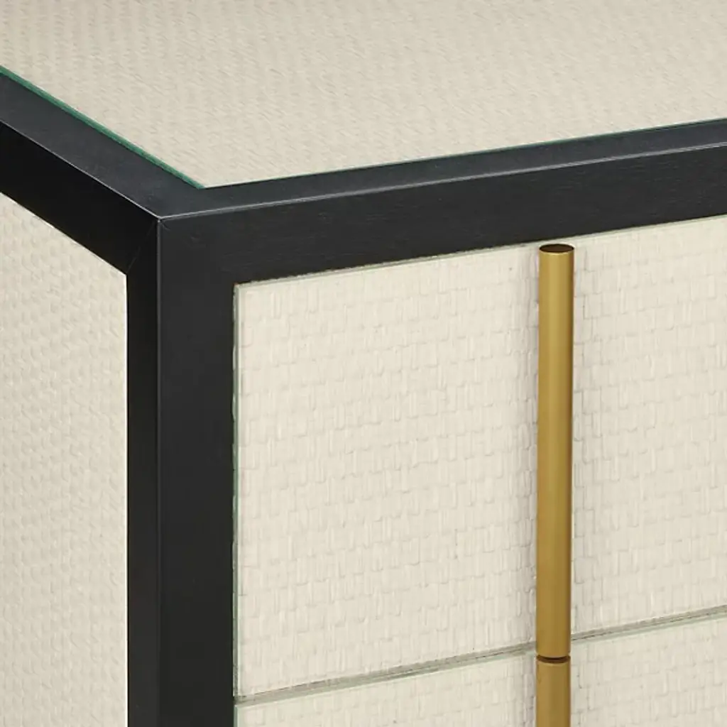 The Deanna Raffia Nightstand from Currey & Company elevates bedside storage to an art form. Intricately woven raffia adorns the drawer fronts, sides, and top, creating a rich tapestry of texture framed by understated wood trim. Brushed brass drawer pulls add a hint of sophistication, while the plinth base gives the nightstand a floating appearance. A protective glass top preserves the raffia's delicate beauty without compromising its visual impact.