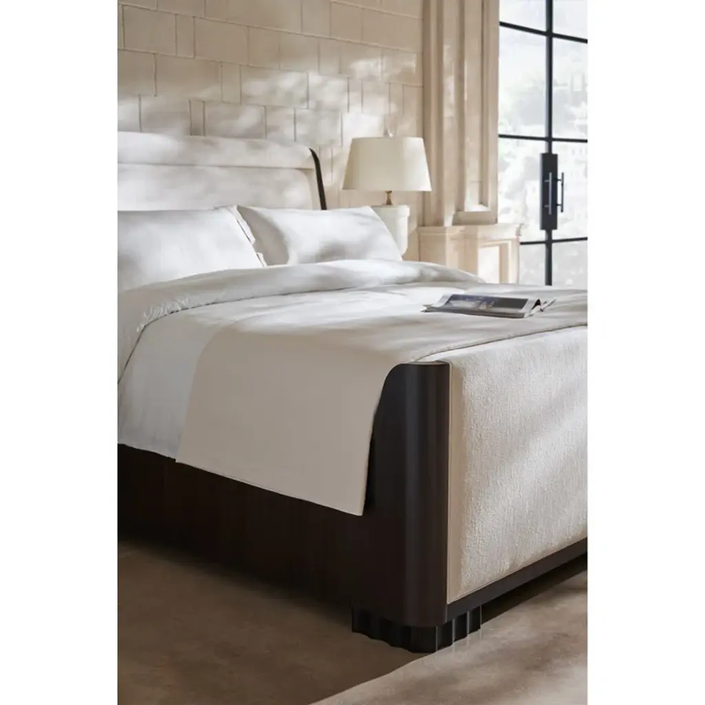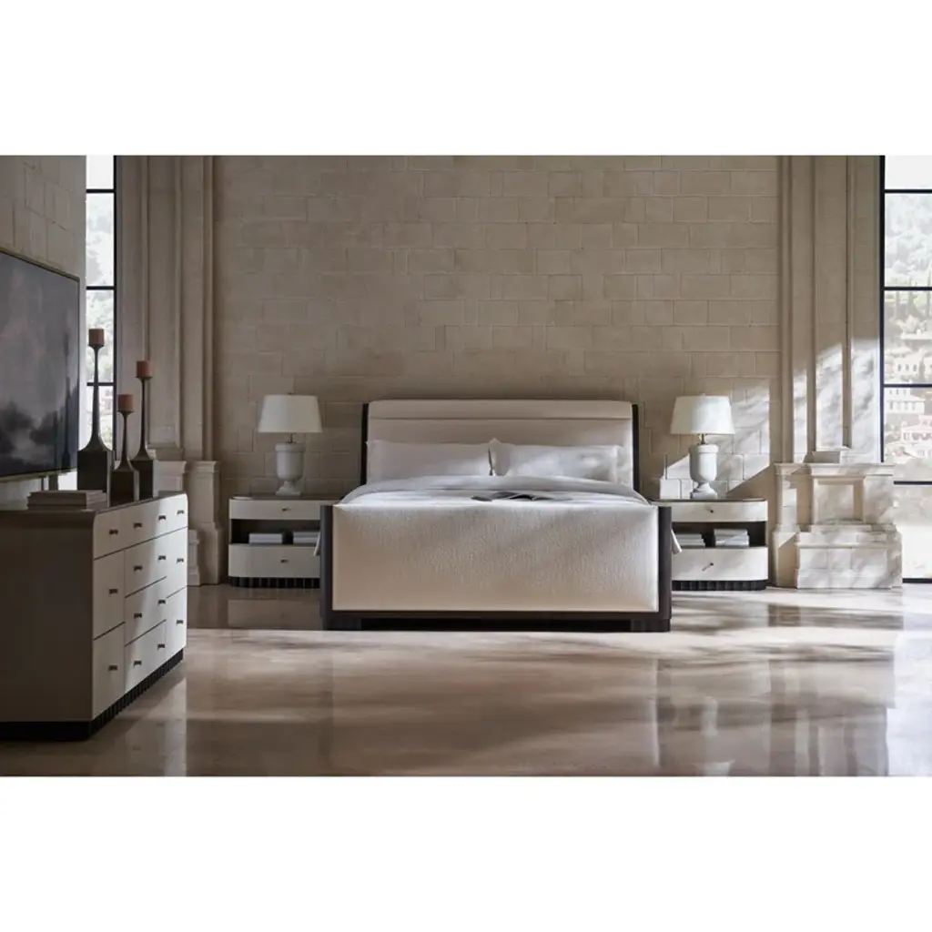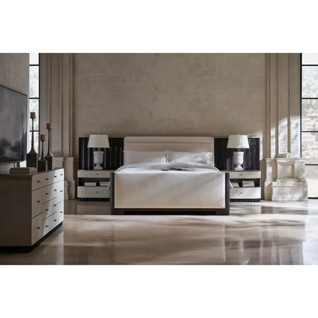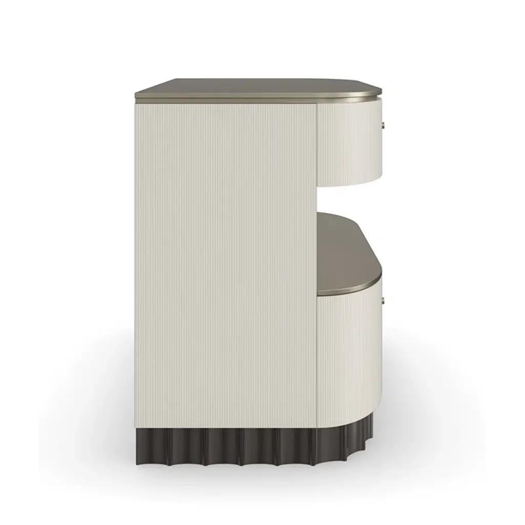 Designed with the utmost attention to detail, this bedside table celebrates the timeless beauty of neoclassical architecture. Features two drawers with soft corners and vertical micro fluting in ivory paint, separated by open space for bedside storage and display. A brushed whisper of gold on top adds warmth and a note of luxe, accentuated by an overscaled fluted base in a richly contrasting, dark chocolate finish.