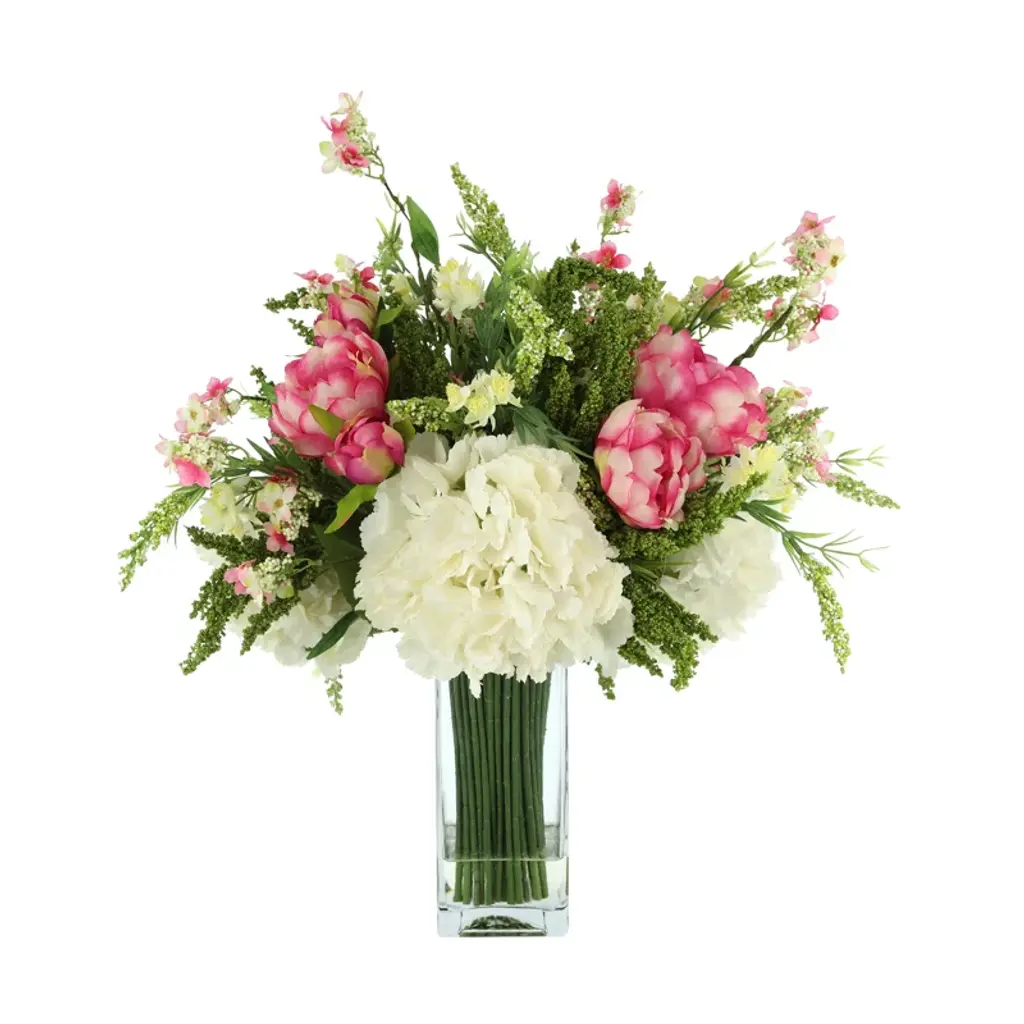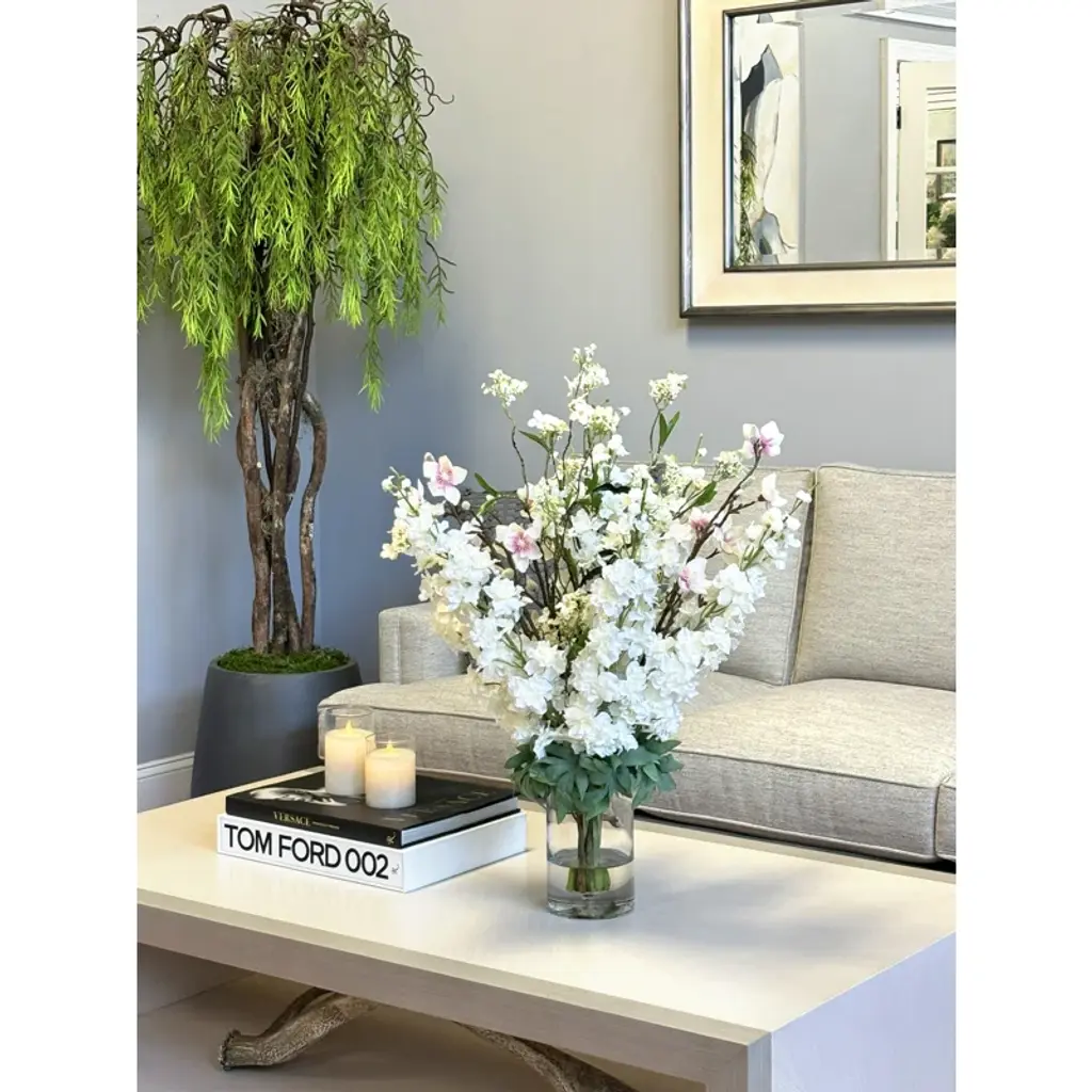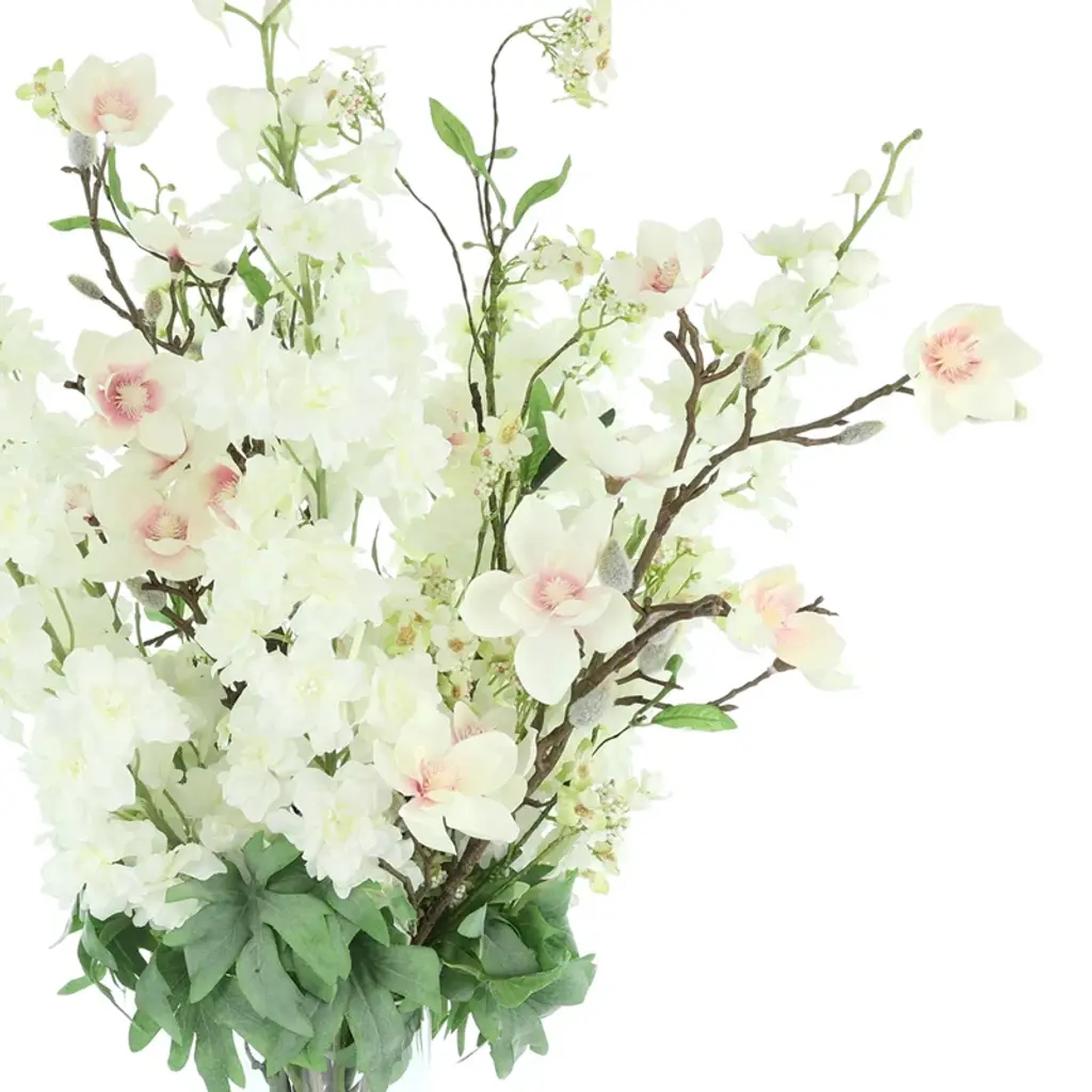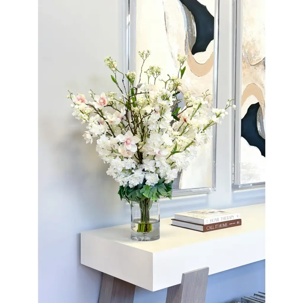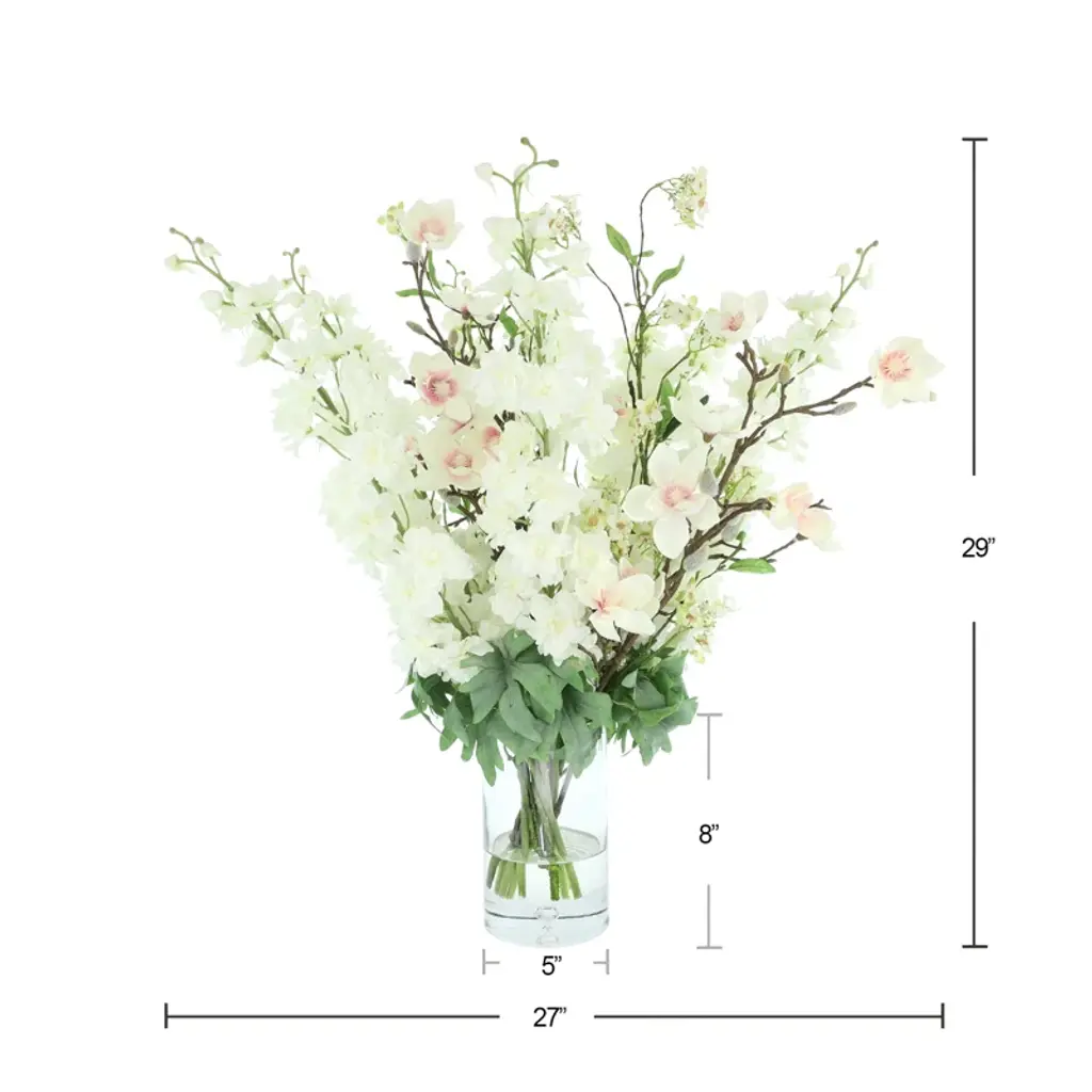 Bring the beauty of fresh blooms into your space with our faux arrangement, perfectly arranged in a sleek glass vase. Featuring lifelike butterfly magnolias and delphinium, this arrangement is set in crystal-clear acrylic water, adding an elegant touch that enhances its authenticity. Say goodbye to the hassle of watering or wilting petals—this maintenance-free bouquet arrives ready to display, staying vibrant and flawless every day of the year. Whether it’s your dining table, office desk, or bedside, these tulips will elevate any room with a timeless charm.
