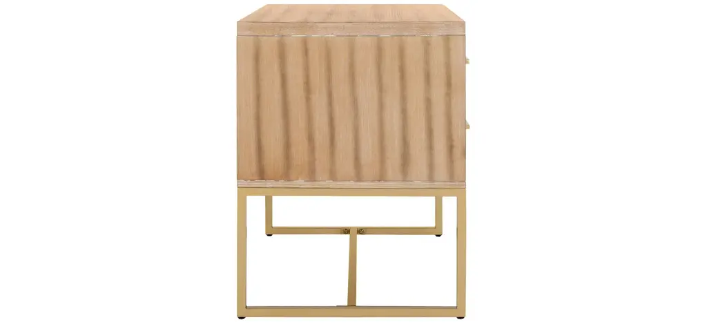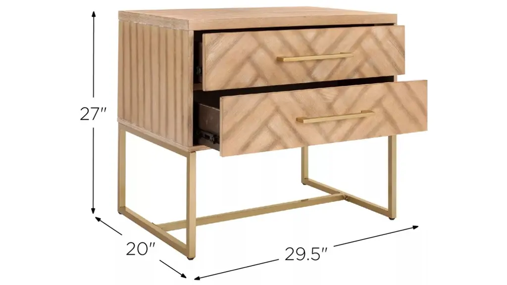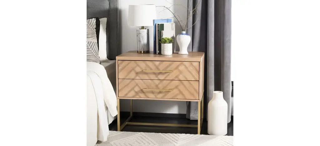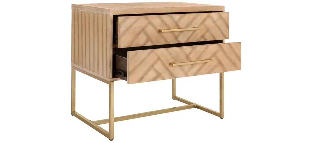 Alive with natural beauty and a dynamic modern pattern, this contemporary Devon nightstand brings _lan to any bedroom. Designed with an oak finish and substantial brass metal hardware and legs, its generous two drawers make it as functional as it is stylish.