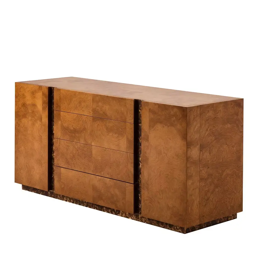 Diadema is a series composed of a chest of drawers, a dressing table, and a bedside table covered in myrtle briar and steel in gold leaf treated with oxide. Essential design, with precious details: from the inside of the drawers covered in canvas to the soft-touch guides, up to MDF and plywood with myrtle briarwood veneer stained in walnut. The handles are obtained from wood processing, the pure exaltation of the tidiness of the design.
