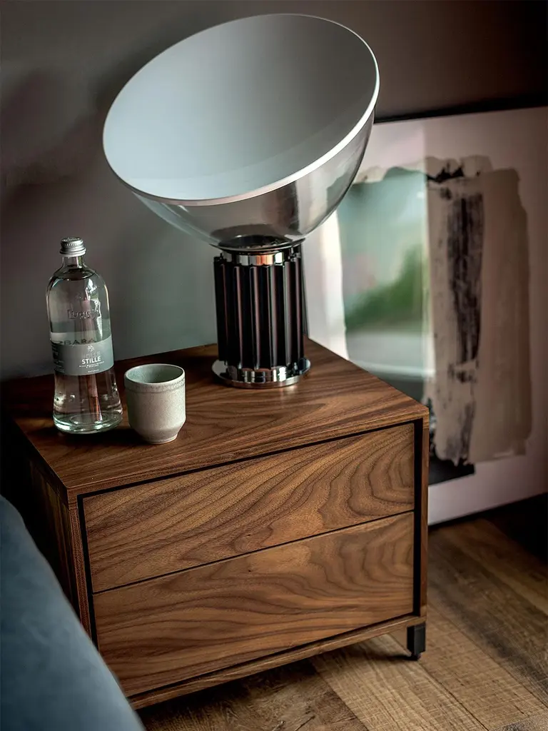 Nightstand Dina walnut with structure in solidwalnut wood, With 2 drawers with push-pull system,on metallic runners. With 4 feet in iron lacquered inirondusct color finish.