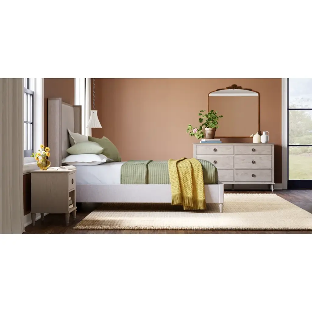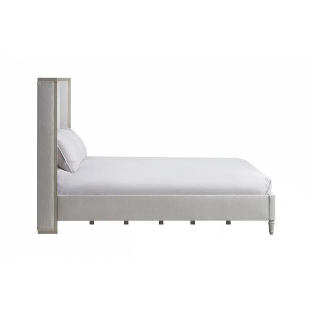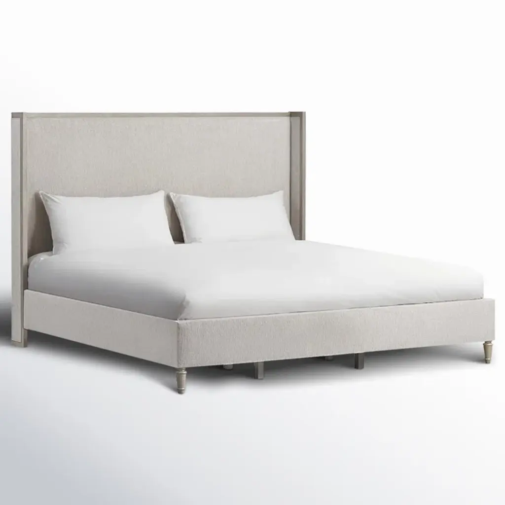 The Dinora Upholstered Bed offers a French contemporary design reflected in the details, enriching the visual effect of the whole bedroom. The fabric is interwoven with yarn which offers a delicate and heavy texture. The unique shape of the feet with its conical and rounded curves displays the medieval European style and provide a stable support and sufficient clearance from the ground to facilitate cleaning. Pair it with one of our Dinora nightstands and dressers for a complete look.