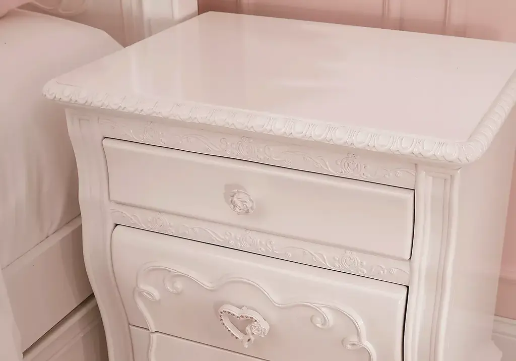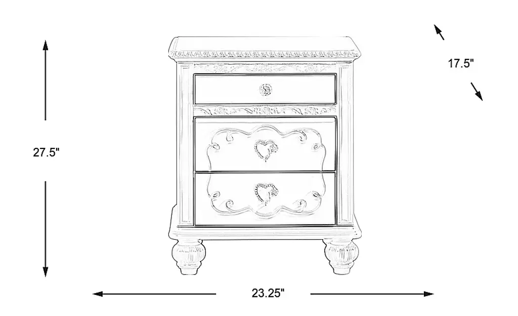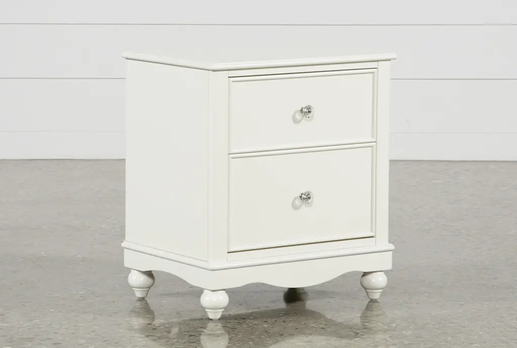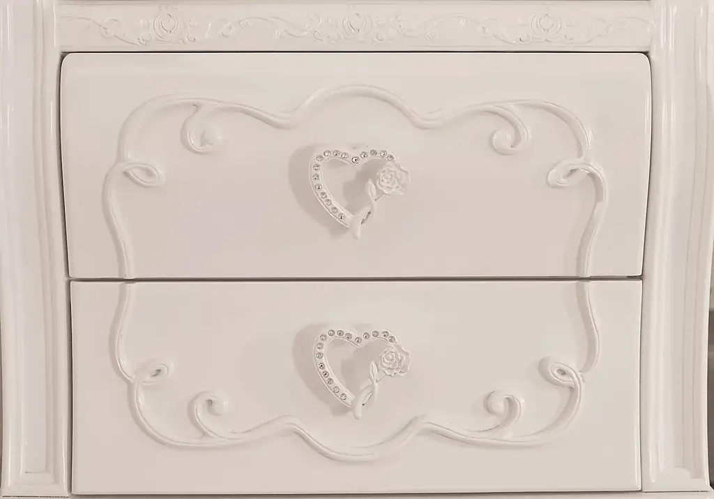 Perfect for bedside storage of her favorite fairy tales and treasures, the Disney Princess nightstand keeps everything close at hand. This nightstand is made of wood solids with birch veneers in a sparkling white finish that's sure to keep your very own princess happy. The ribbon design detail, inlaid crystalline bead feature and acrylic crystal heart-shaped pulls on the drawers will always make her feel like a princess.