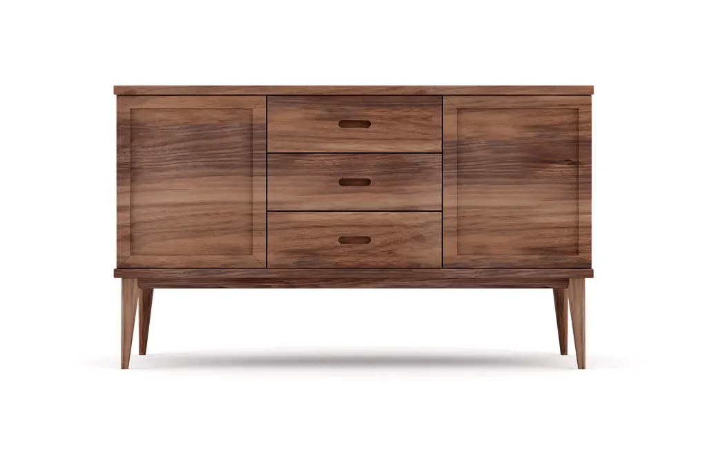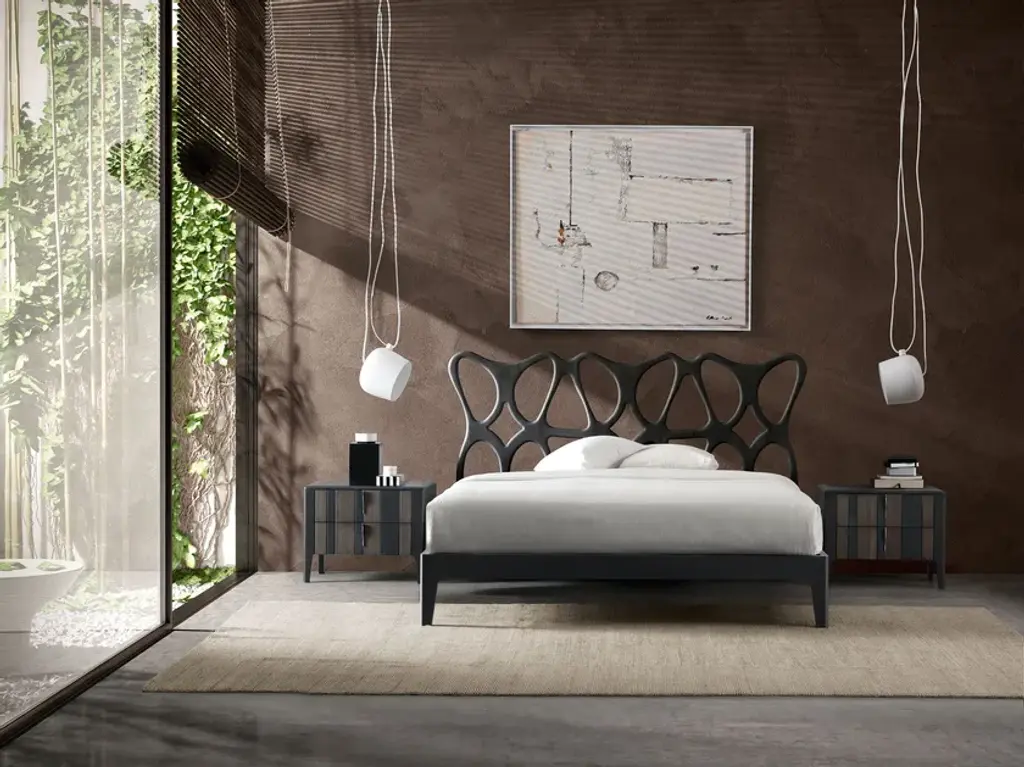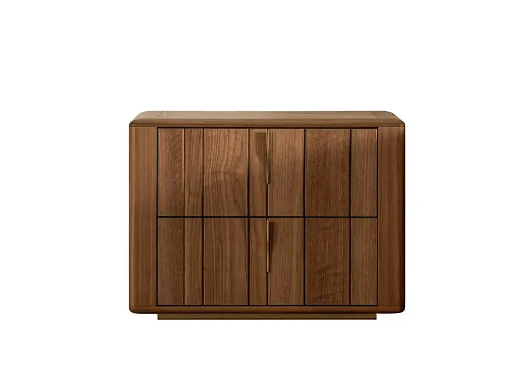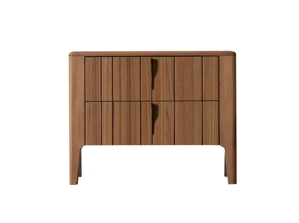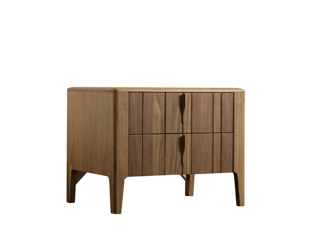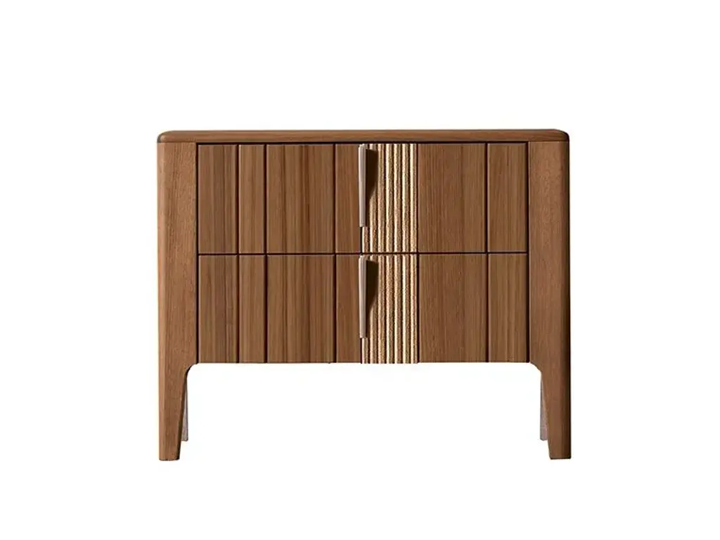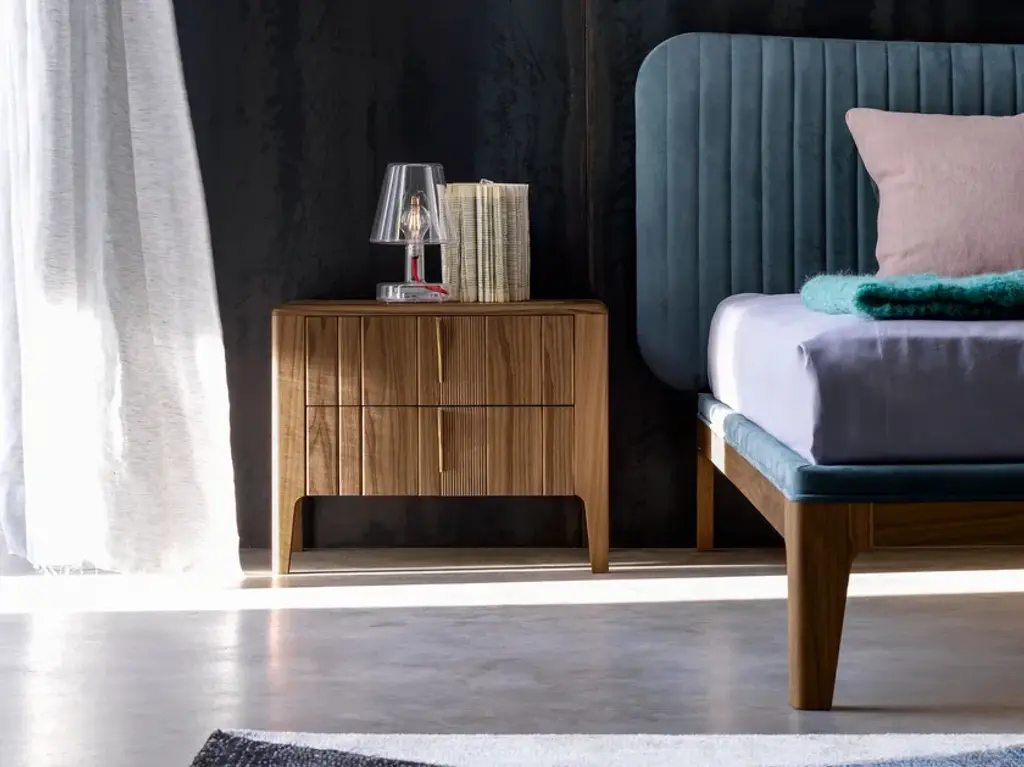Rectangular wooden bedside table with drawers from the DOMINO collection.Nightstand 2 drawers, smooth wooden slat, metal handle. Havana Canaletto finish, Bronze metal.13 finishes available, marble top, 3 metal finishes.
