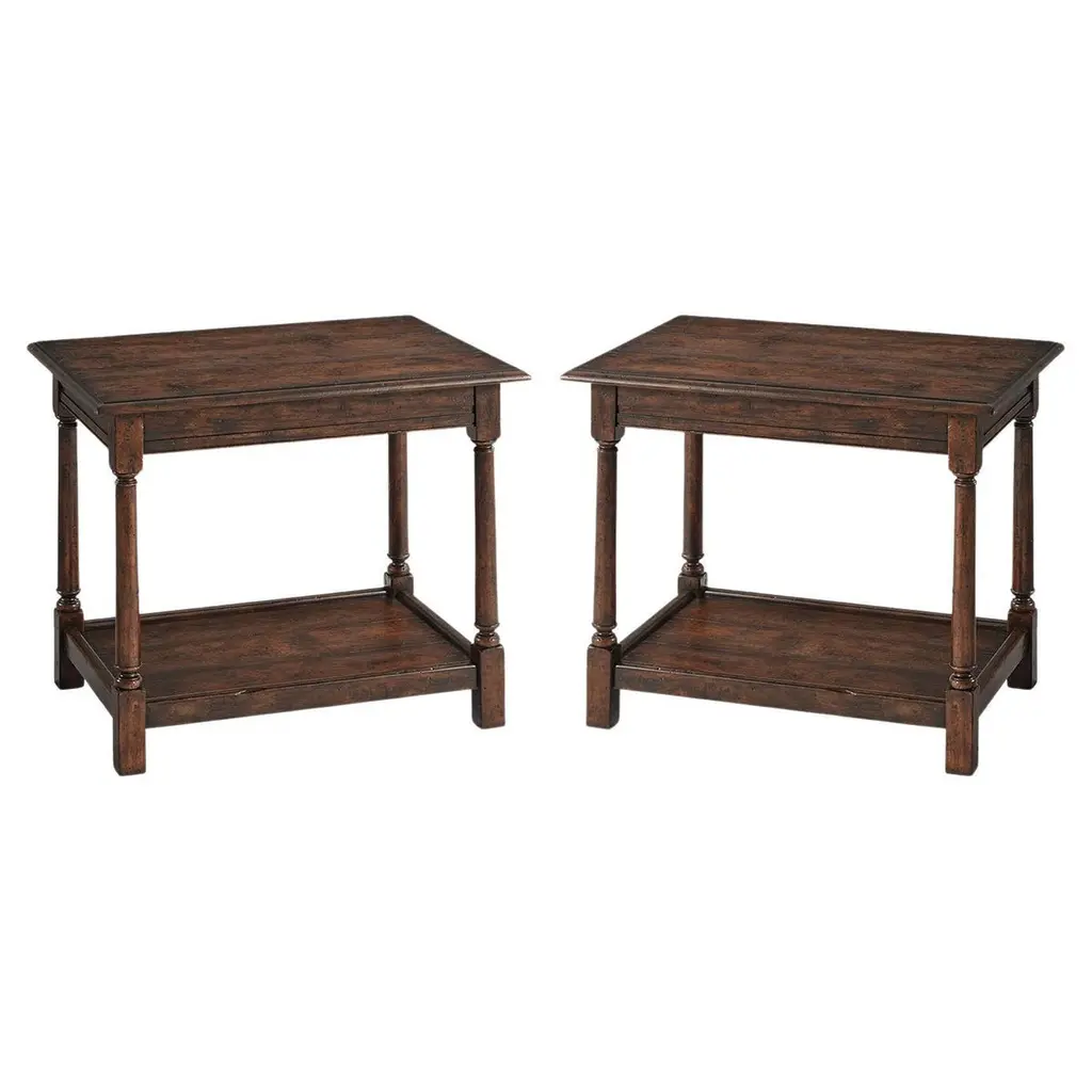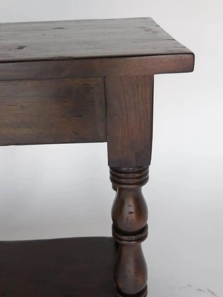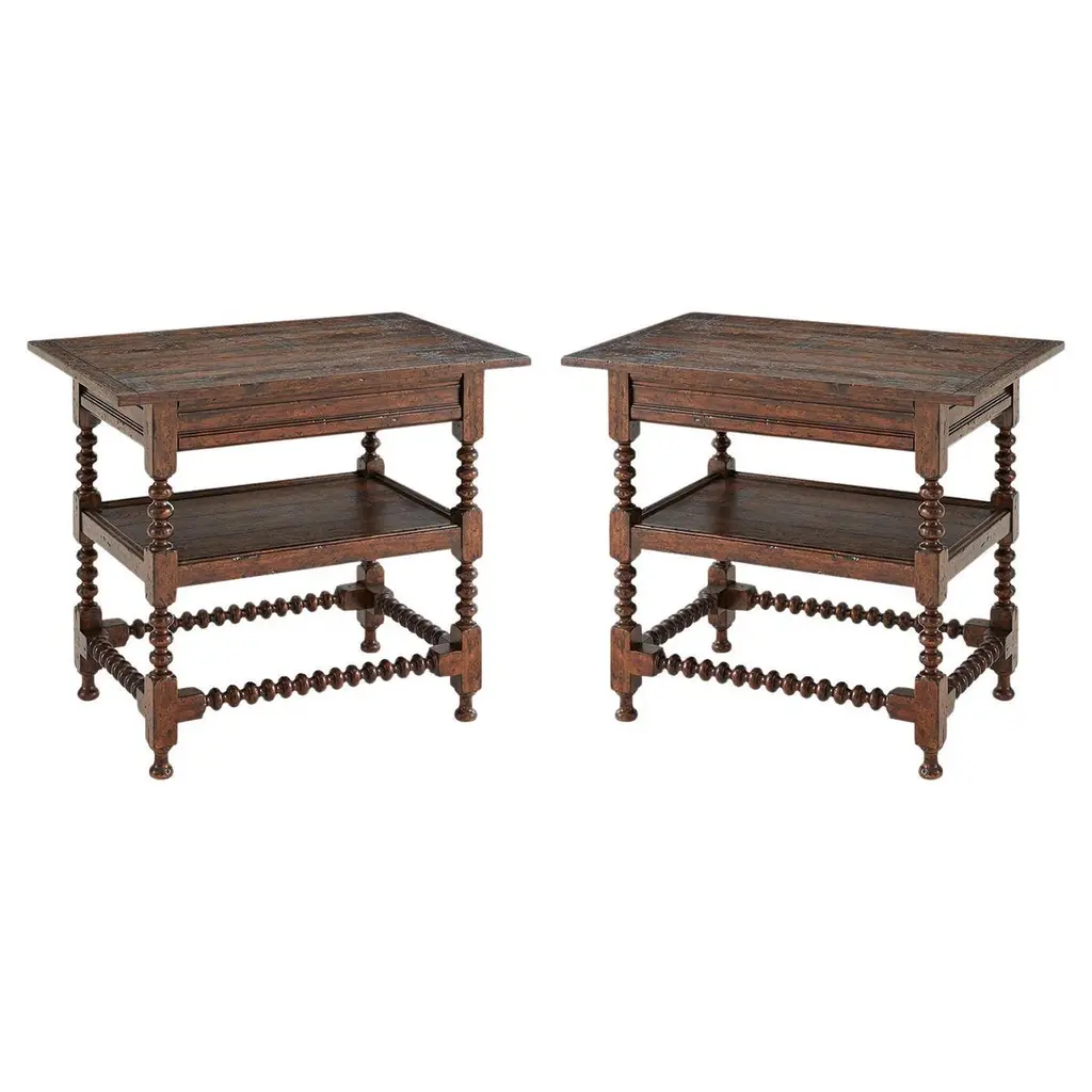 Custom walnut side tables or nightstands with drawer. Legs are turned and end in a low shelf. Made in Los Angeles by Dos Gallos Studio. PRICED PER PIECE Made to order. As shown in Dark Walnut and Medium to Heavy distress. Can be made in any size and finish.PRICES ARE SUBJECT TO CHANGE. PLEASE INQUIRE BEFORE PLACING AN ORDER. CUSTOM ORDERS ARE NON RETURNABLE. FINAL SALE