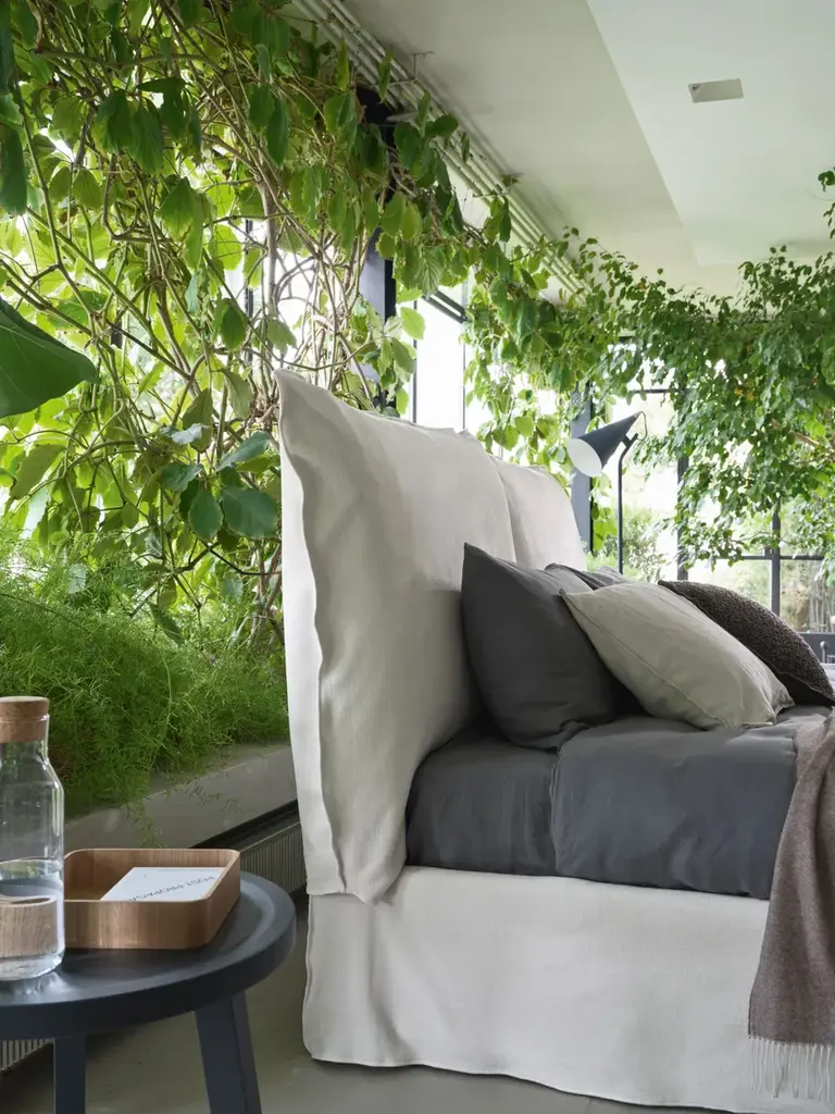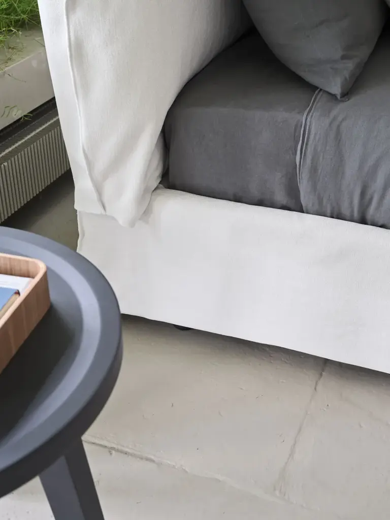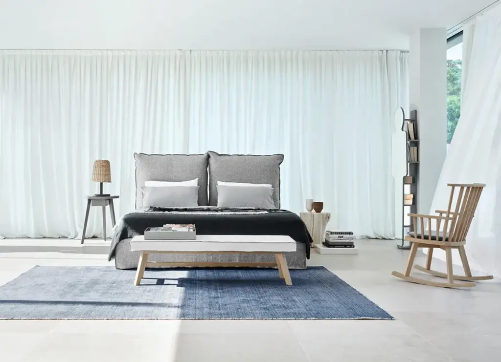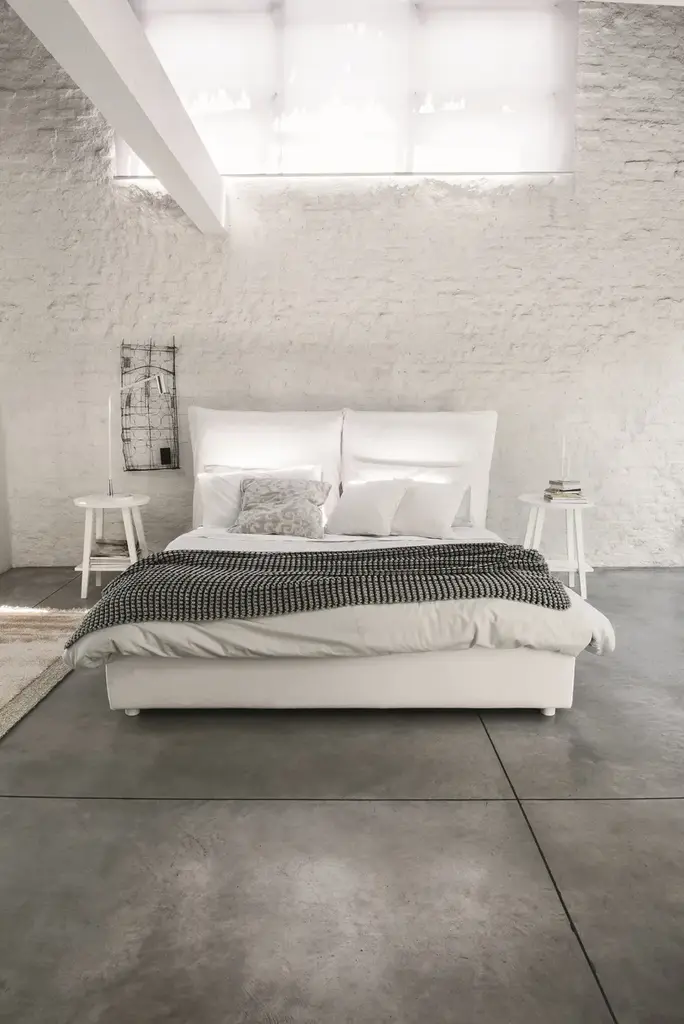 Soft and reassuring shapes inviting you to relax are what characterise Double, a removable upholstered bed, which comes with a large headboard and two oversized cushions. Double is a textile bed with a classic charm, available with visible solid wood feet in natural walnut, black, white, grey, ocean or dove-grey and with possible free-bottom covering down to the ground.Beds is a wide and varied collection dedicated to the various ways of conceiving the sleeping area. A true relaxation area, the bedroom focuses on comfort, research of materials and attention to detail through a range of products characterised by extraordinary transversality, suitable for any type of home. With removable textile beds and sofa beds, there are bedside tables, chests of drawers, desks, armchairs and accessories designed for different spaces and lifestyles that make the sleeping area functional and dynamic, giving it an unexpected touch of originality and style.