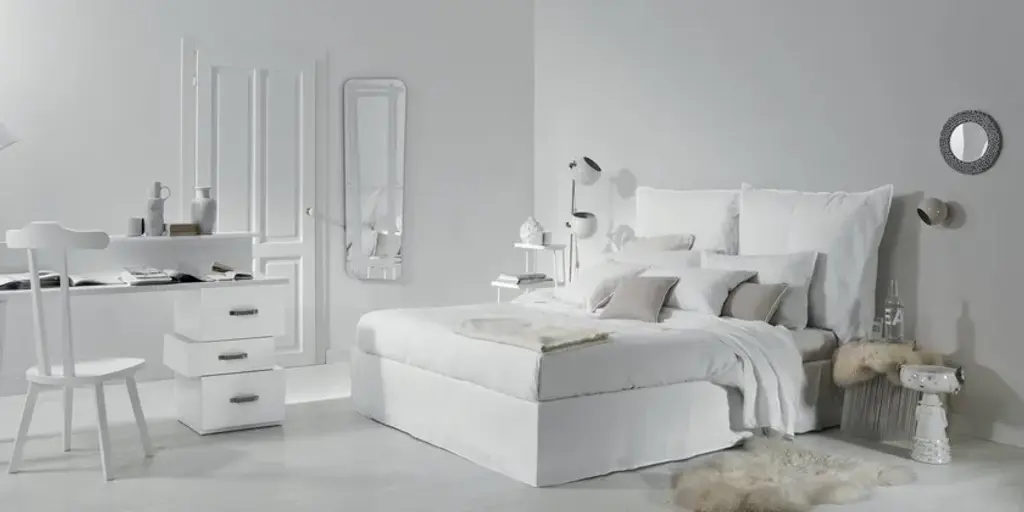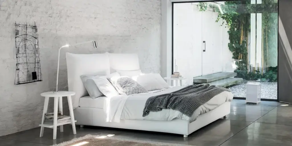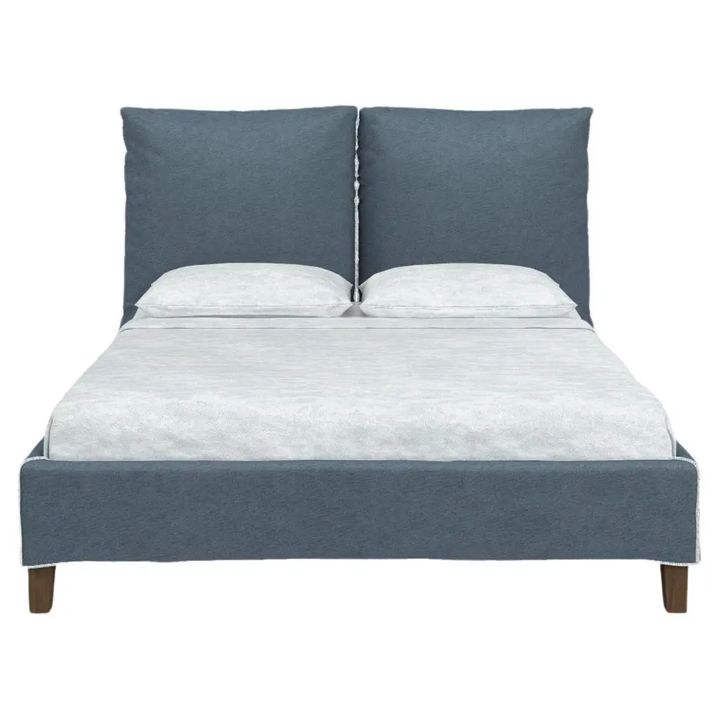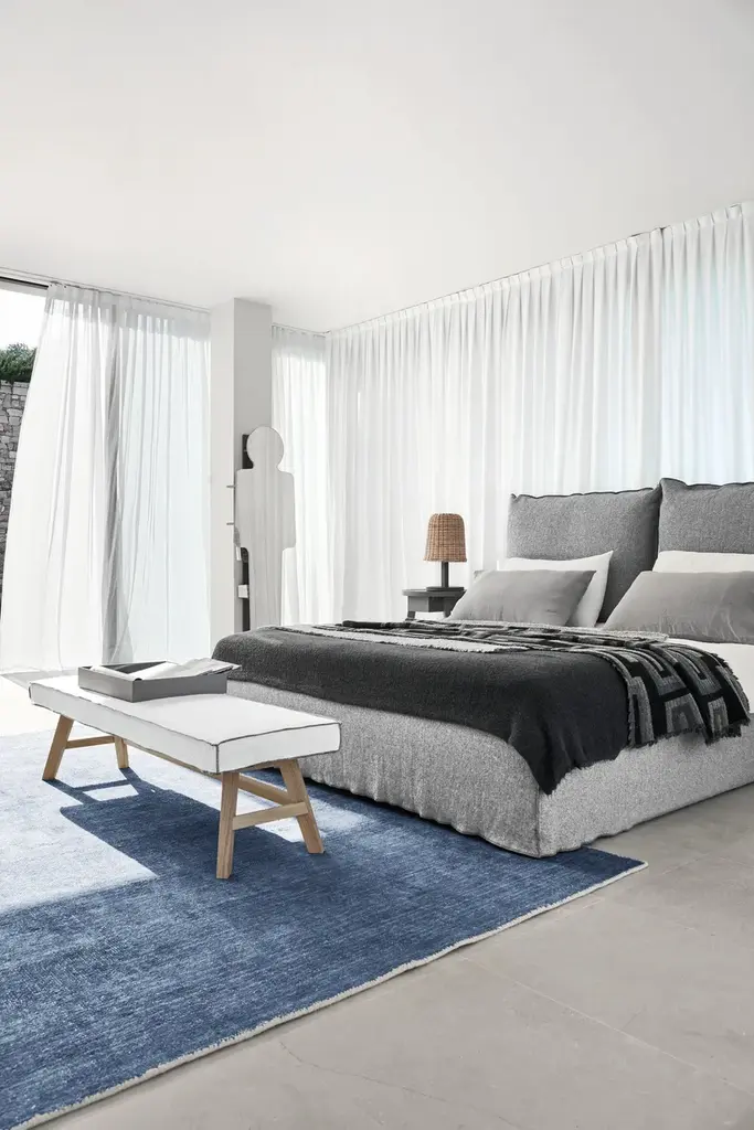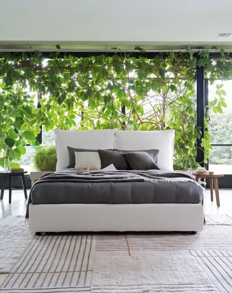Soft and reassuring shapes inviting you to relax are what characterise Double, a removable upholstered bed, which comes with a large headboard and two oversized cushions. Double is a textile bed with a classic charm, available with visible solid wood feet in natural walnut, black, white, grey, ocean or dove-grey and with possible free-bottom covering down to the ground.Beds is a wide and varied collection dedicated to the various ways of conceiving the sleeping area. A true relaxation area, the bedroom focuses on comfort, research of materials and attention to detail through a range of products characterised by extraordinary transversality, suitable for any type of home. With removable textile beds and sofa beds, there are bedside tables, chests of drawers, desks, armchairs and accessories designed for different spaces and lifestyles that make the sleeping area functional and dynamic, giving it an unexpected touch of originality and style.