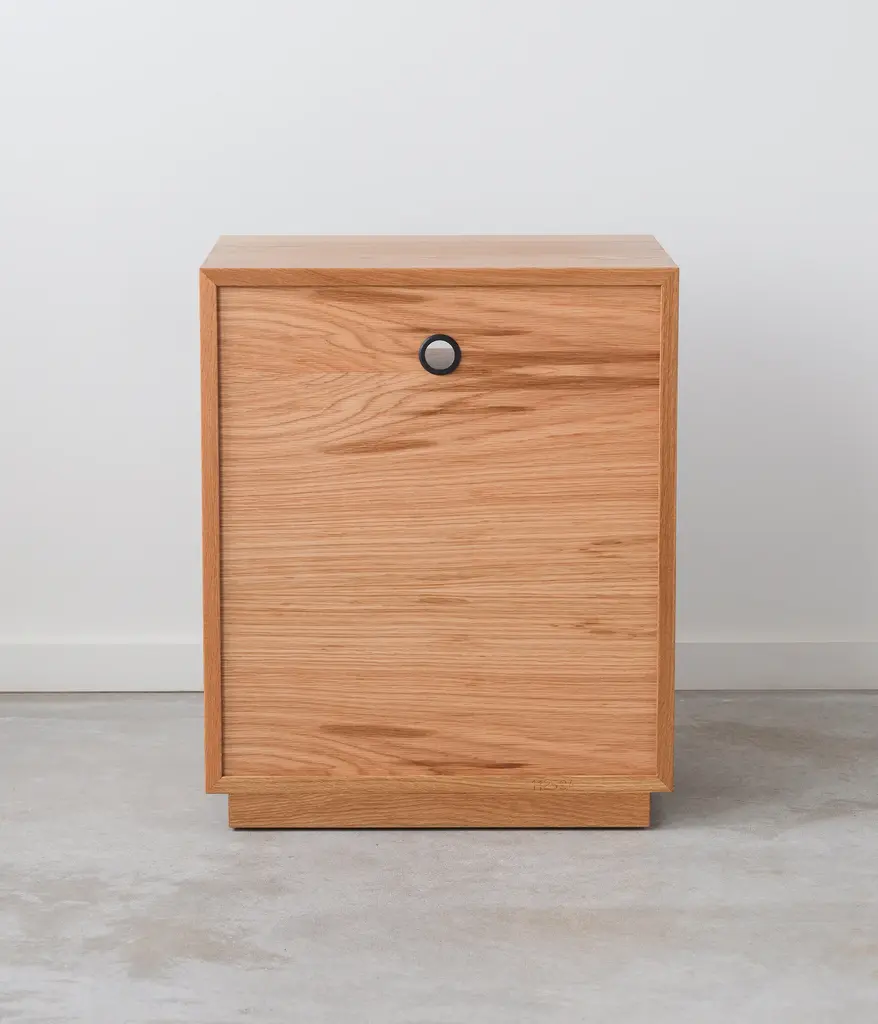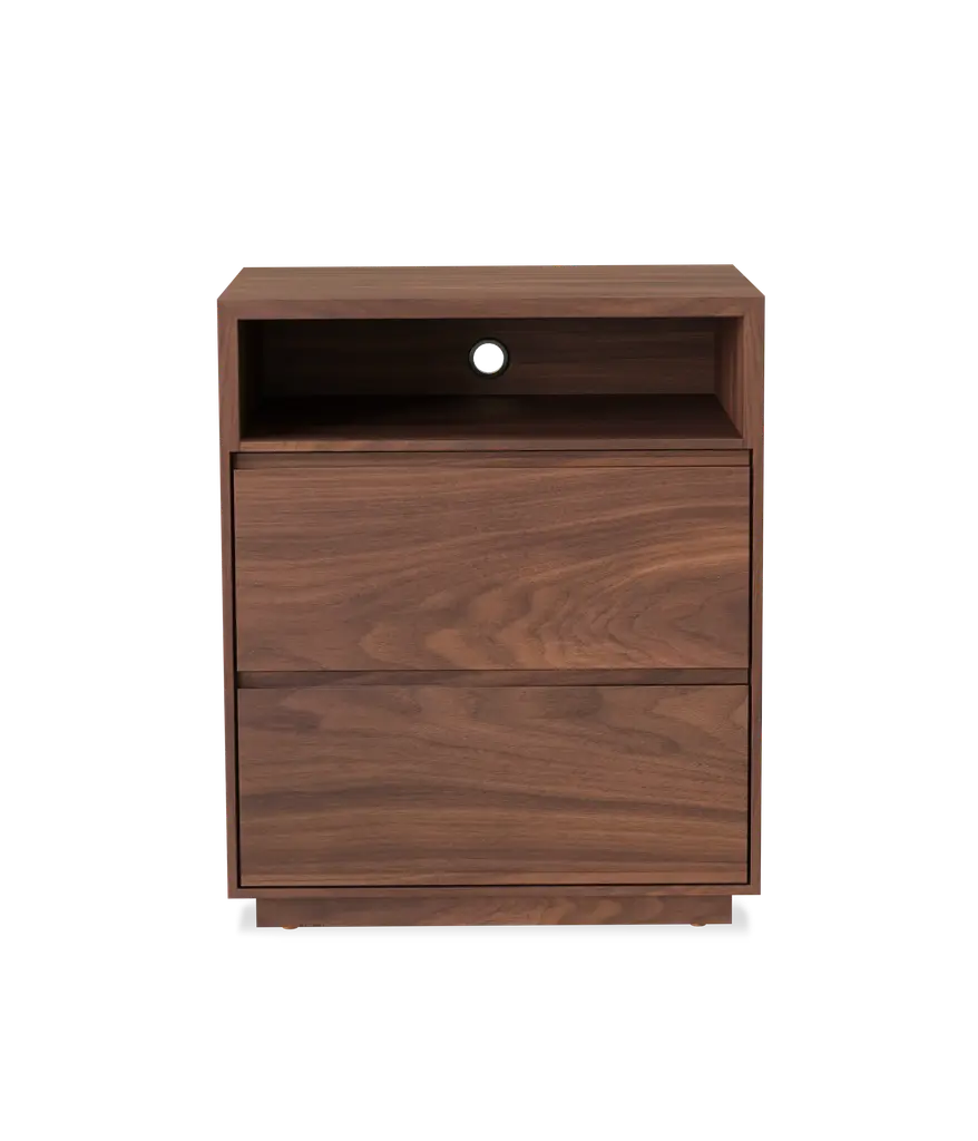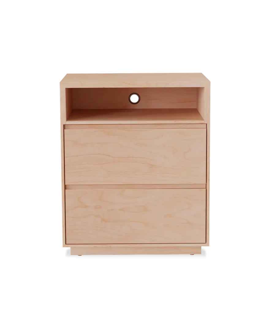 Our Douglas Nightstand has a smaller footprint but is big on function. A shelf with a cord cutout allows electronics to be easily stashed away. The two dovetail drawers utilize under mount, soft close slides.