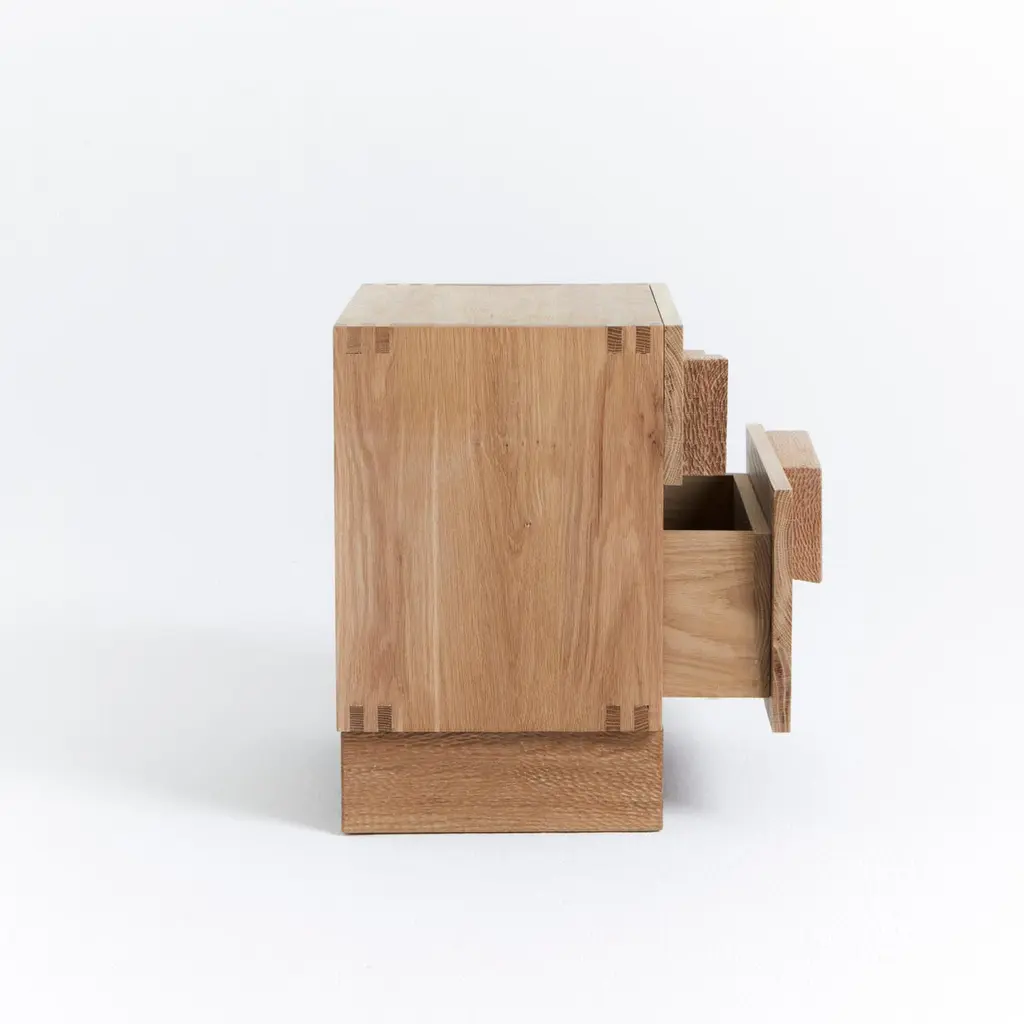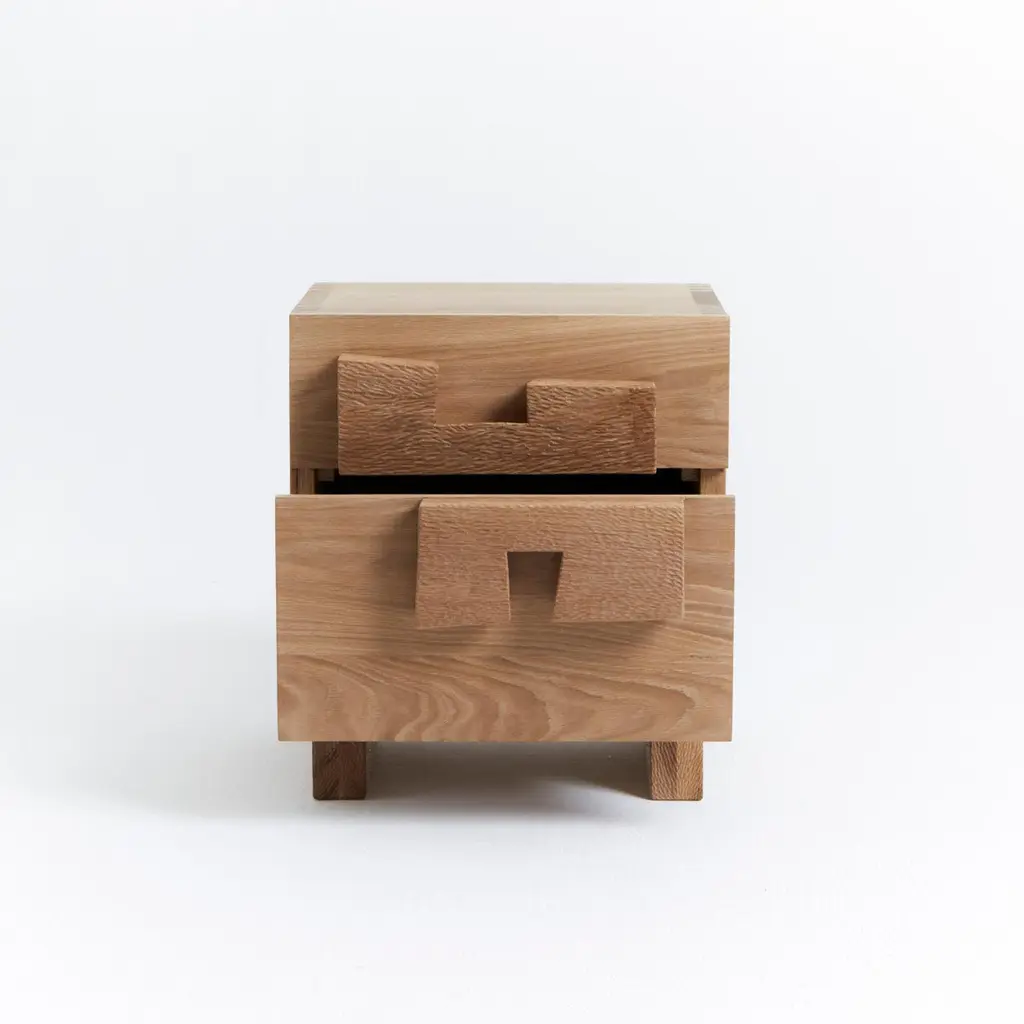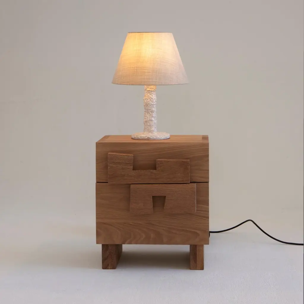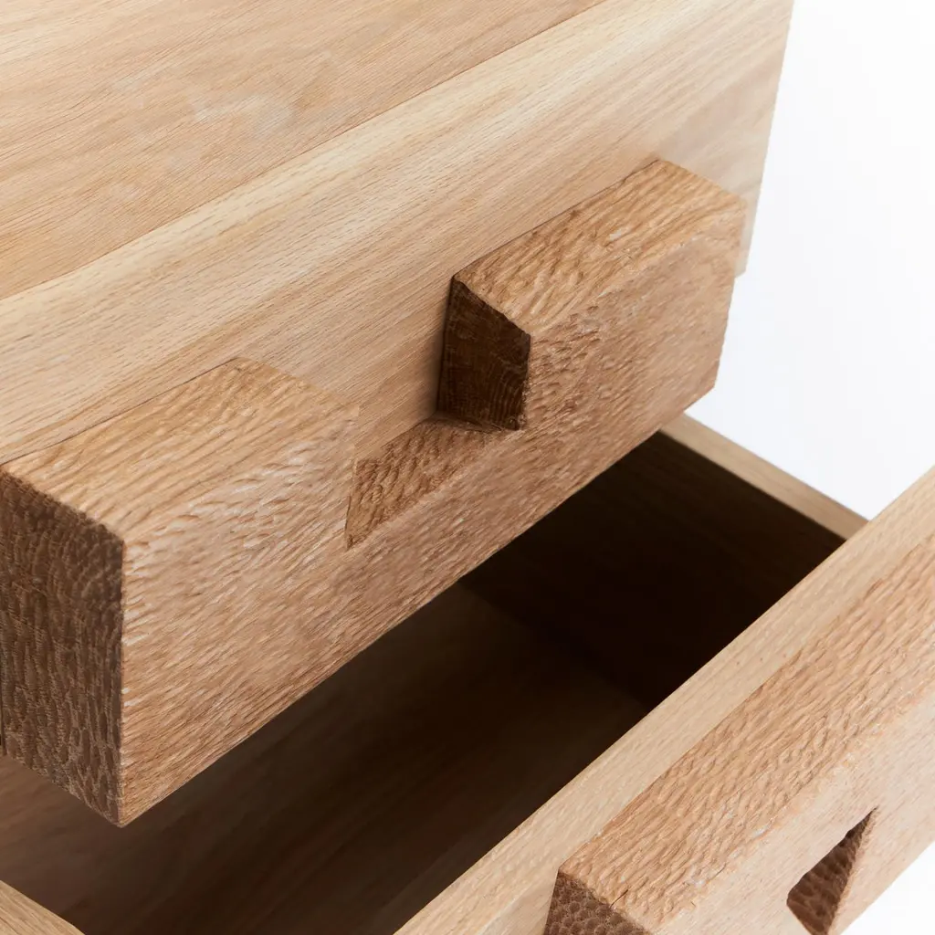 Douro Bedside TableDesigned by Project 213A in 2023Handmade by skilled artisans in solid oak. The bedside table features two drawers with handles and legs decorated with a hand carved texture. Bespoke dimensions upon request.Production lead time: 6-8 weeks