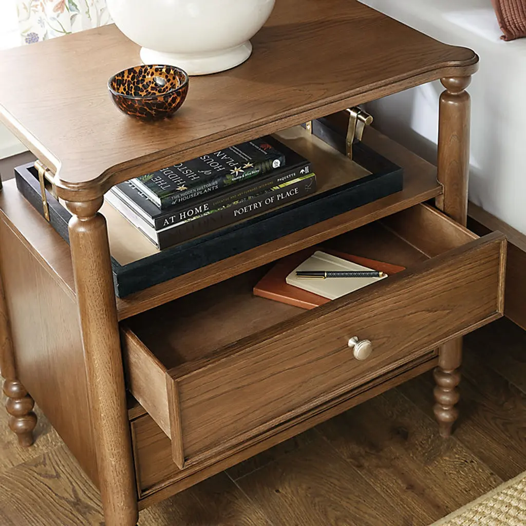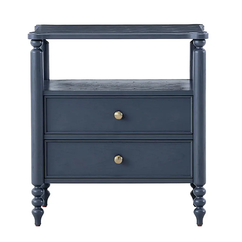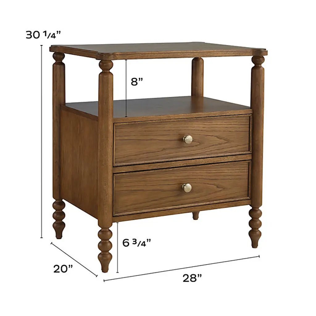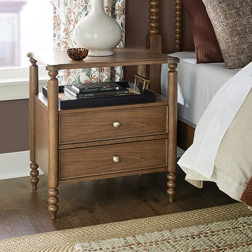Inspired by ornately carved English and Dutch pieces from the 16th and 17th centuries, American spool furniture became hugely popular in the mid 19th century and remains a classic decorator favorite. Our heirloom quality Dover Bedroom furniture collection captures that romantic cottage look in solid oak with beautifully turned spool details and your choice of hand applied finishes. The 2-Drawer Nightstand has a wide lobed top echoing the spool corner rails and an open space beneath for baskets or books. Two drawers open with classic brass knob pulls to offer generous hidden storage.Dover 2-Drawer Nightstand features: