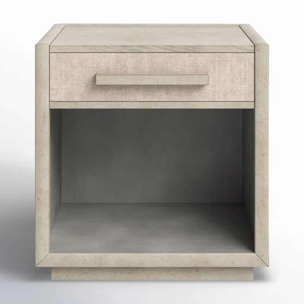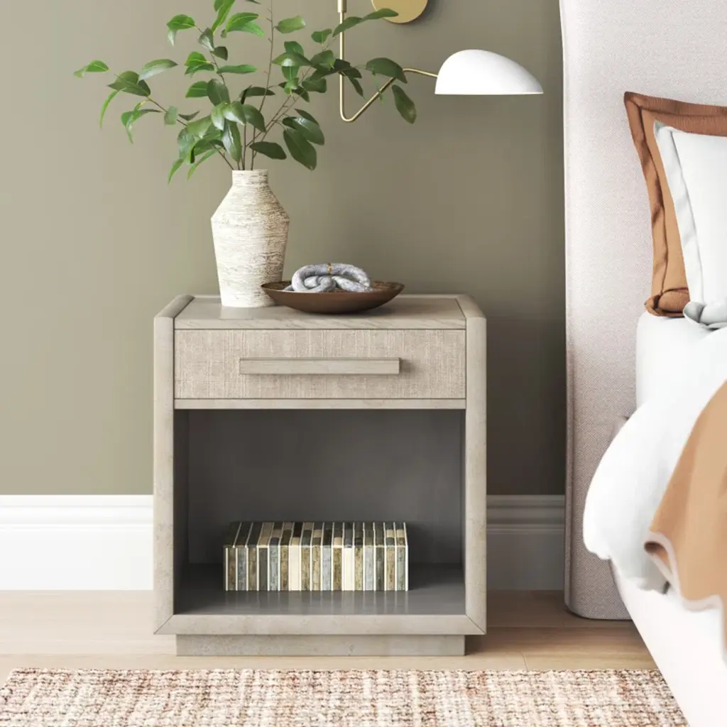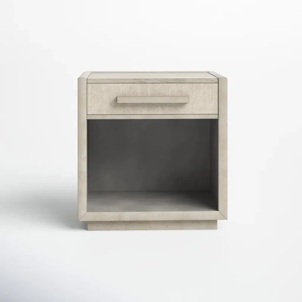 Small in size, big on style: This trending nightstand keeps all your bedside must-haves at arm's reach. It's crafted from solid wood in a beige finish that highlights the wood's grain, and it features a linen inlay on the front for a touch of texture. The single drawer offers out-of-sight storage for journals and charging cables, while the lower cubby is just right for displaying books and decor. Best of all, this piece arrives fully assembled, so you can mix and match it with your decor right away.