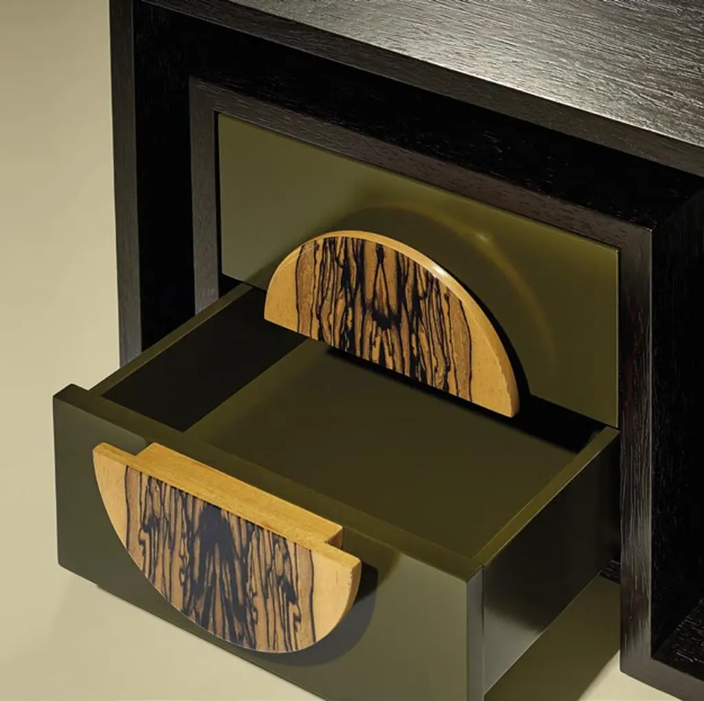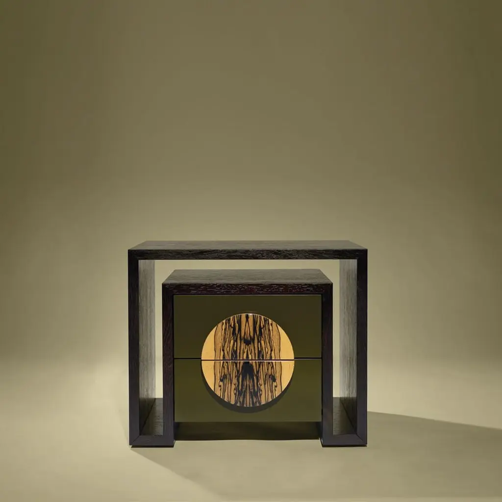 Bedside table in wange wood, lacquered drawers and Royal ivory knot.Bespoke / CustomizableIdentical shapes with different sizes and finishings.All RAL colors available. (Mate / Half Gloss / Gloss)