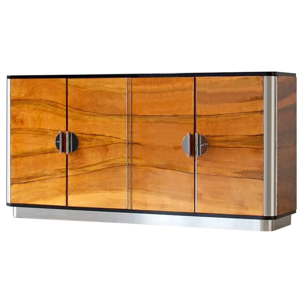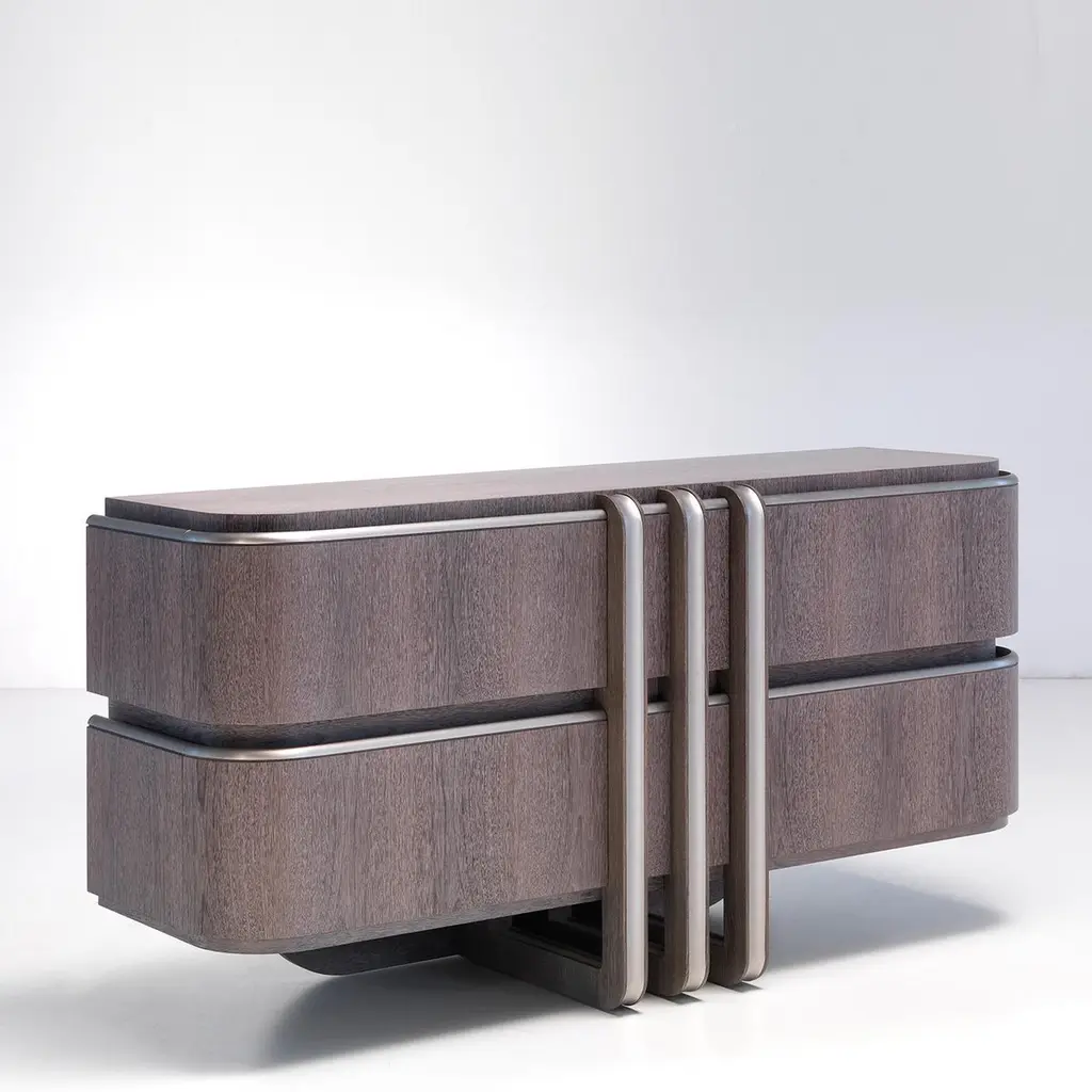 The bold yet harmonious lines characterizing this imposing nightstand exemplify the most exquisite modern taste. The structure is crafted of durmast and sucupira, precious woods turning this piece in a rare object of functional decor capable of elevating the aesthetic of any bedroom. The luminous brass inserts accenting the design's borders and running vertically its drawers add further value to the nightstand.