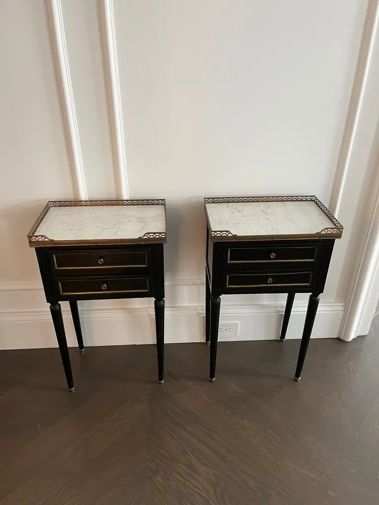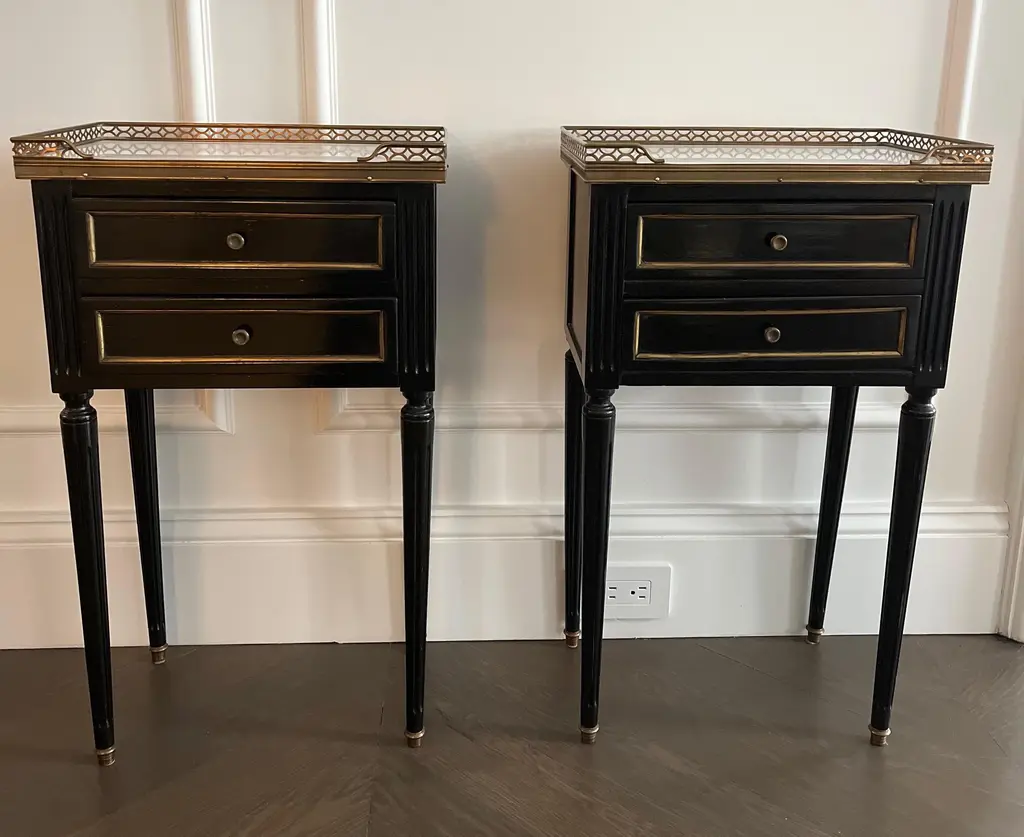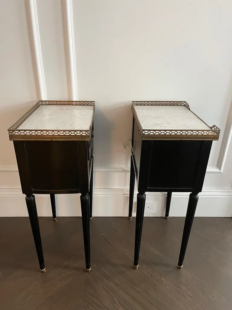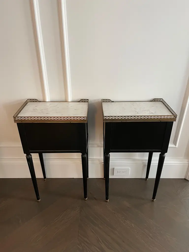 Rare, beautiful, French neoclassical nightstands in black ebony wood, white with mild gray vein marble with gilded gold. Two drawers. Condition is great, minor touches show age and patina. Price is per nightstand and must be purchased as 2.