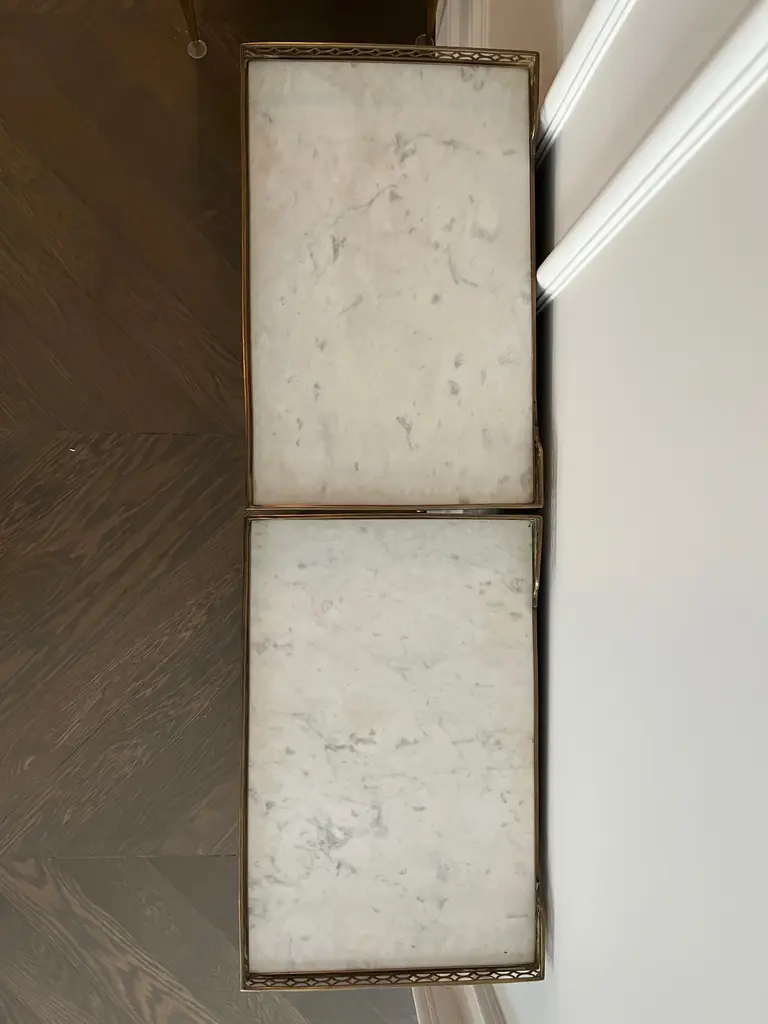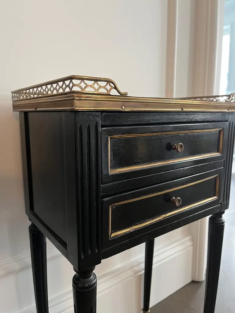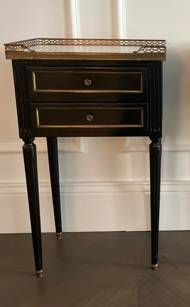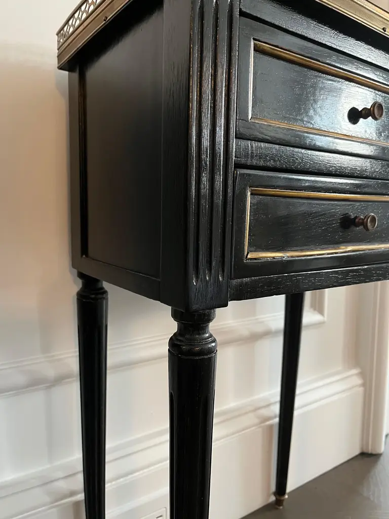 Rare, beautiful, French neoclassical nightstands in black ebony wood, white with mild gray vein marble with gilded gold. Two drawers. Condition is great, minor touches show age and patina. Price is per nightstand and must be purchased as 2.